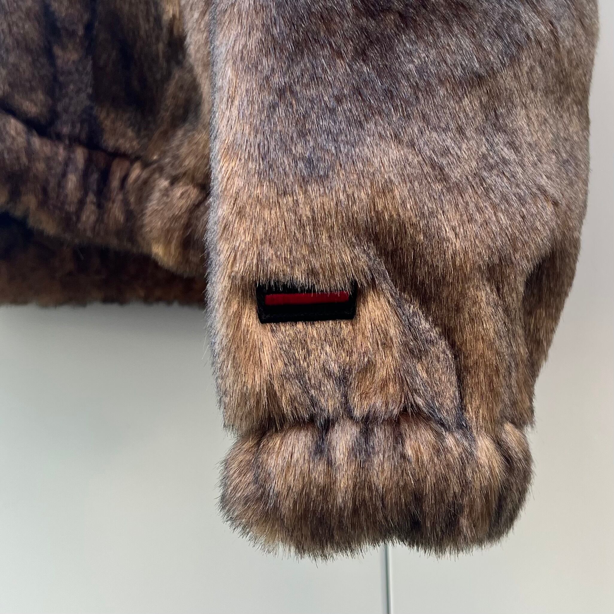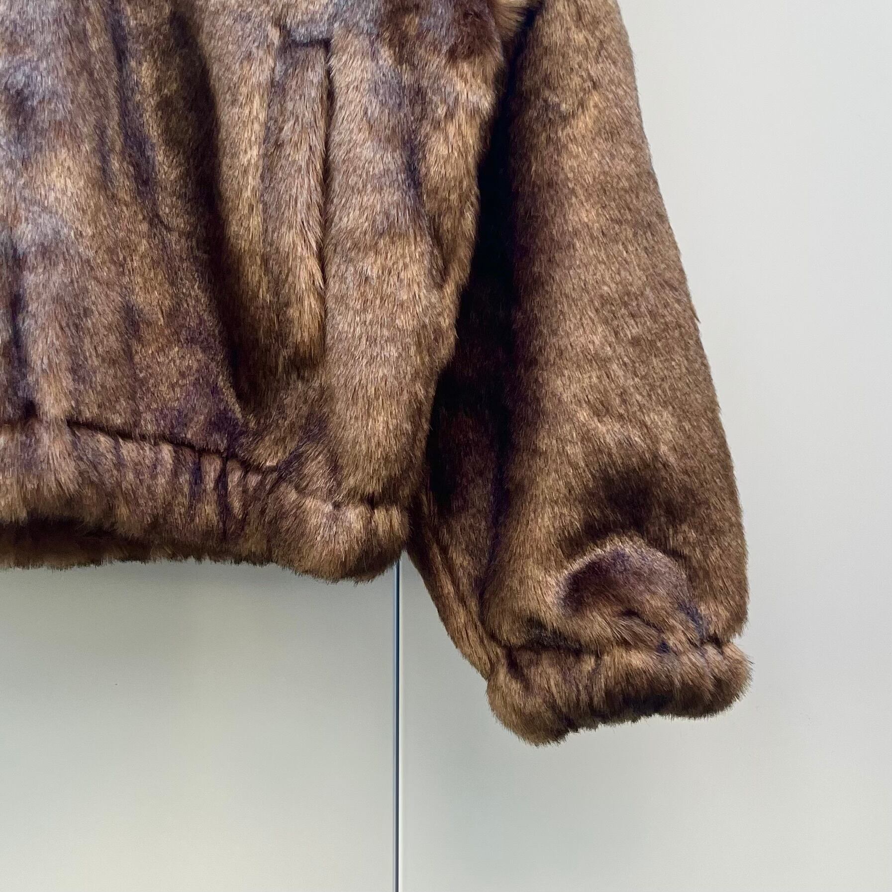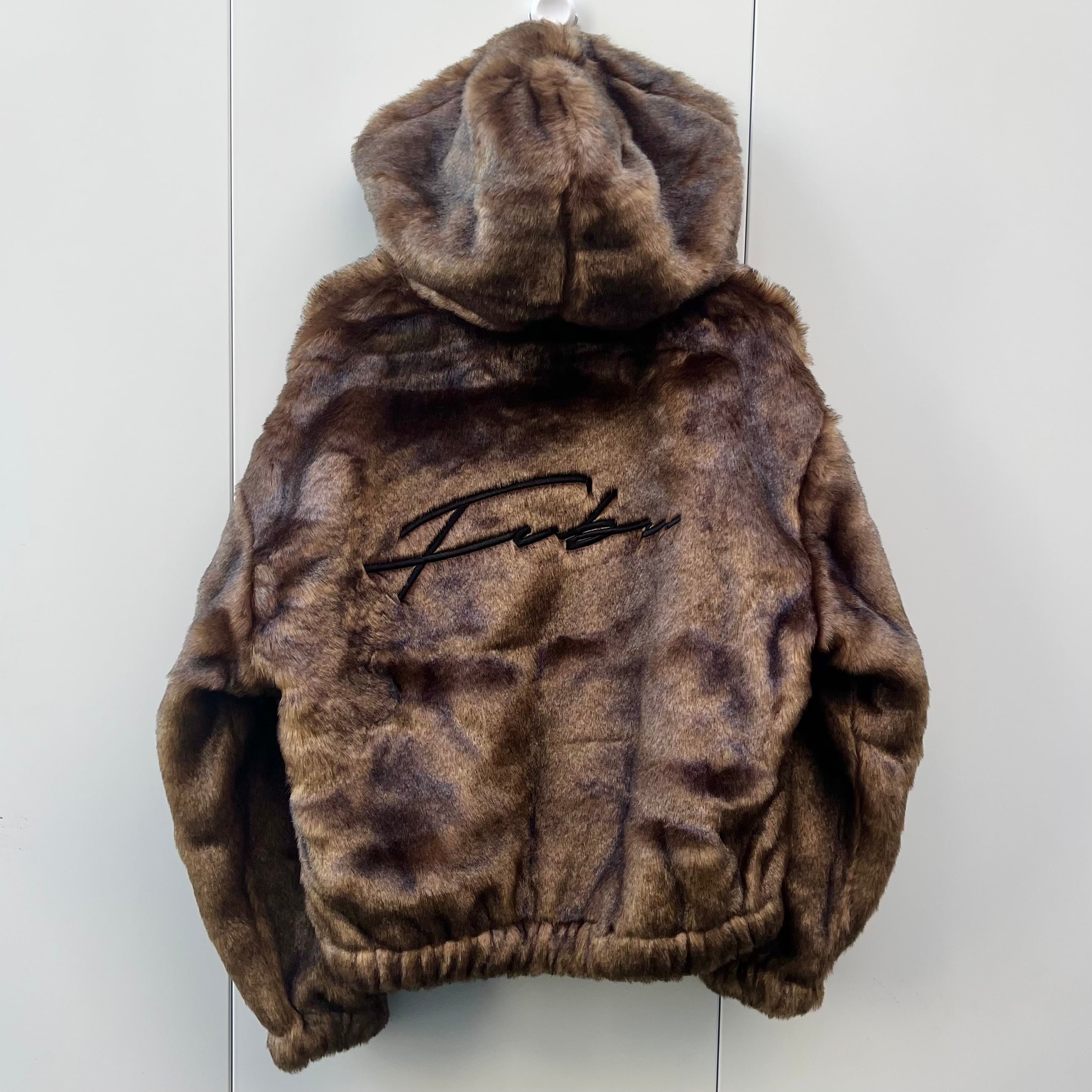 ブラウン系フェイクファー、バックに大きくとロゴ刺繍、ロゴマークプレートのジッパースライダーを使用したデザインです。