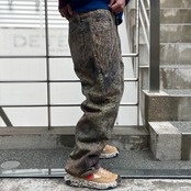 カモフラージュの総柄プリント、ロゴ入りボタン、5ポケット型のシンプルデザインです。