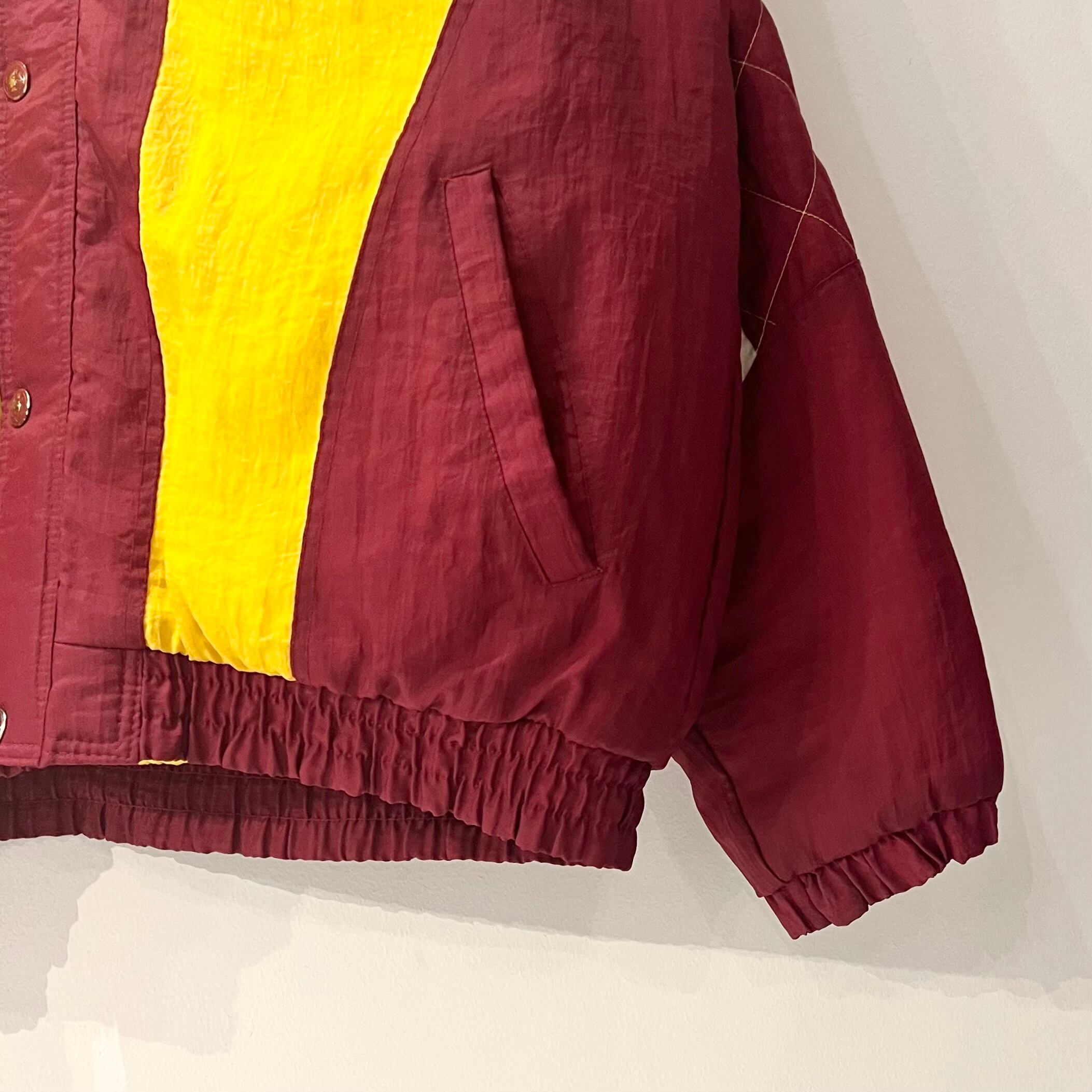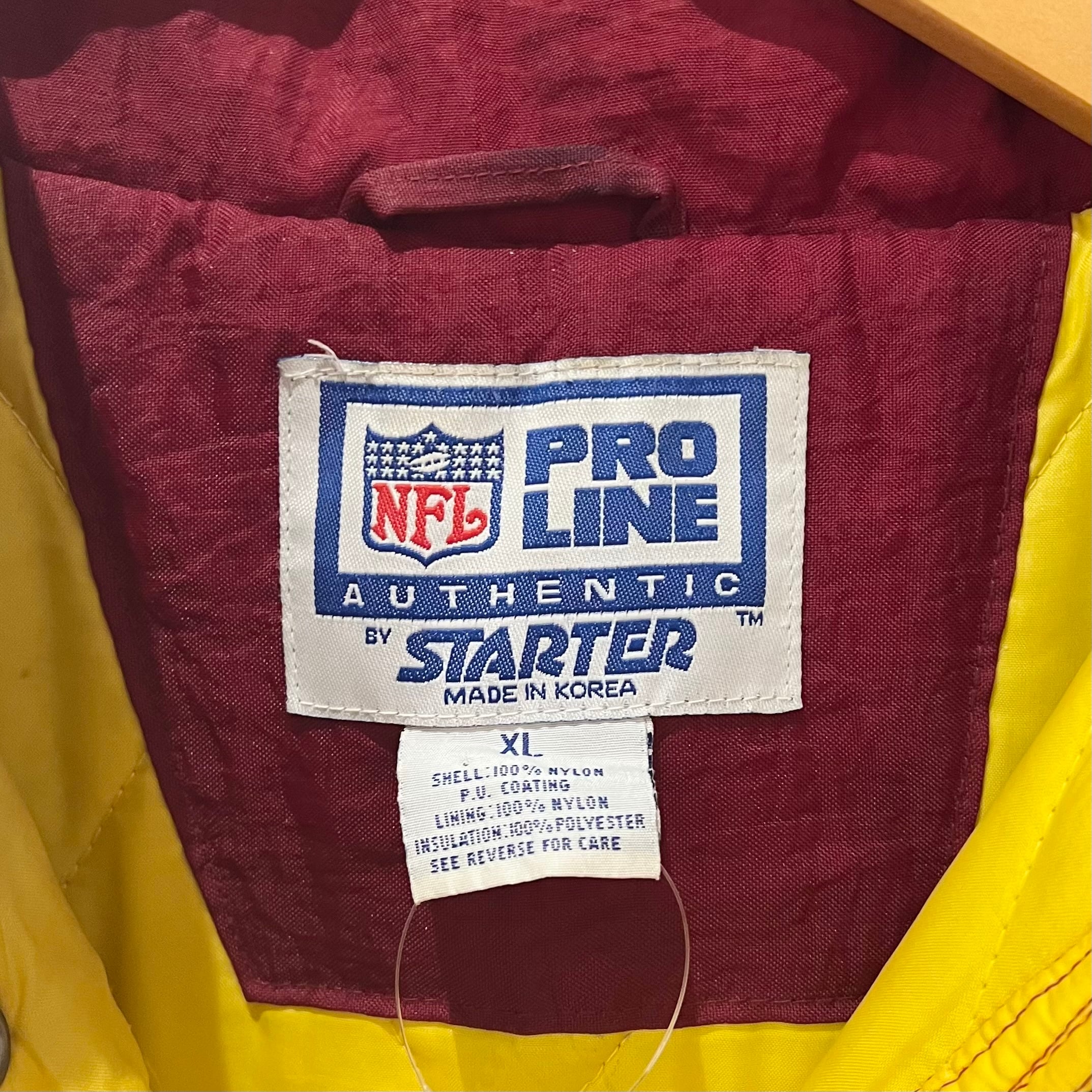 バーガンディxイエローxホワイトナイロン素材、左胸にREDSKINSロゴとロゴマーク刺繍、左袖にNFLロゴマーク刺繍、先にStarterロゴマーク刺繍、バックに大きくロゴマーク刺繍、ハンドウォームポケットの付いたスタンダードデザインです。