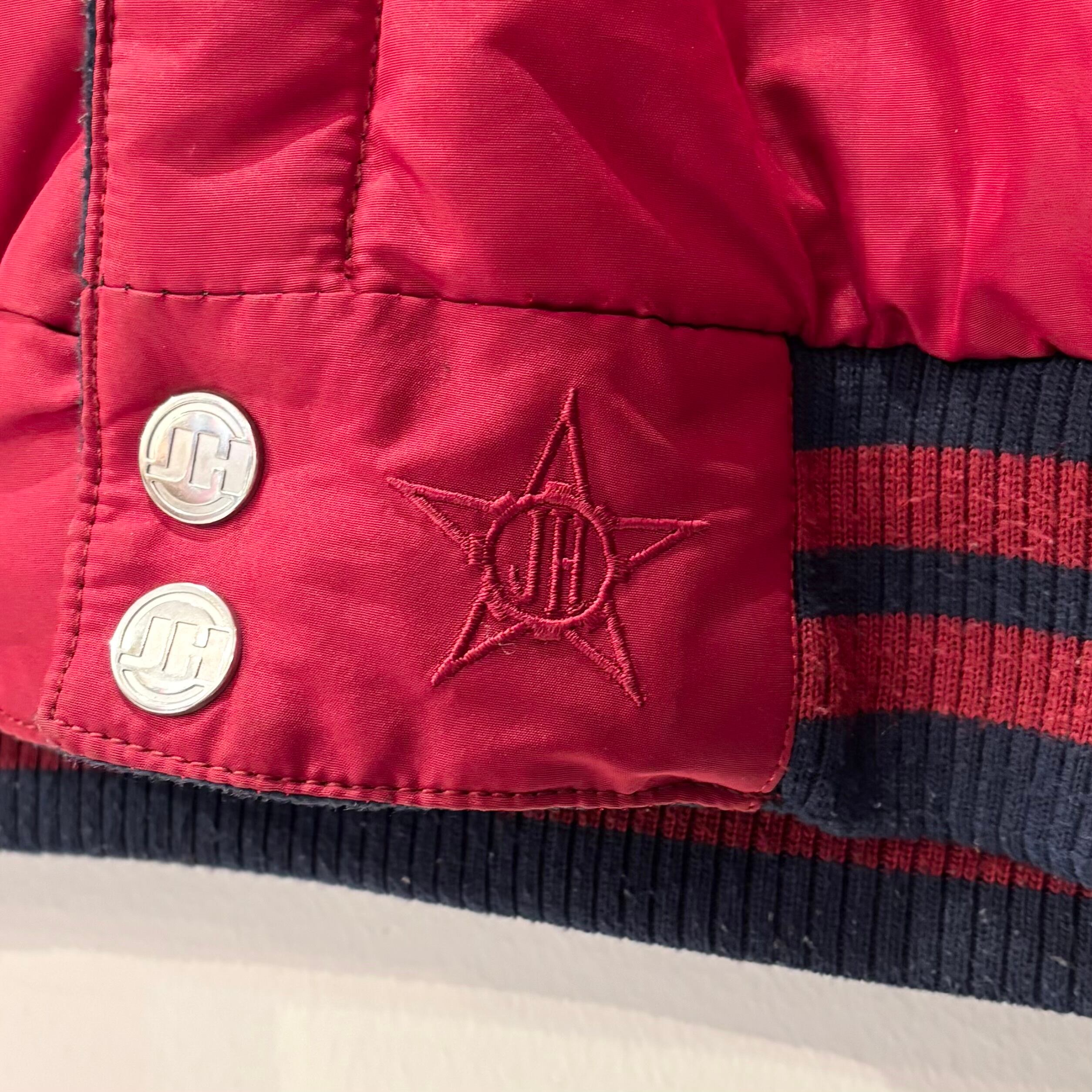 ネイビーxバーガンディのリバーシブル、両面、左胸にロゴマーク刺繍、ネイビー面のバックに大きくロゴマーク刺繍、両面にハンドウォームポケット、JHロゴ入りスナップボタンを使用したデザインです。