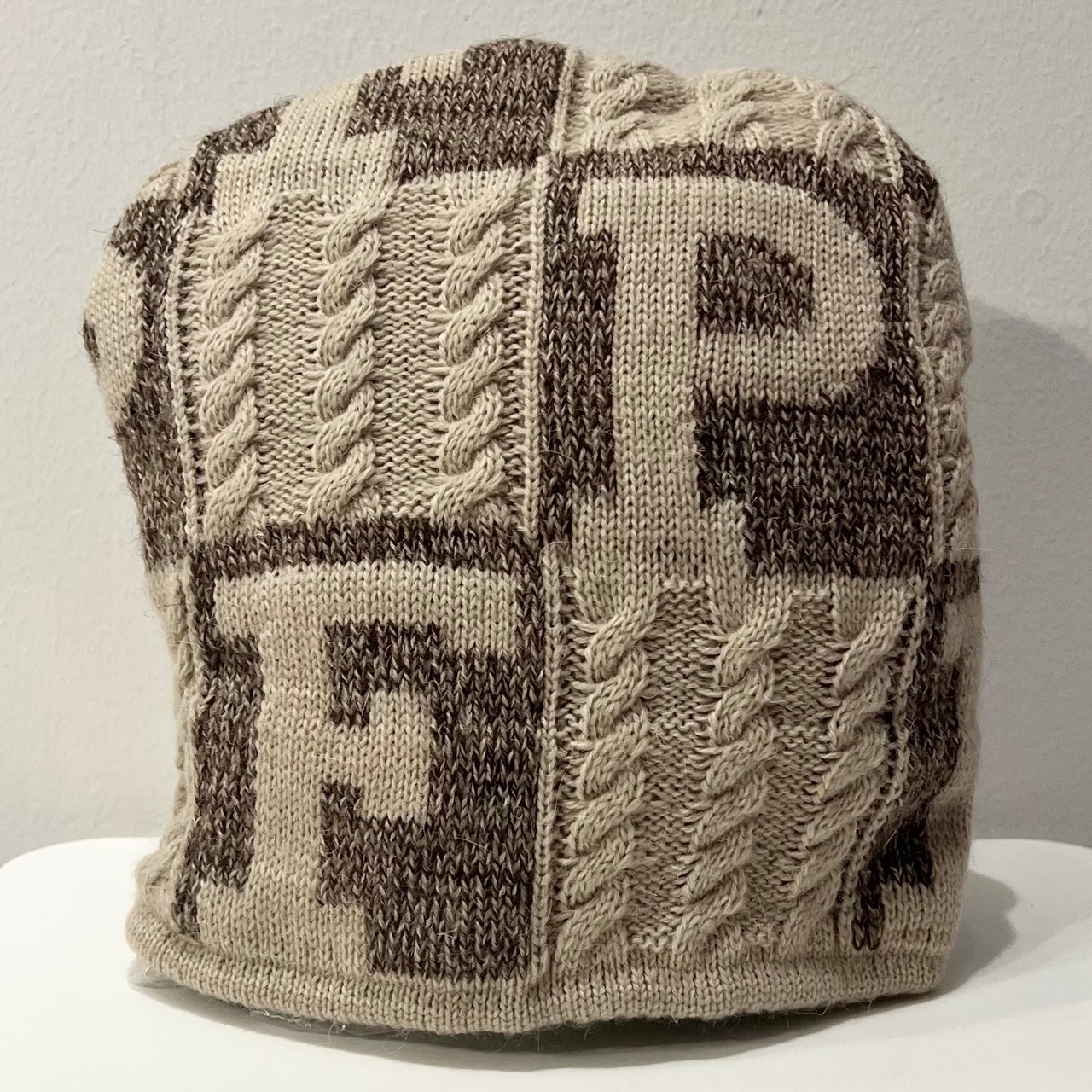 折り返しの無いビーニー型2種(ベージュ/ブラウン総柄、ベージュのケーブル編み/ブラウン)、折り返しのリブ型2種(ブラック、ベージュ)、アクリル系もしくはコットン系、折り返しの無い物と折り返しのある2デザインです。