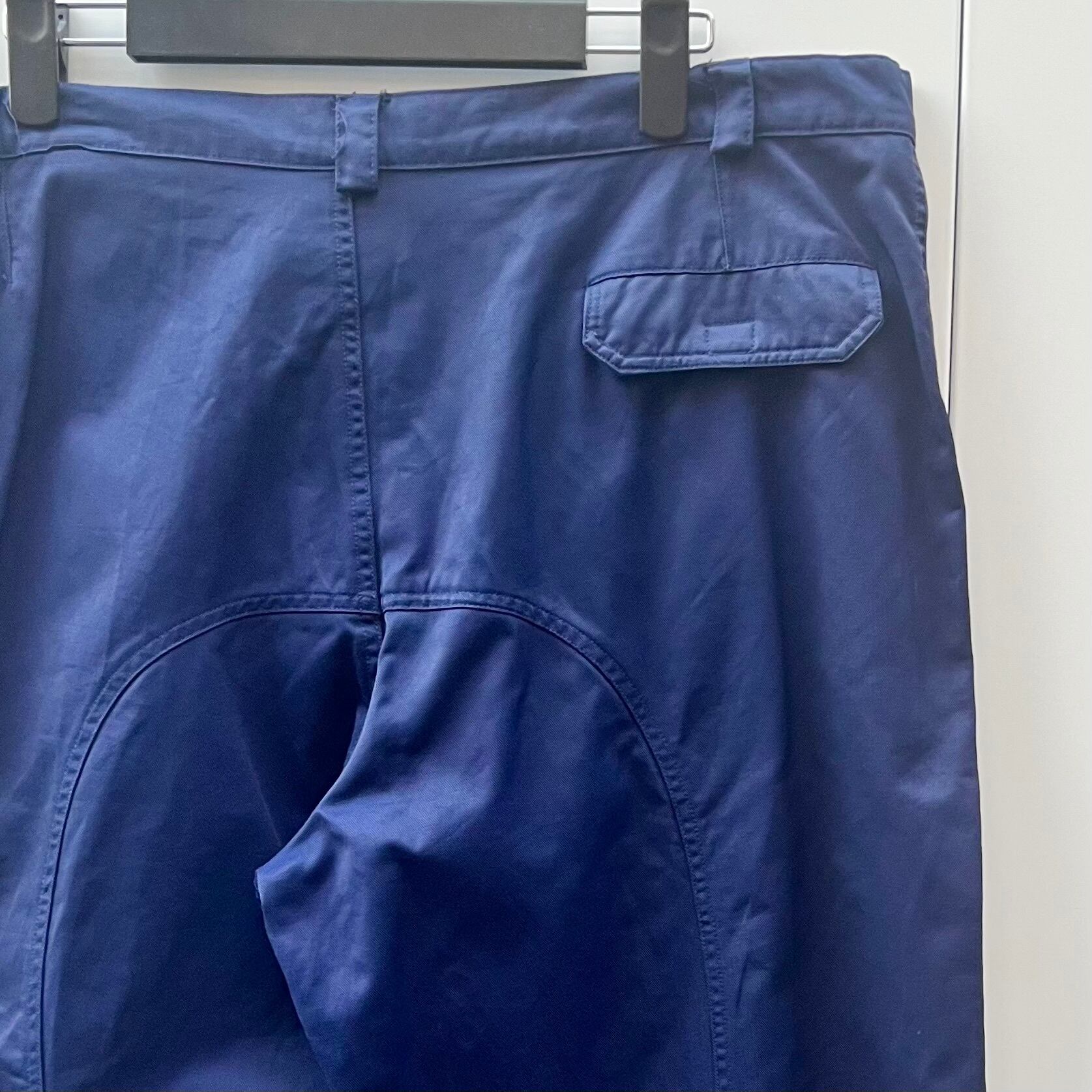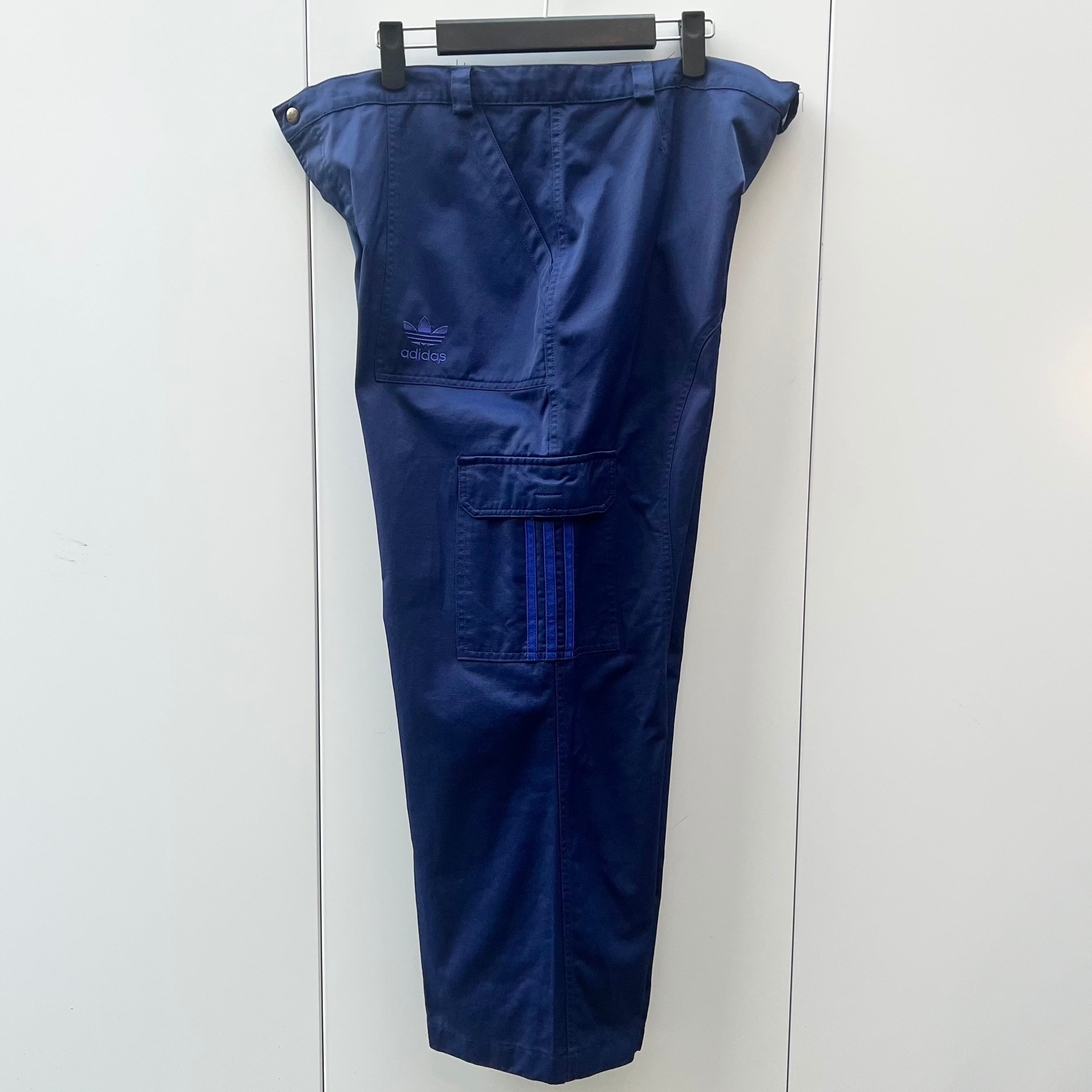 ネイビーのナイロン混素材、左ポケットにトレフォイルとadidas刺繍、左サイドにカーゴポケット、右バックポケット、ベルトループ付き、前開き、ハンドウォームポケットの付いたデザインです。
