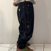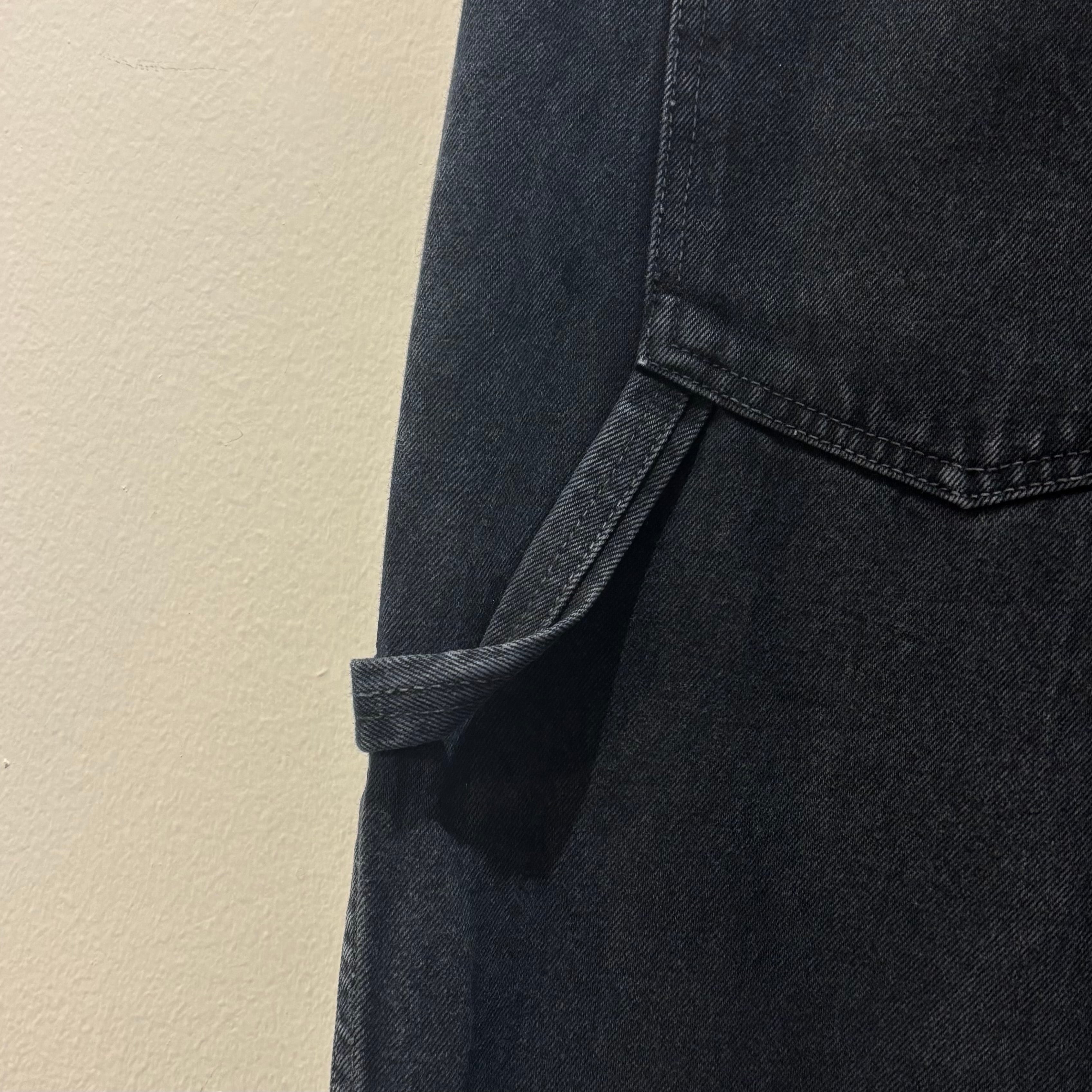 ウォッシュドオーバーダイブラックデニム、右バックポケットにネーム、右に5つのサイドポケット、左にハンマーループ、ロゴ入りボタン、リベットを使用したペインター型デザインです。