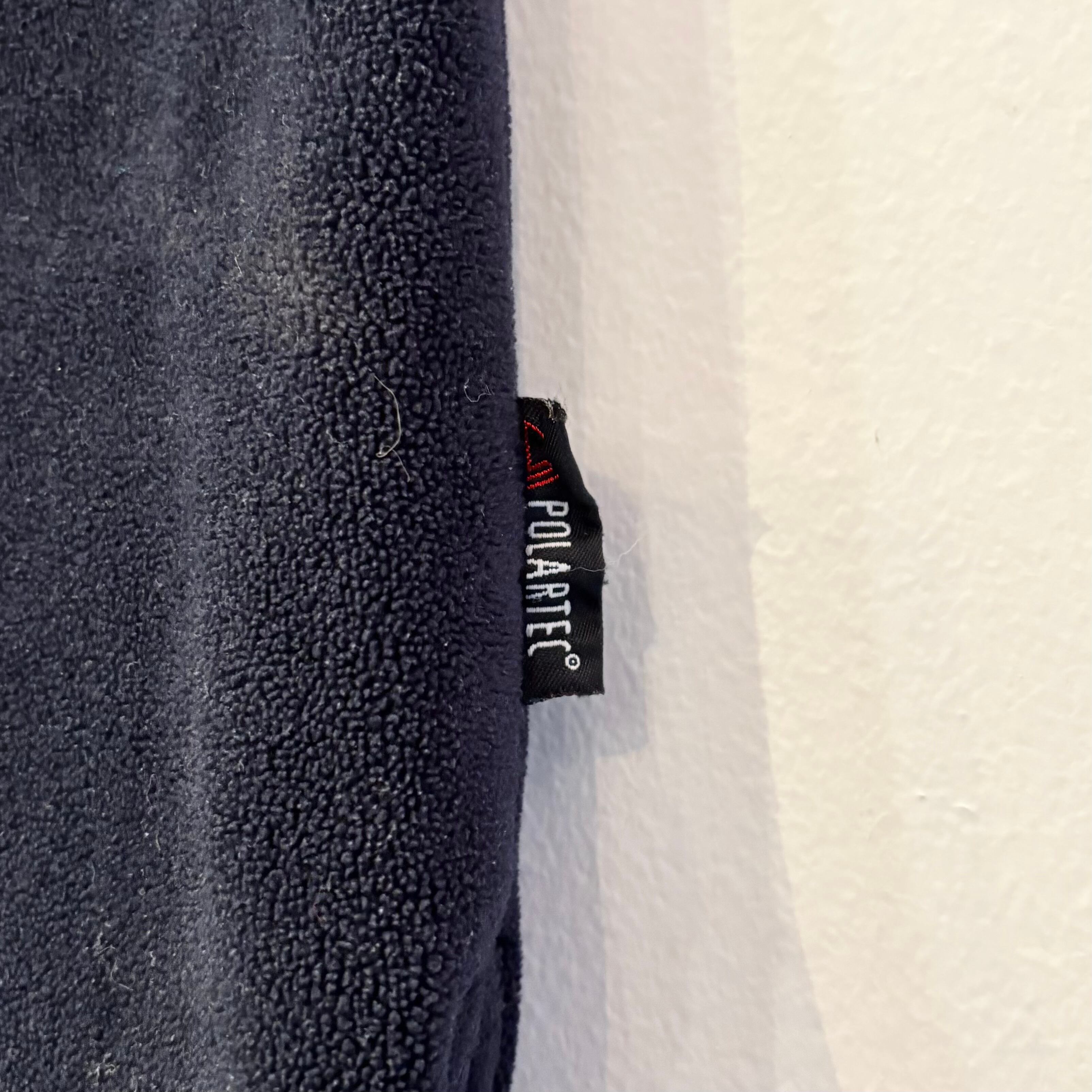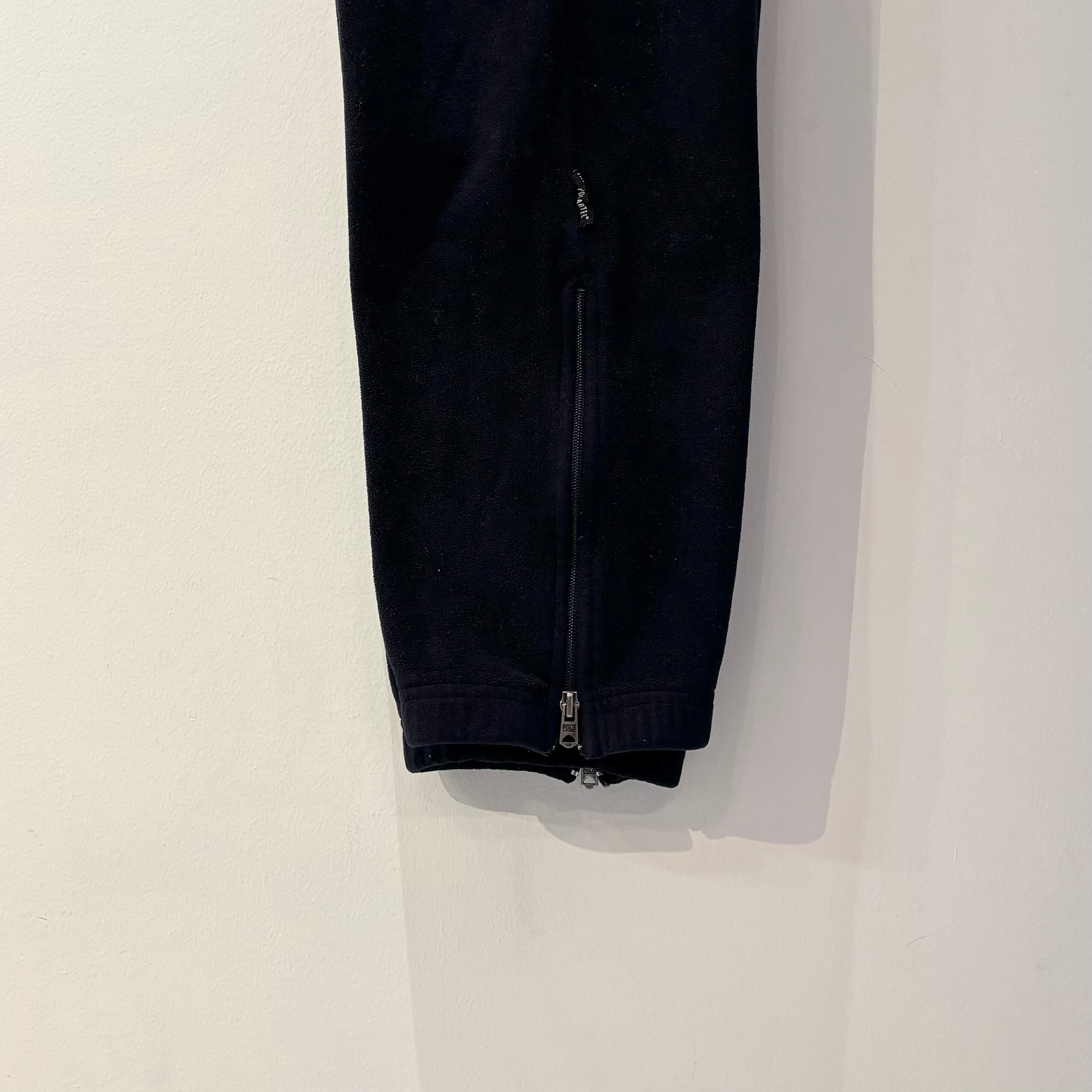 ネイビーのフリース、ポーラテック素材、ウエストの左にPOLOSPORTワッペン、ウエスト、ゴムと紐で調節、ハンドウォームポケット、裾の両サイドのジッパーで開閉するイージーパンツのデザインです。