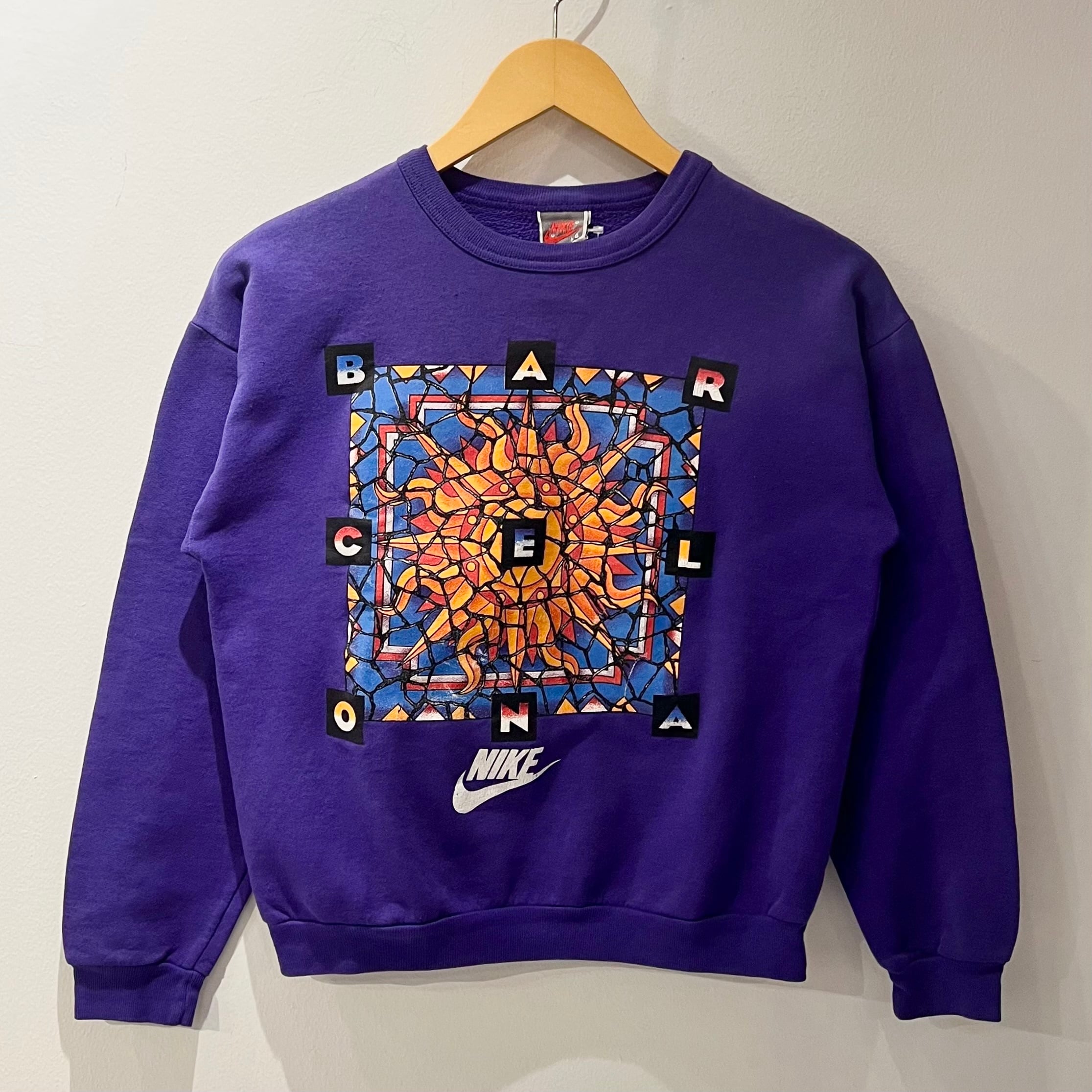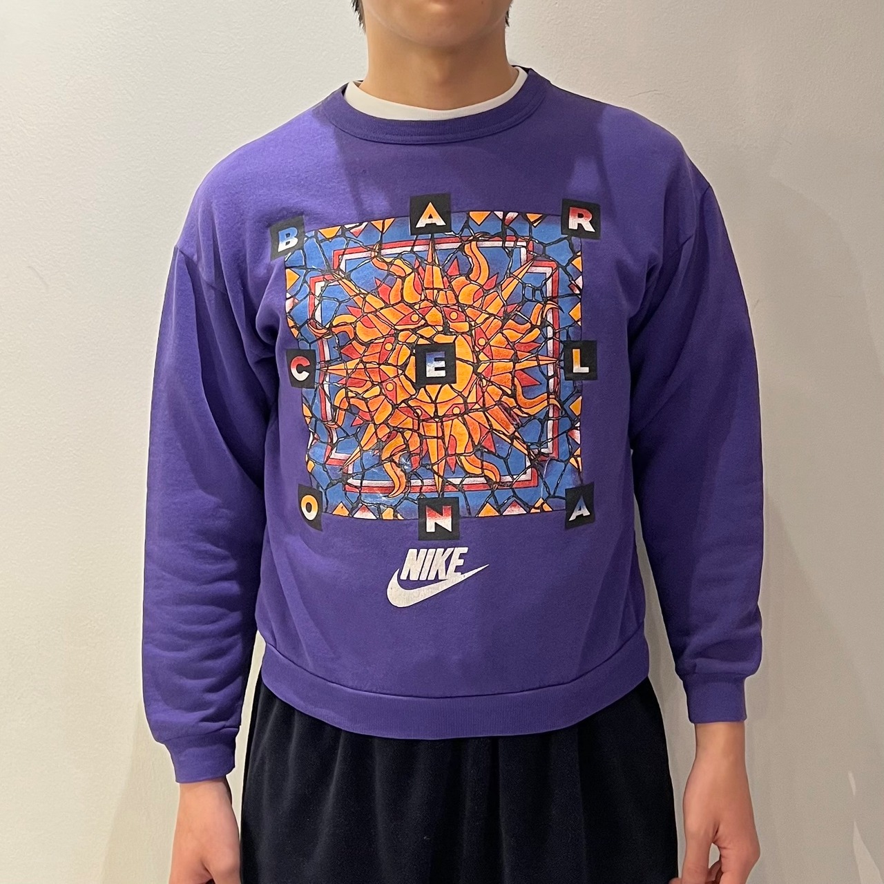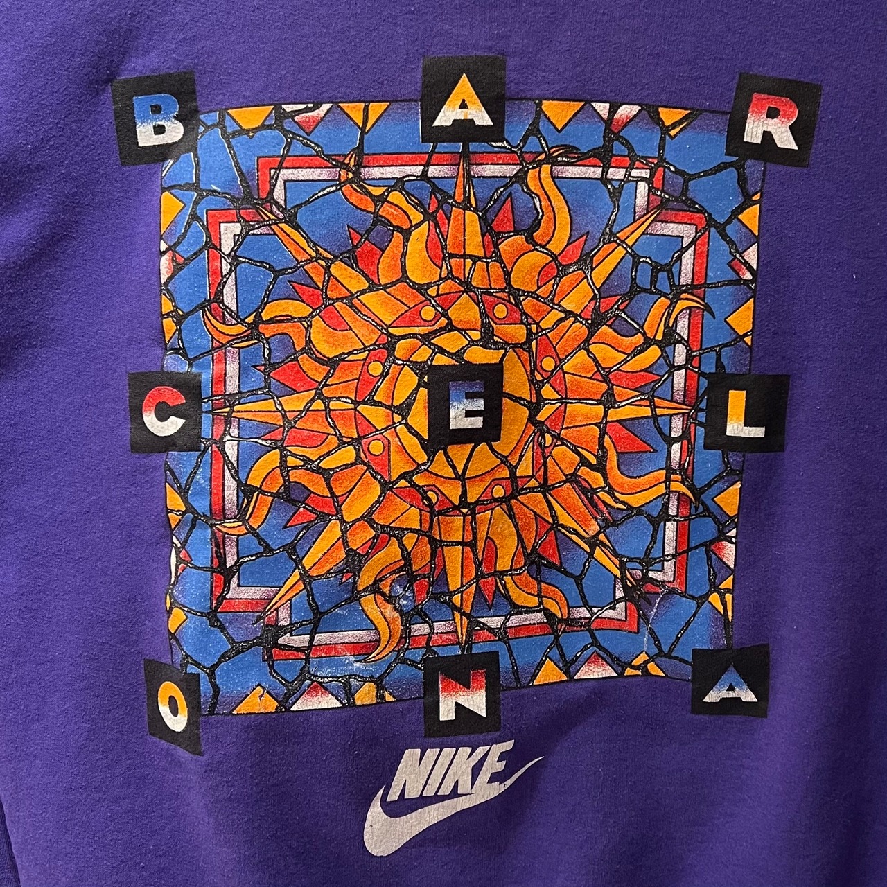 パープルの裏起毛素材、フロントにバルセロナオリンピックとナイキロゴのプリントが入るデザインです。