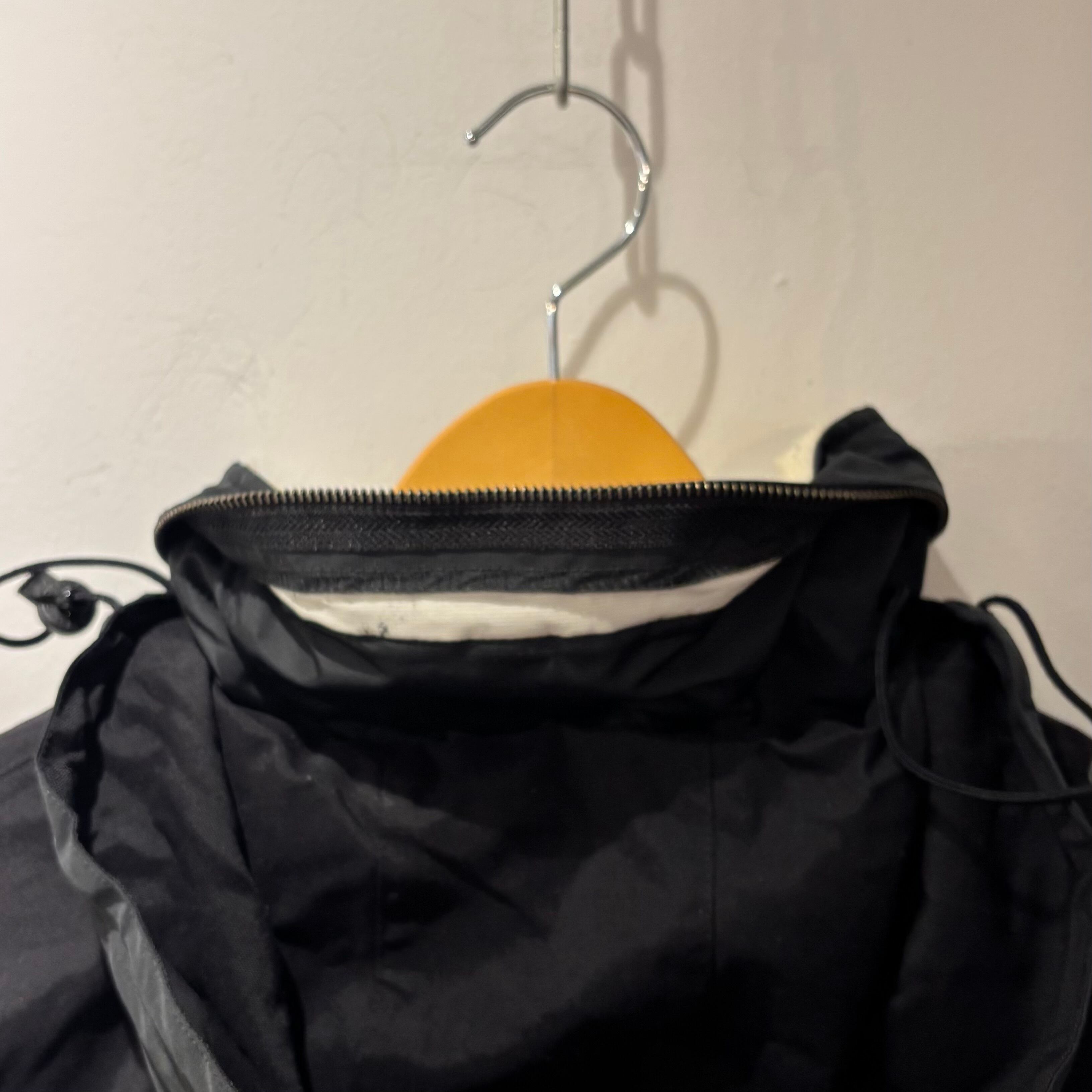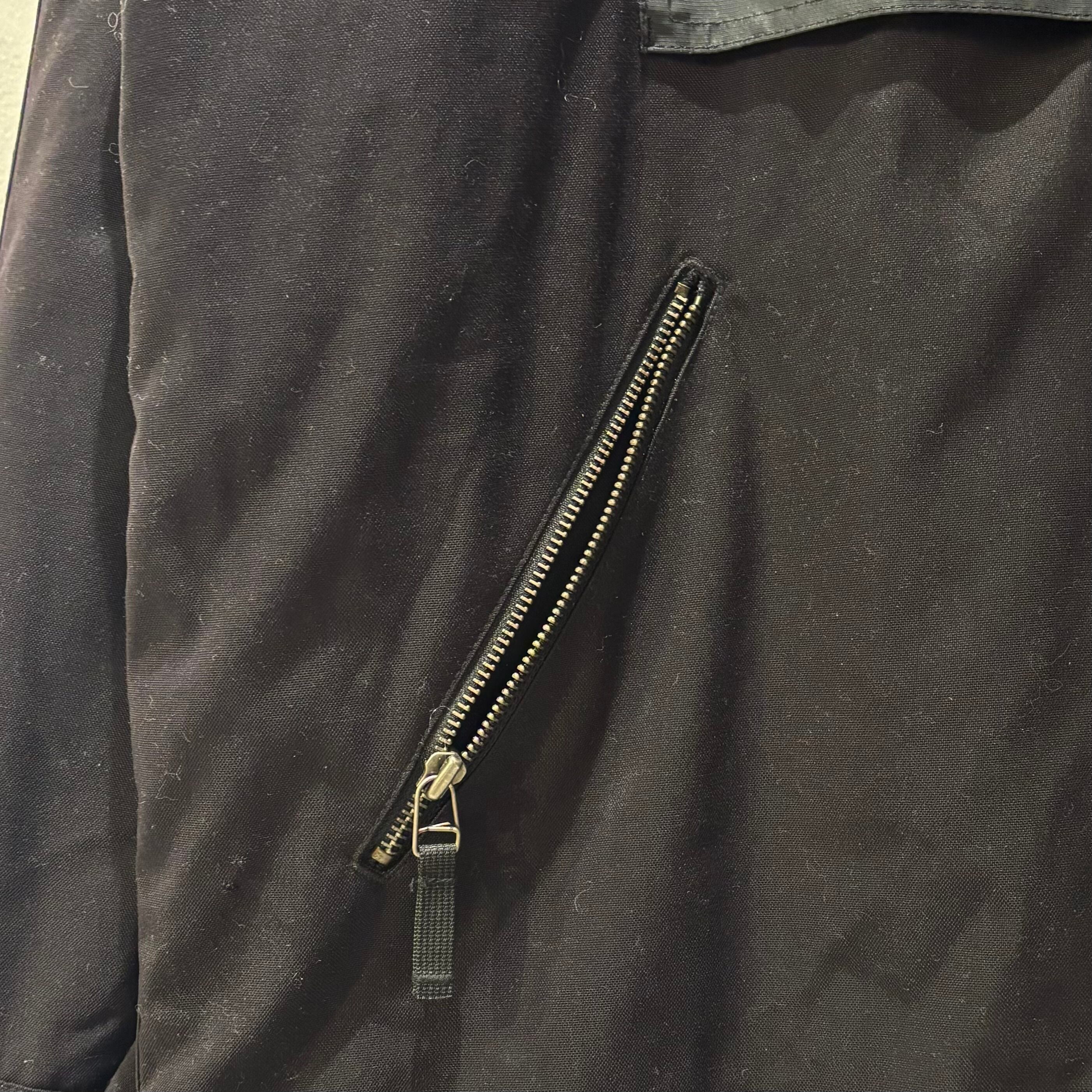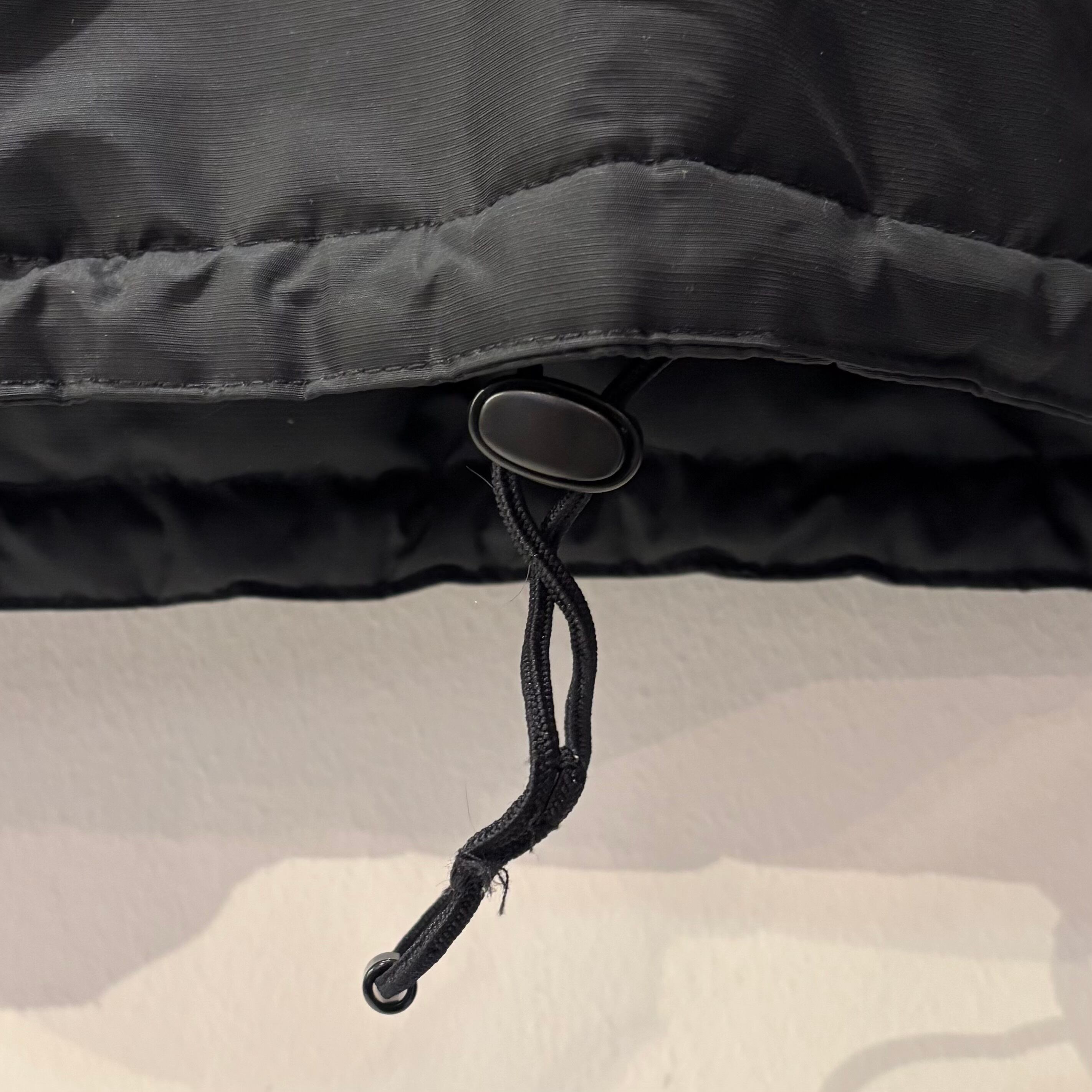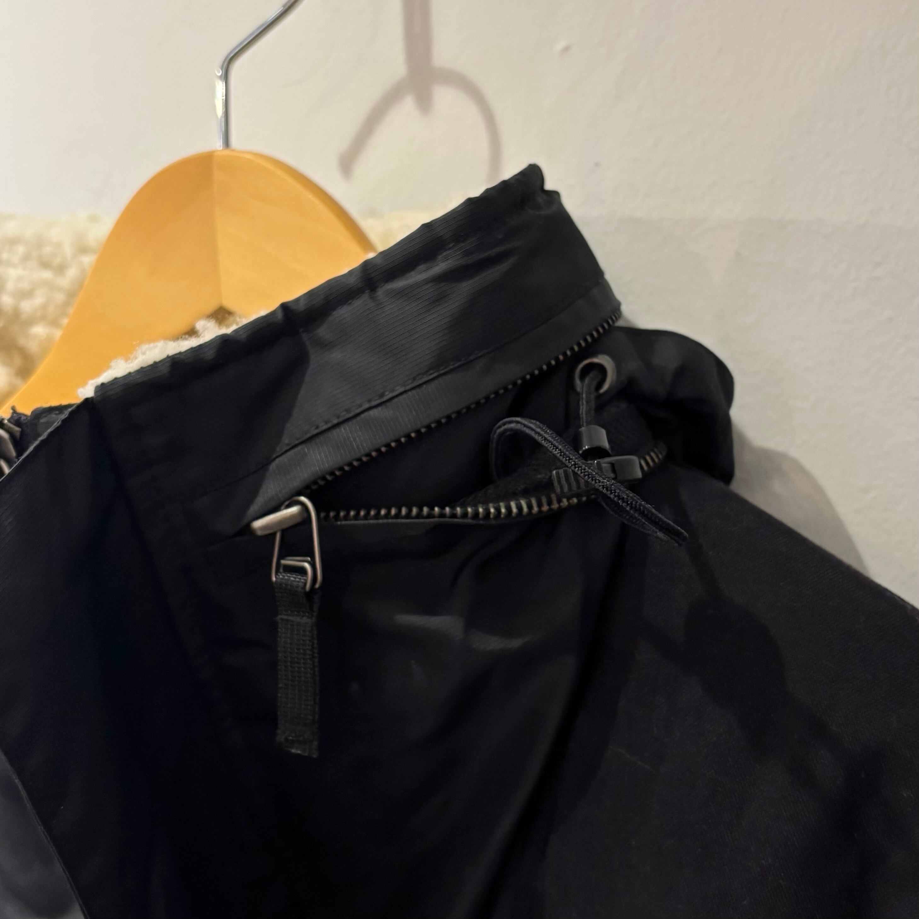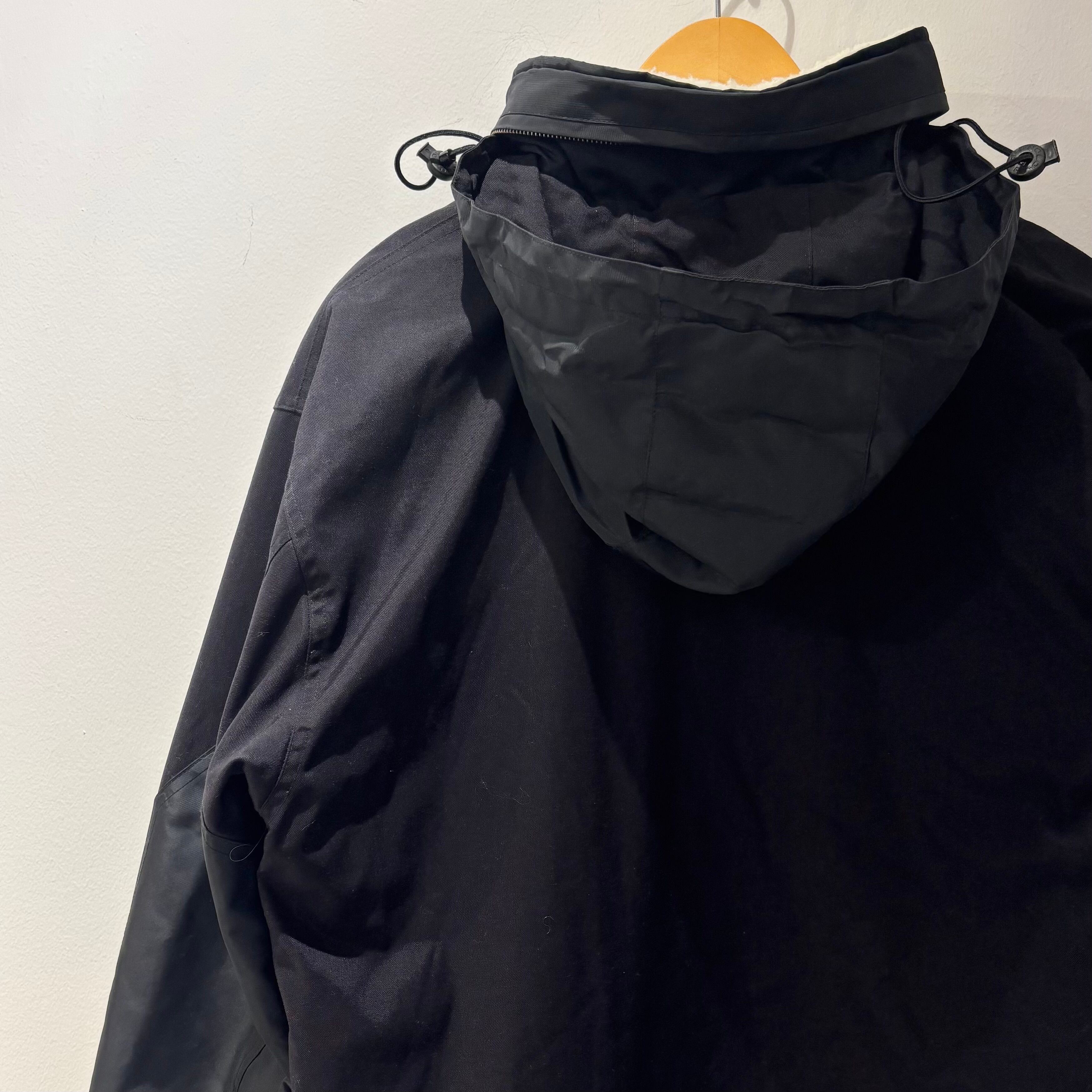 ブラックxブラック切り替え/ホワイトボア、左胸にロゴラバーワッペン、右裾にRL-67 POLOSPORTロゴ刺繍、フロントにジッパー付きポケット、ジッパー付きハンドウォームポケット、襟ボア、フード収納、裾にドローコードが入るデザインです。
