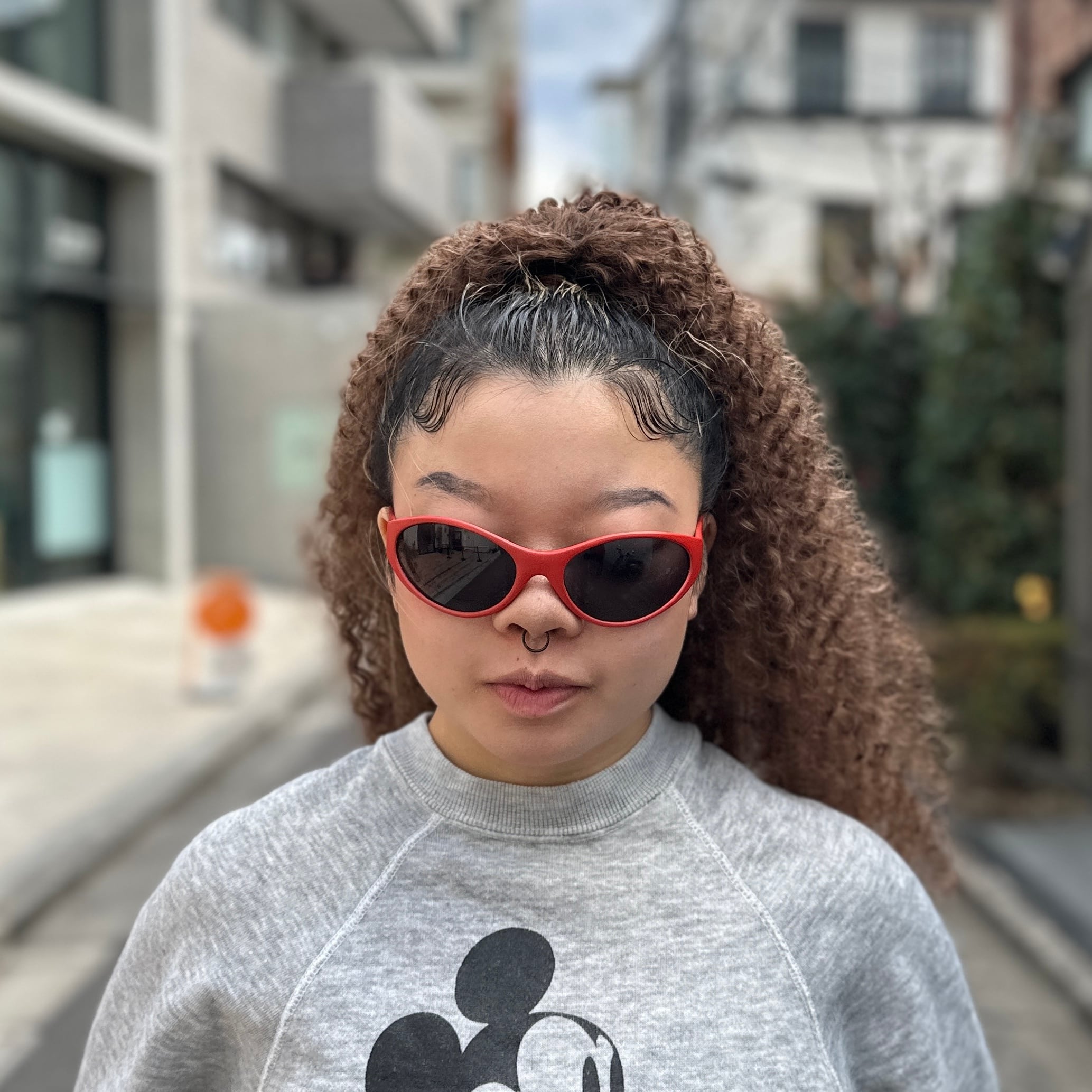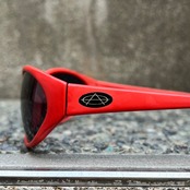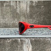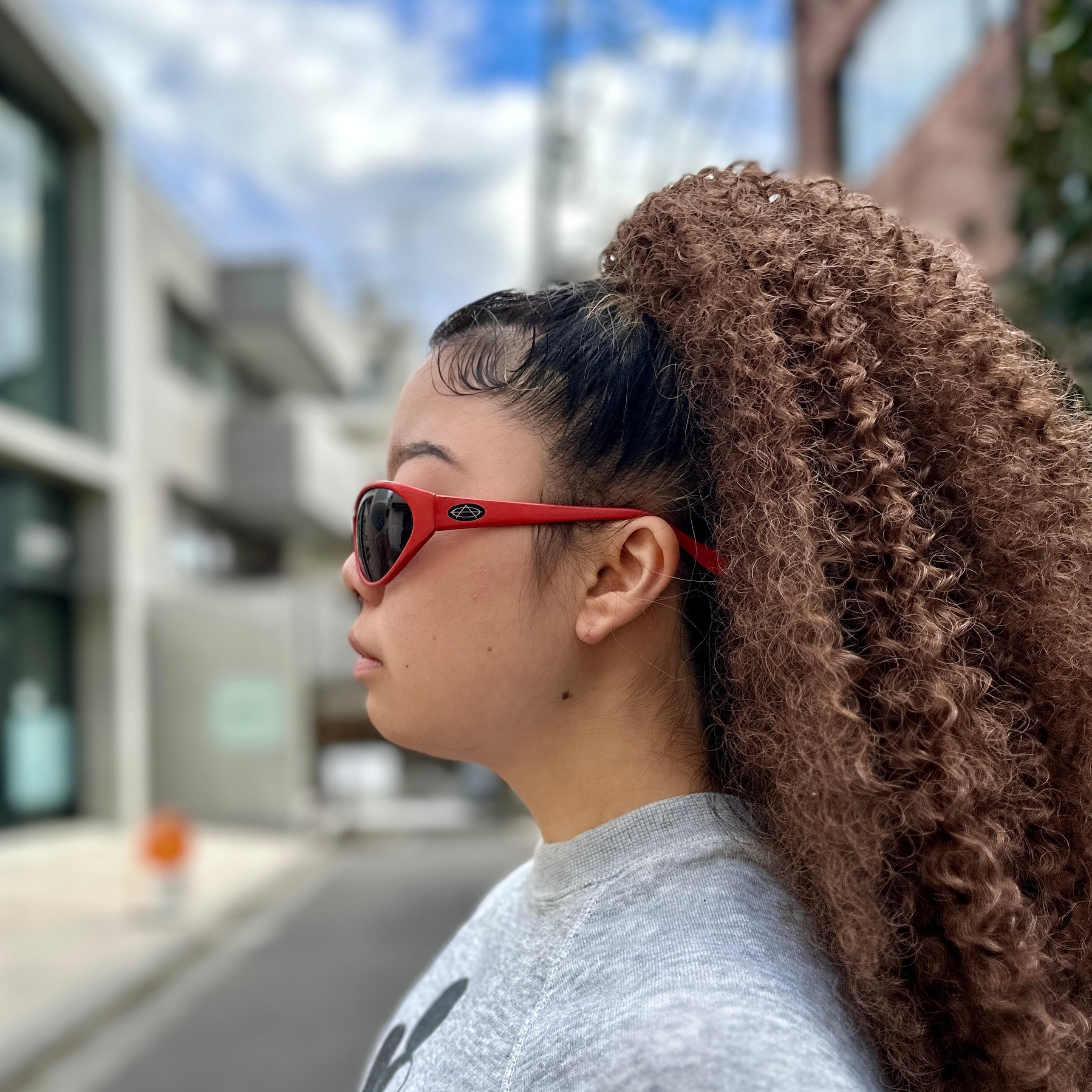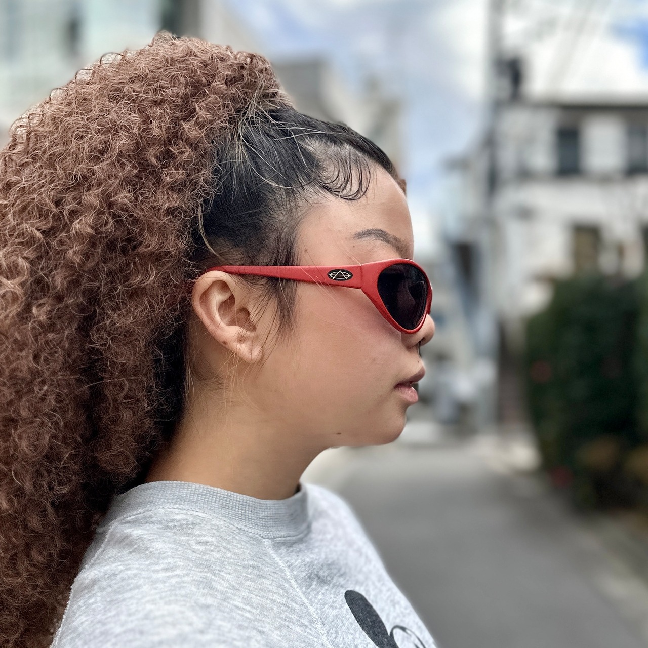 レッドフレームxブラックレンズ、両サイドにロゴプレート、顔にフィットするデザインです。