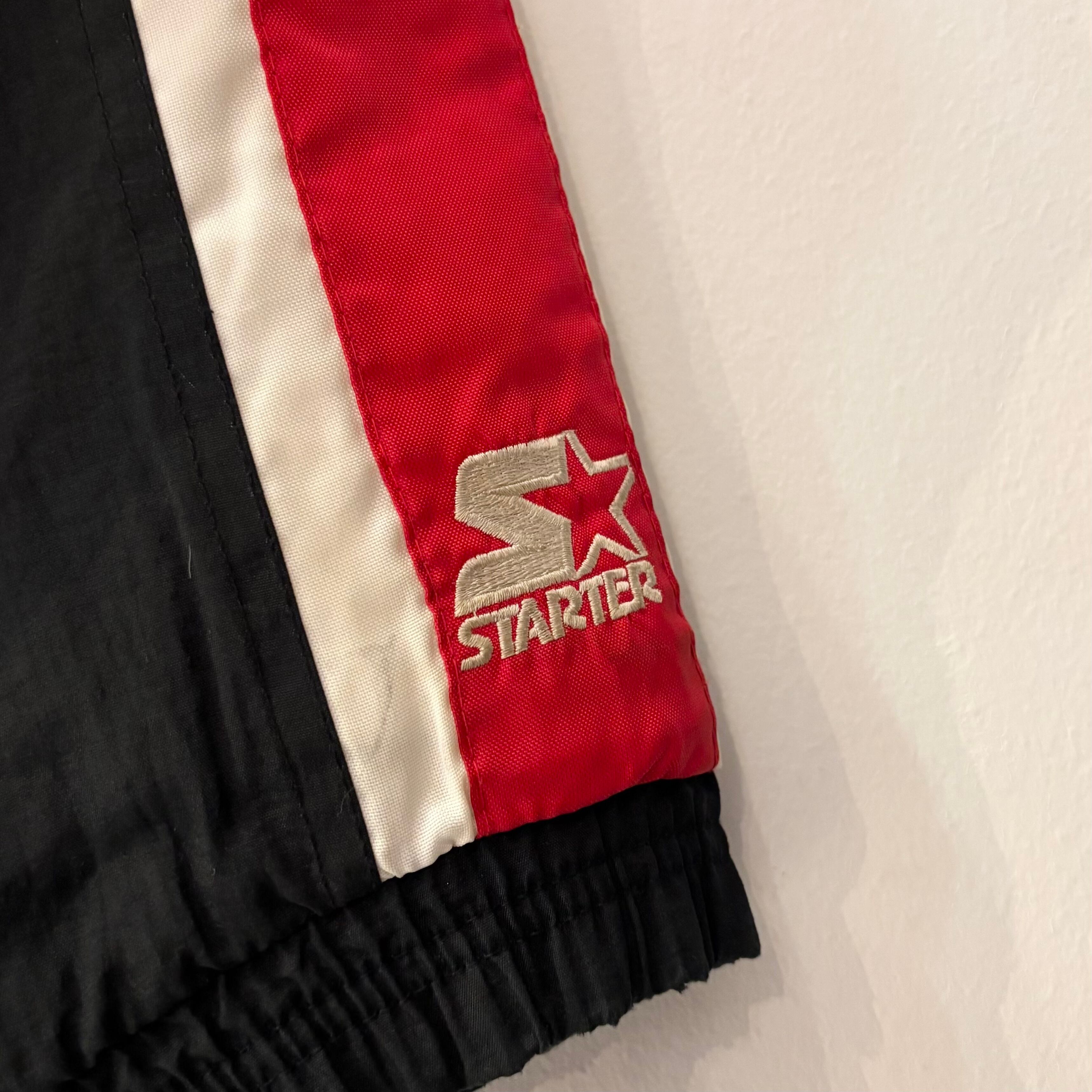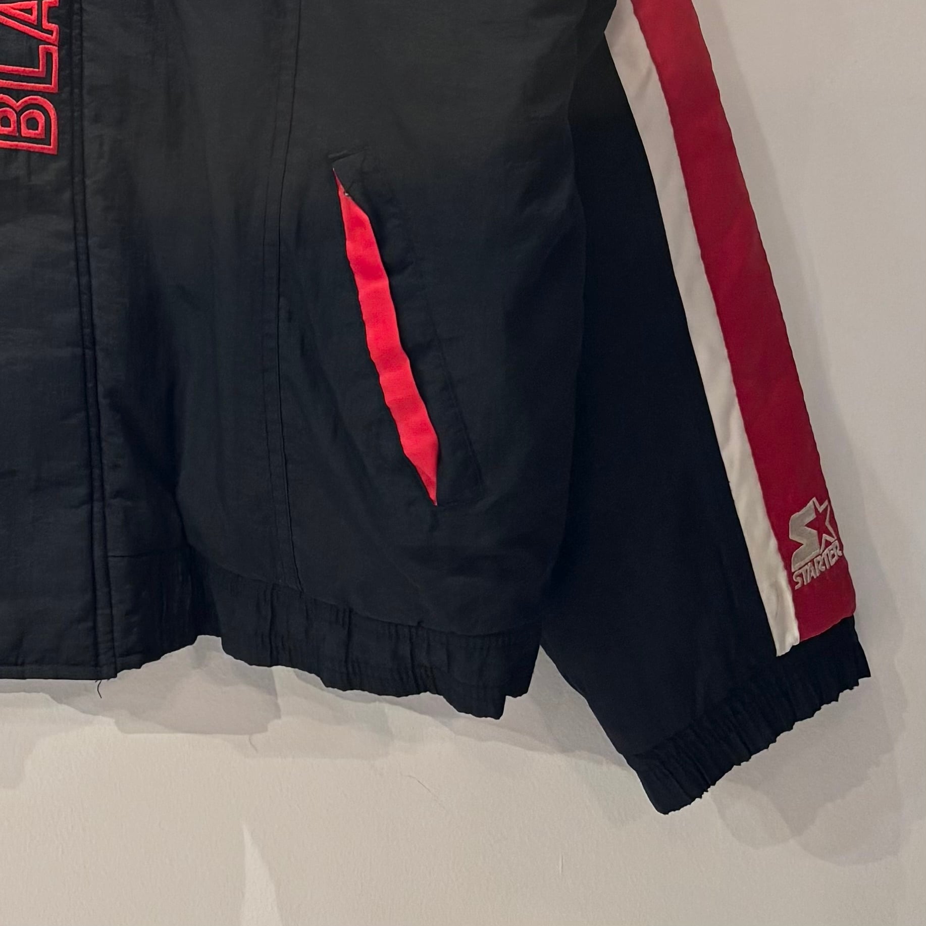 ブラックxレッドxホワイト、フロント前立てにBLACKHAWKS刺繍、右袖にロゴマーク刺繍、バックに大きくロゴマーク刺繍、襟元にNHLロゴマーク刺繍、左袖先にSTARTERロゴマーク刺繍、STARTERロゴプレートのジッパースライダー、ハンドウォームポケットが付いたデザインです。