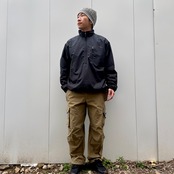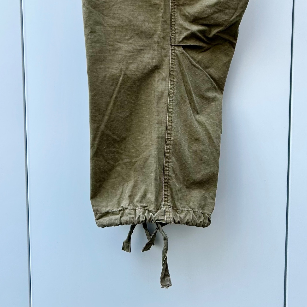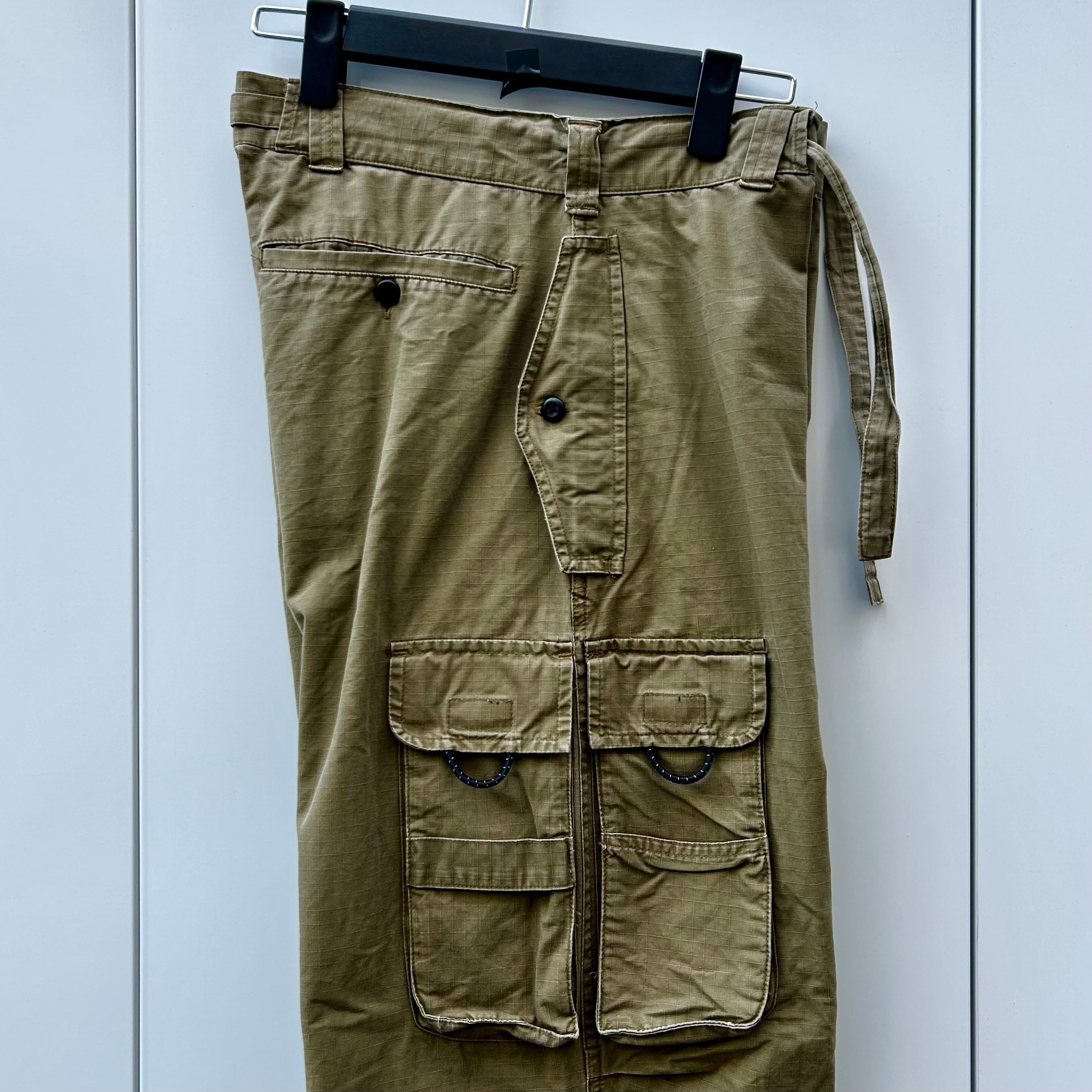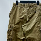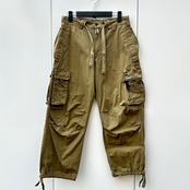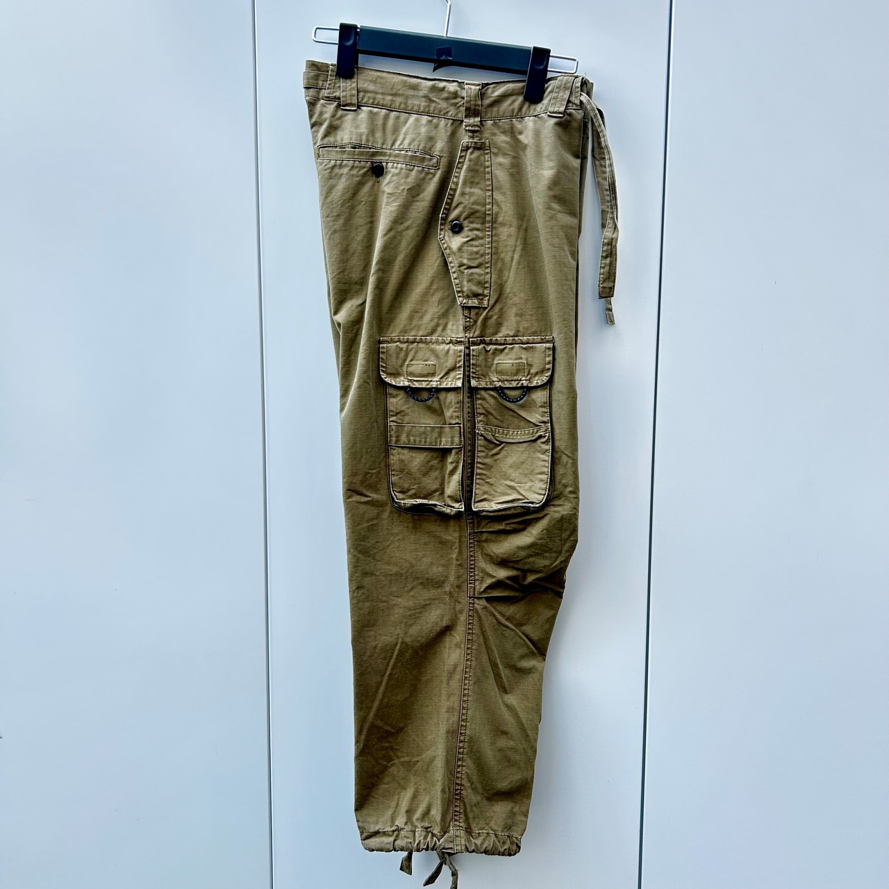 モカブラウンのコットン系リップストップ素材、左足のサイドポケットにネーム、両サイドに異なるカーゴポケット、ハンドウォームポケット、右バックポケット、両膝に立体ステッチ、ウエストと裾にアジャスター野茂紐が入るデザインです。