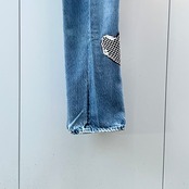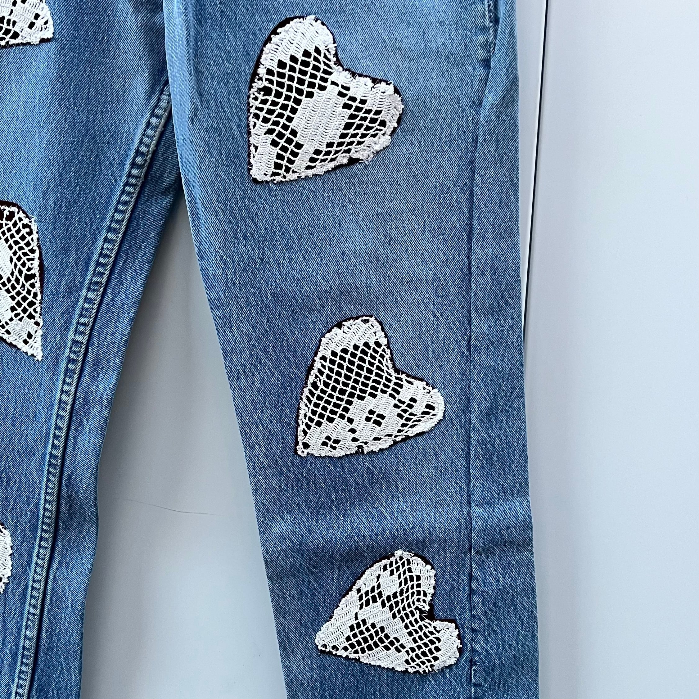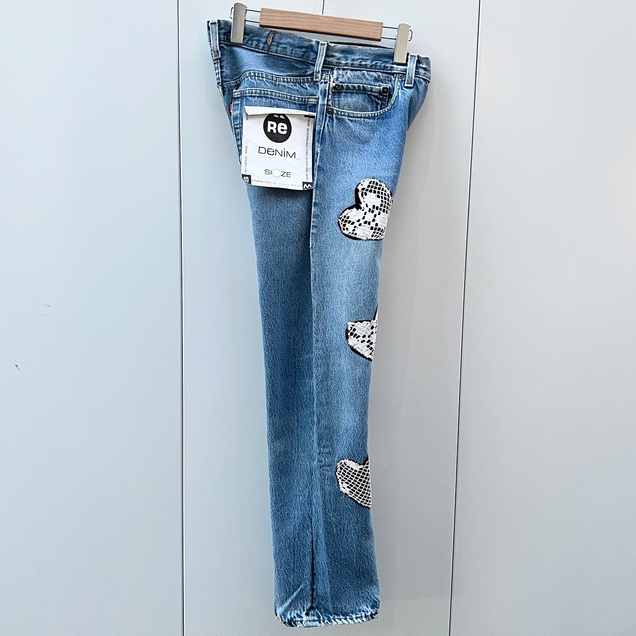 ウォッシュドブルーデニム、フロントの左右にそれぞれ3つのハート型リメイクワッペン、・ヒップにハート型リメイクワッペンの付いたデザインです。