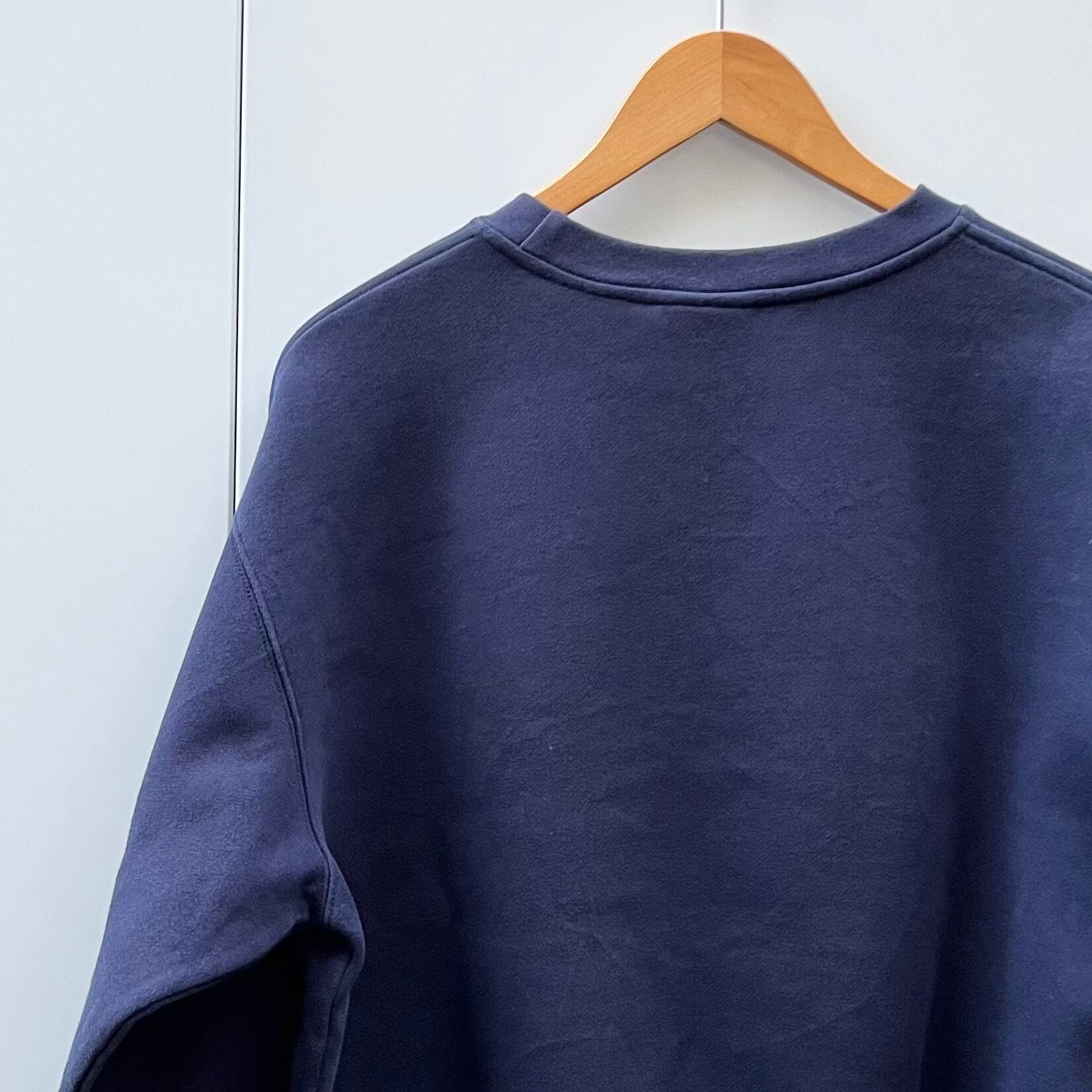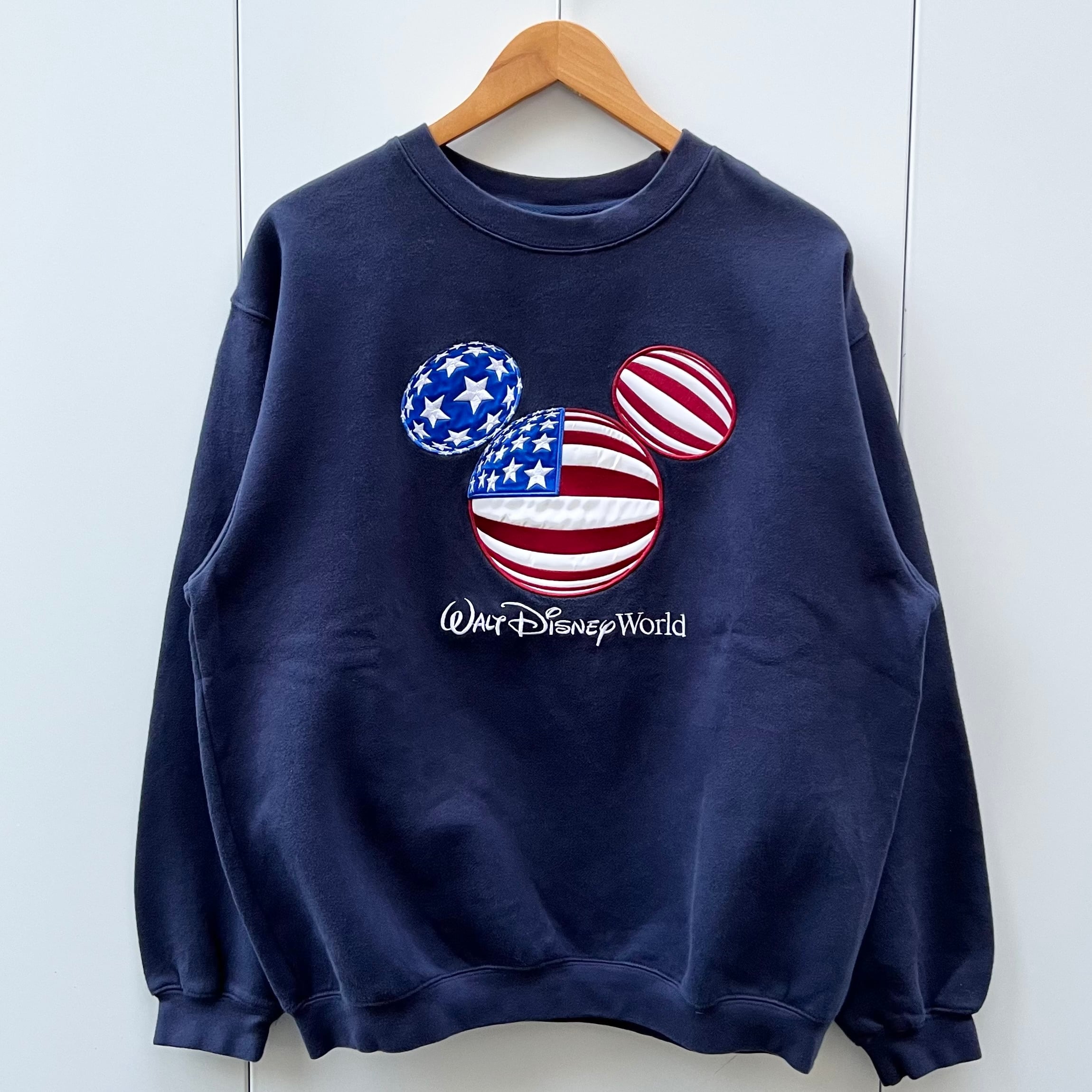 ネイビーの裏起毛素材、フロントに星条旗柄ミッキーとWalt Disney World刺繍が入るシンプルデザインです。