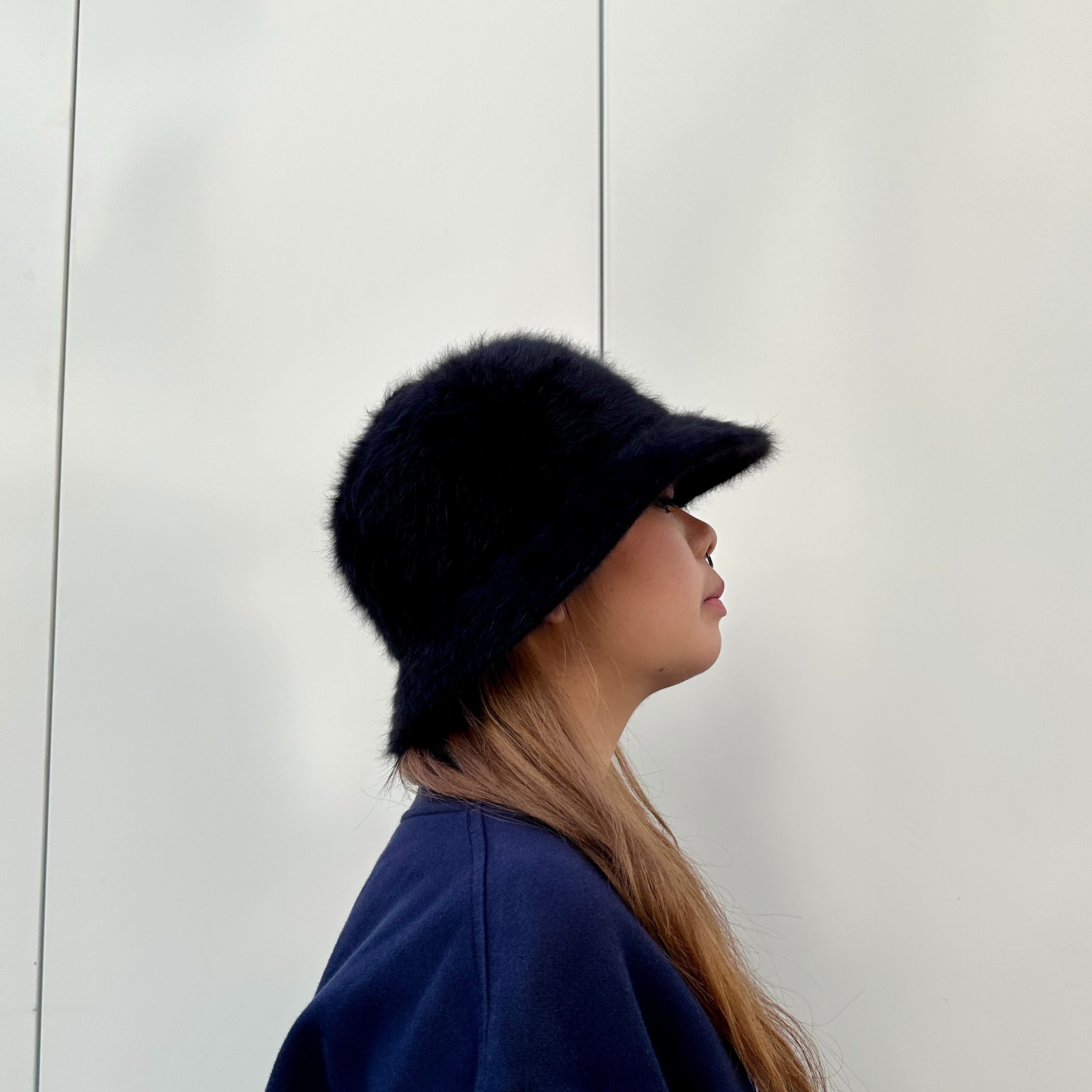 ブラックのファー素材、フロントにロゴ刺繍の入るデザインです。