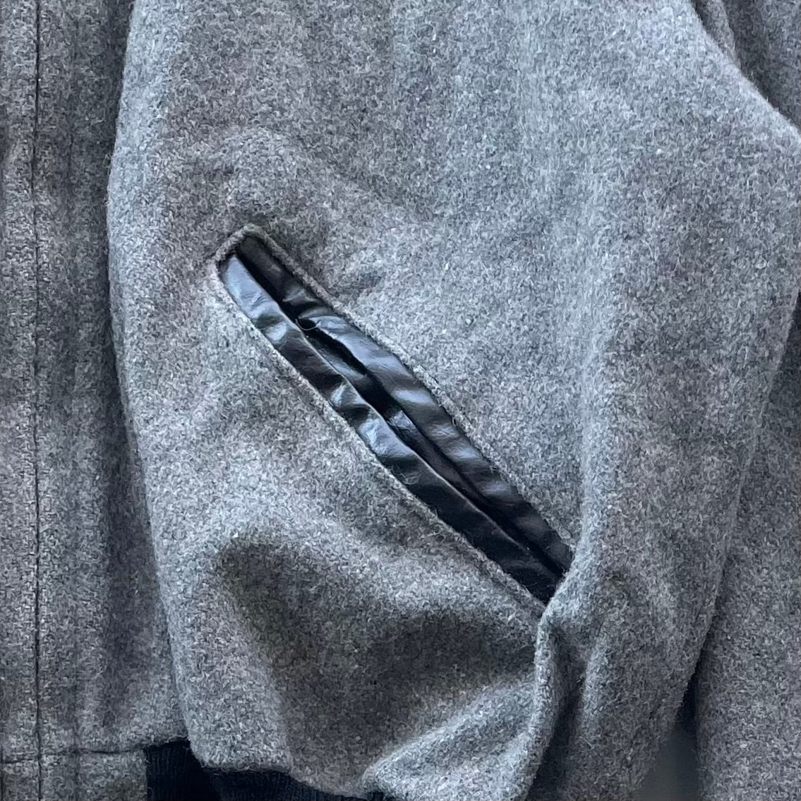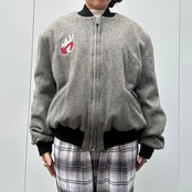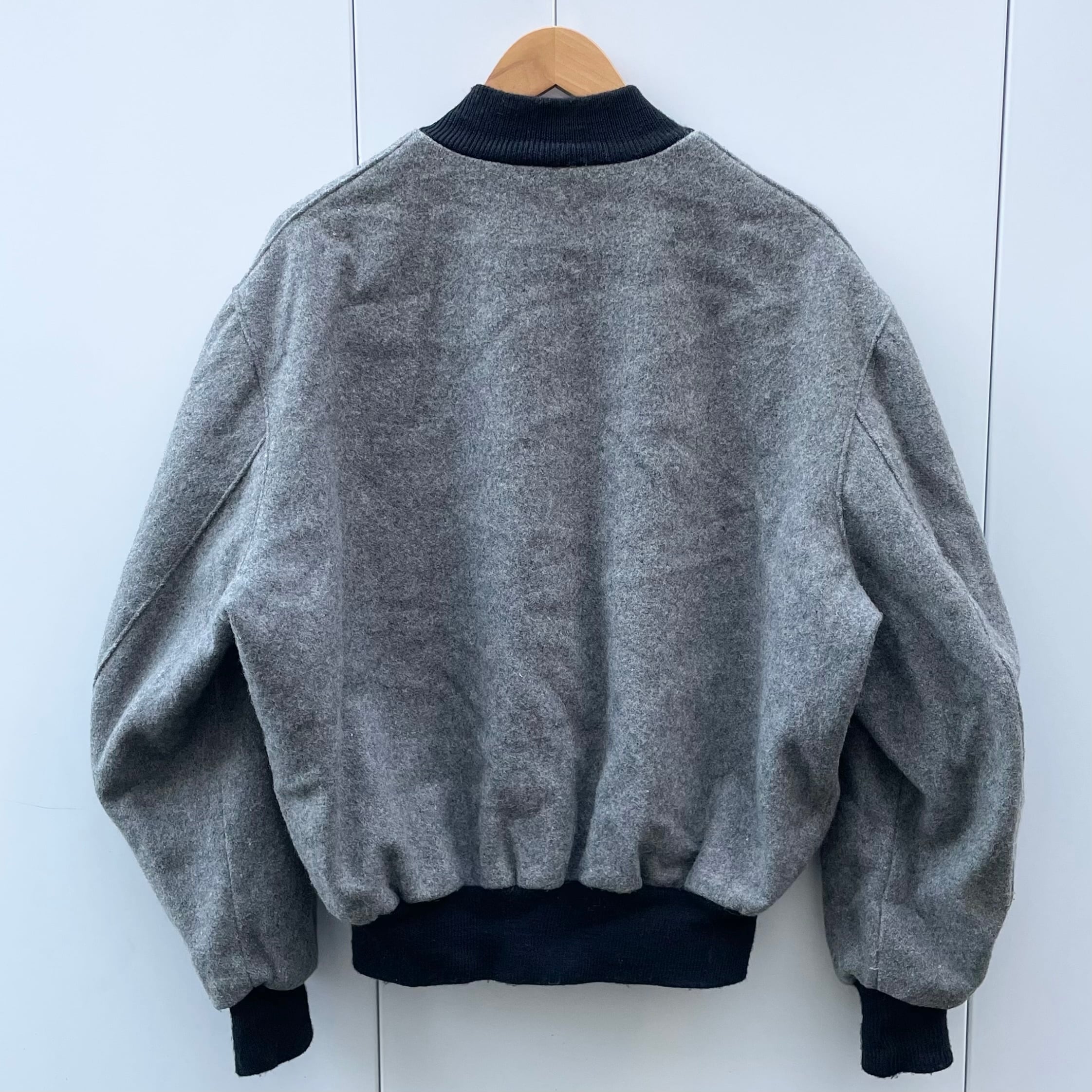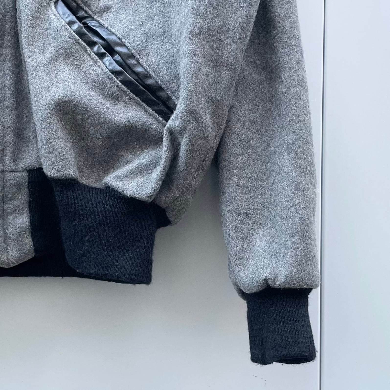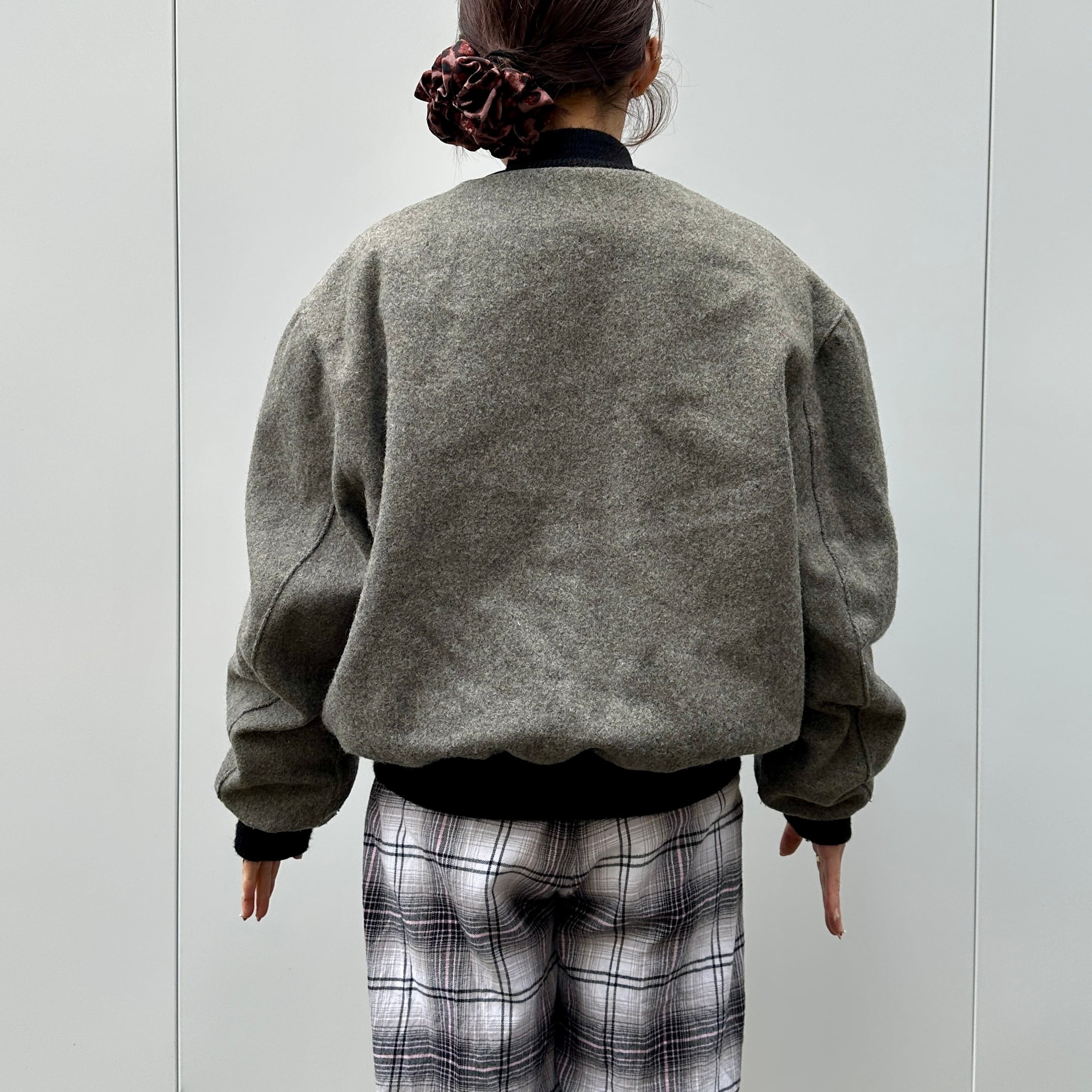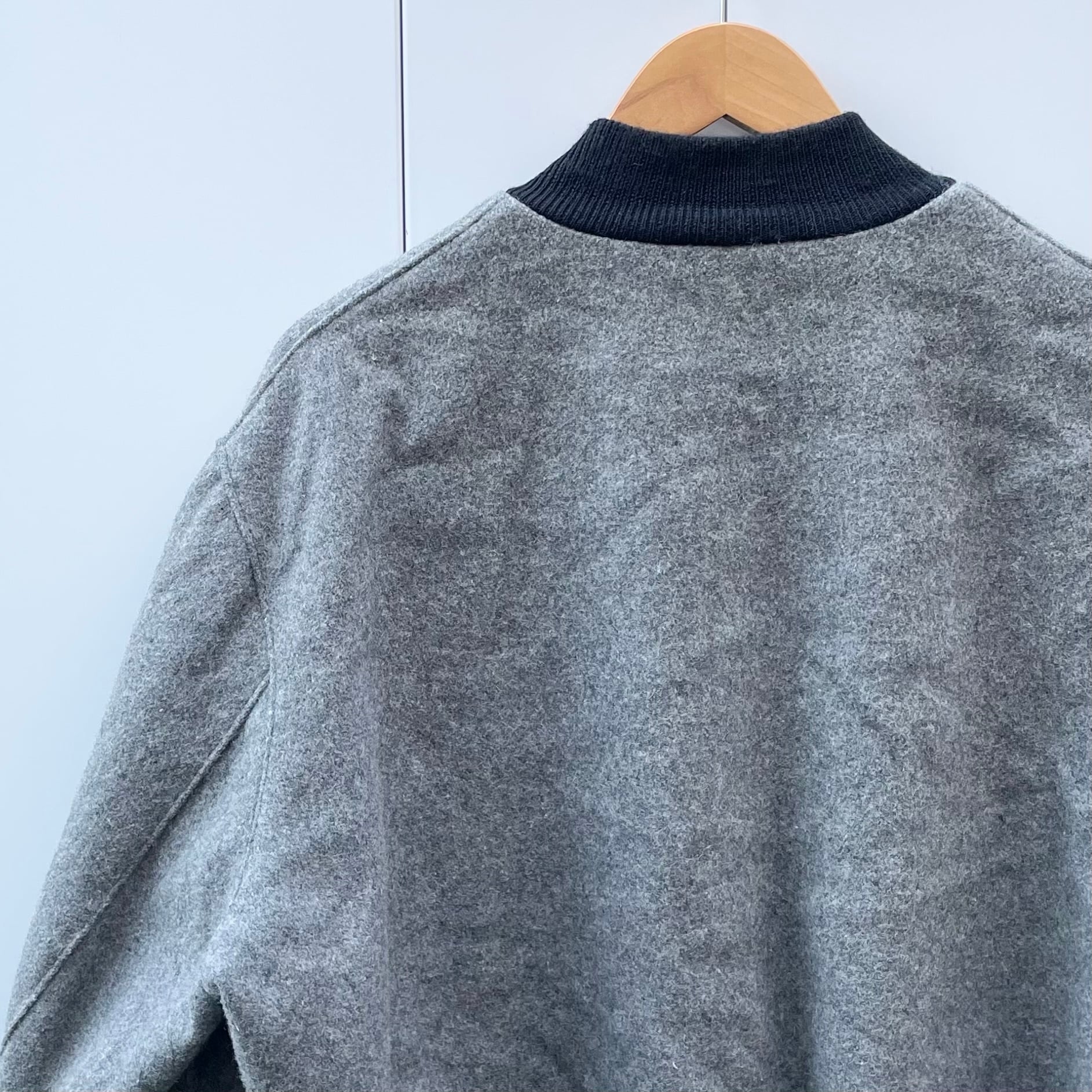 グレーのウール素材xブラックリブ、右胸にロゴマーク刺繍、ハンドウォームポケット、ジッパーで開閉するシンプルデザインです。