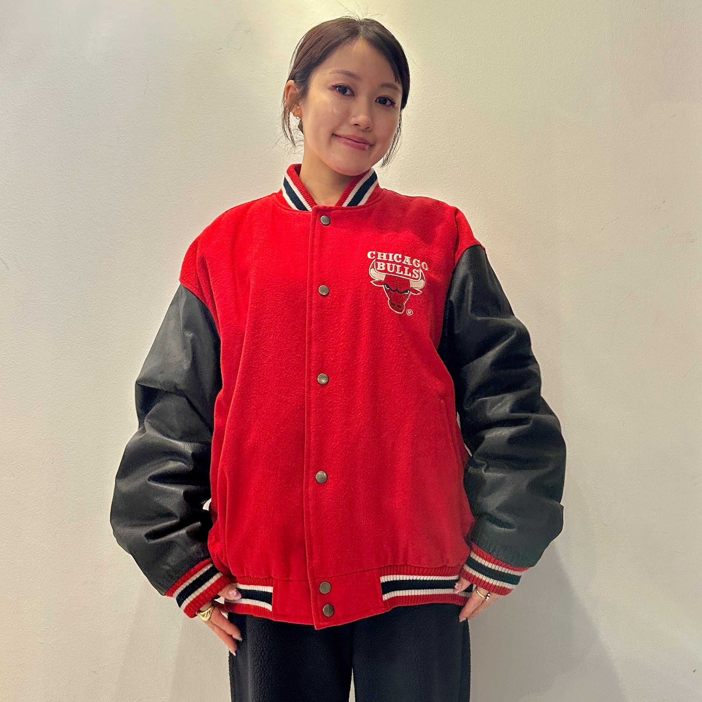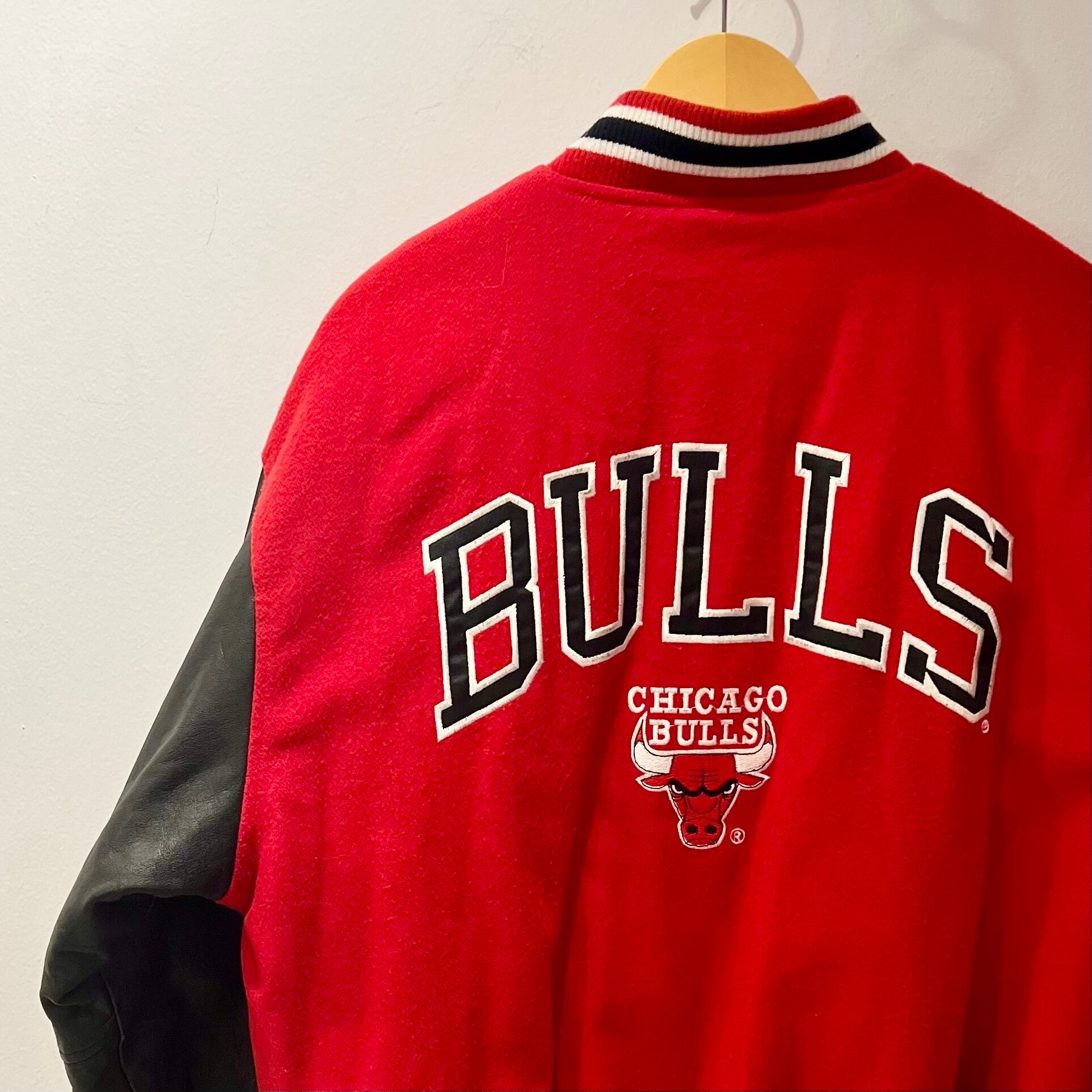 レッドメルトンxブラックレザー袖/ホワイトライン、左胸にCHICAGO BULLSとロゴマーク刺繍、バックに大きくBULLSとロゴとロゴマーク刺繍が入るデザインです。