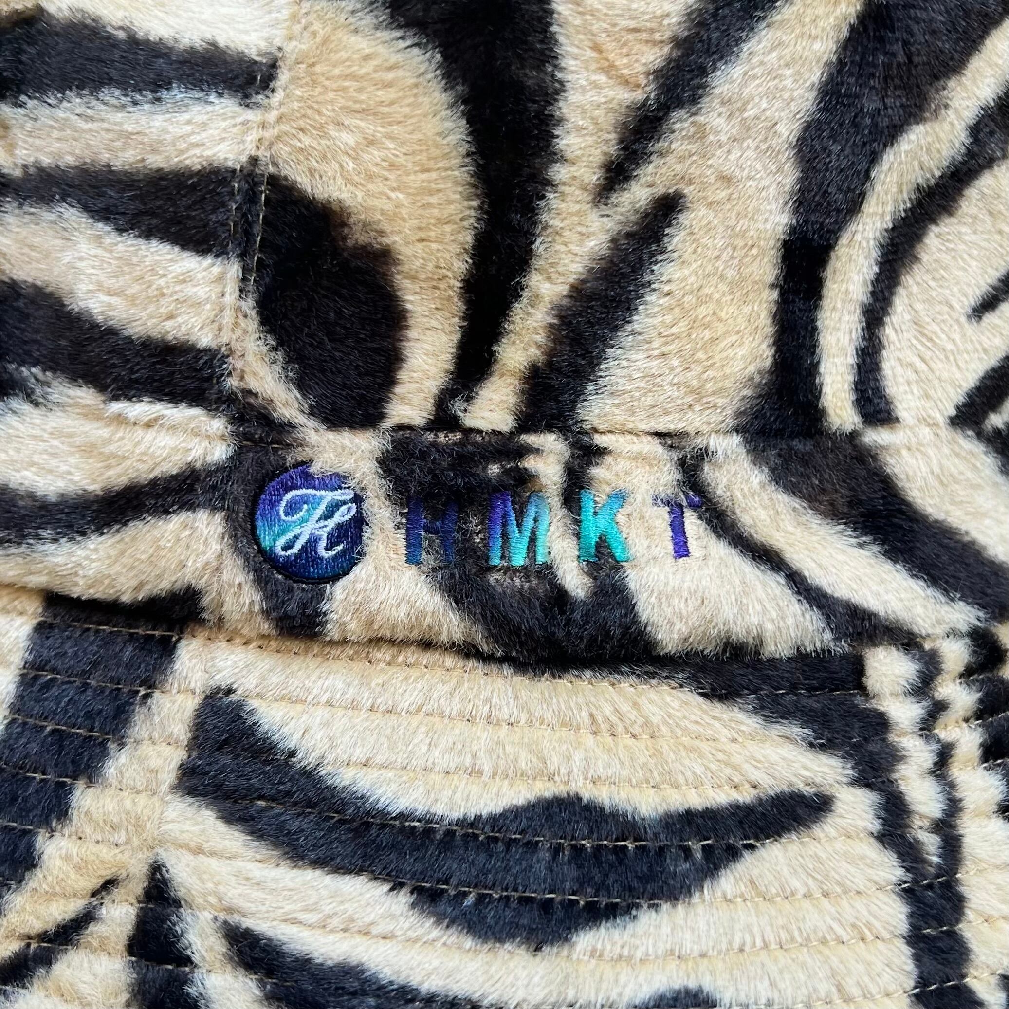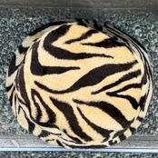 ベージュxブラウンのヒョウ柄ファー素材、左サイドにロゴ刺繍の入るデザインです。