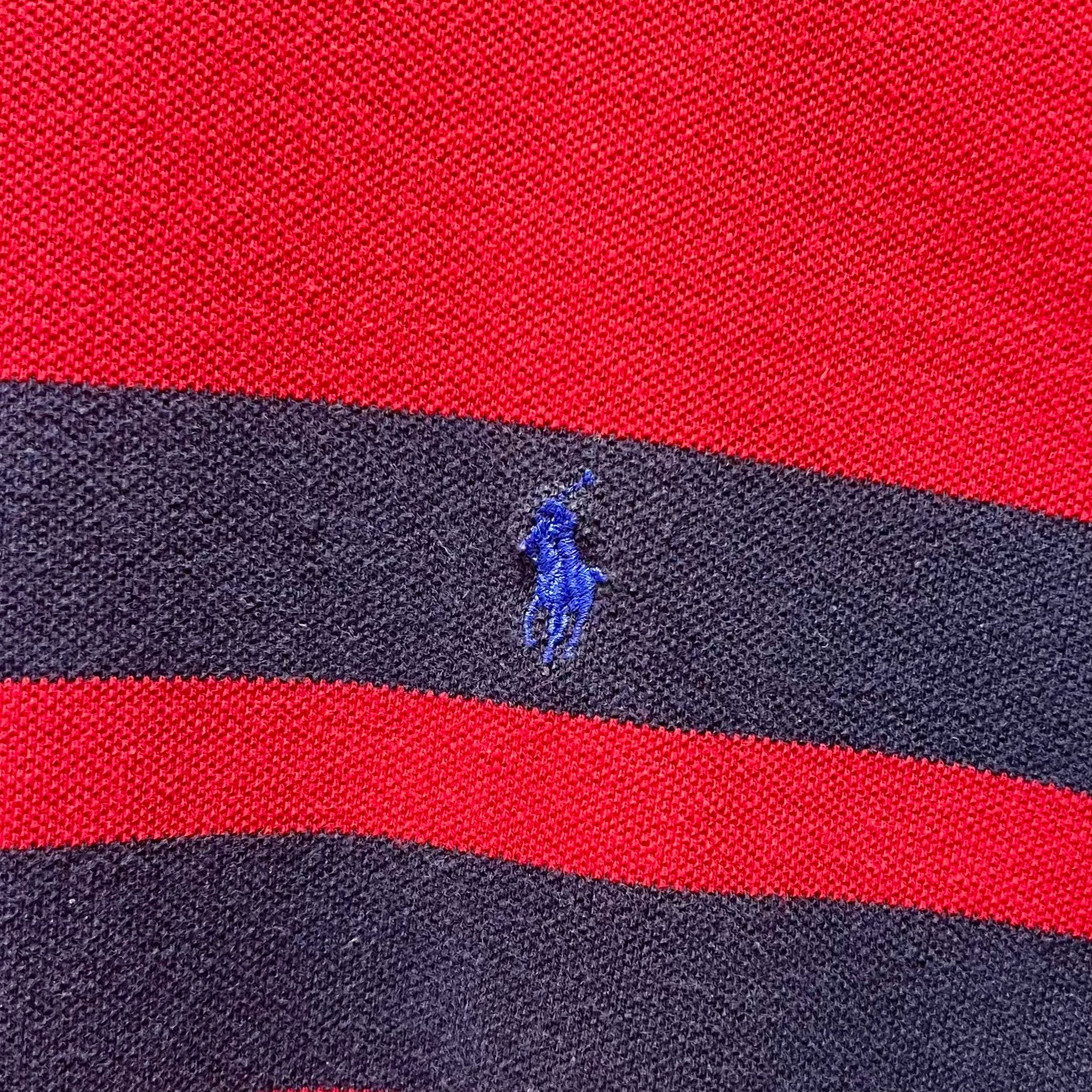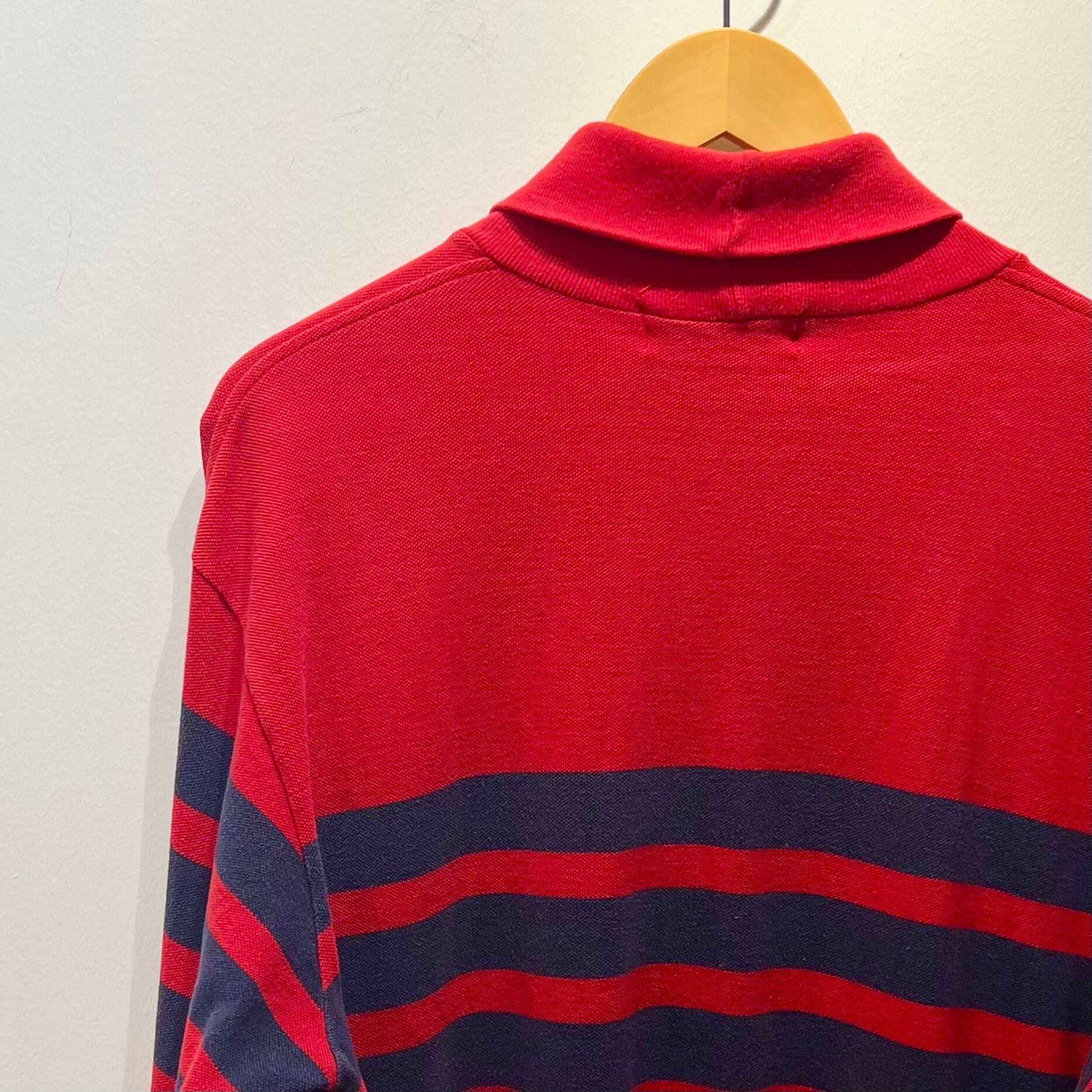 レッドxネイビーラインのコットンカノコ素材、左胸にポニー刺繍、タートルネックのデザインです。