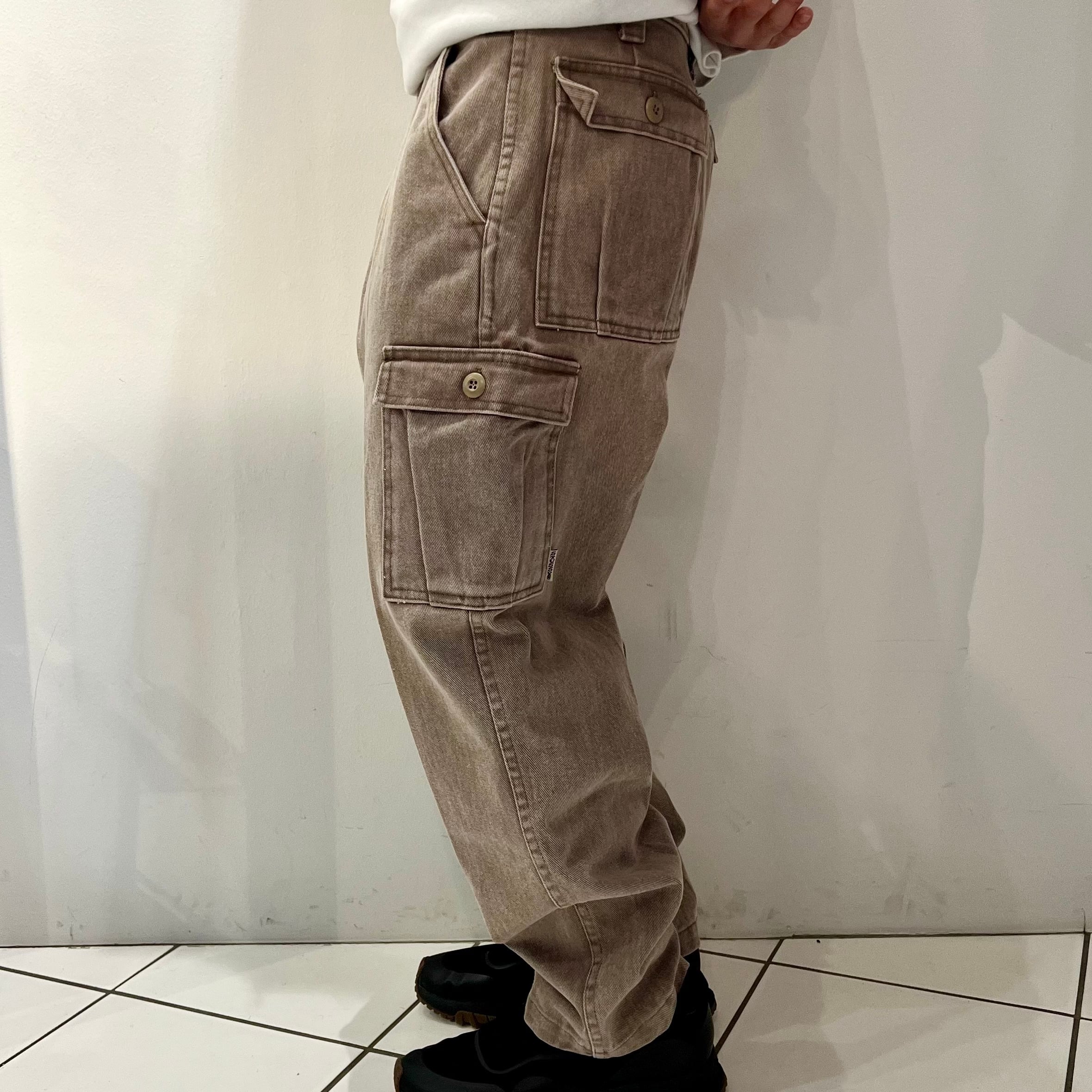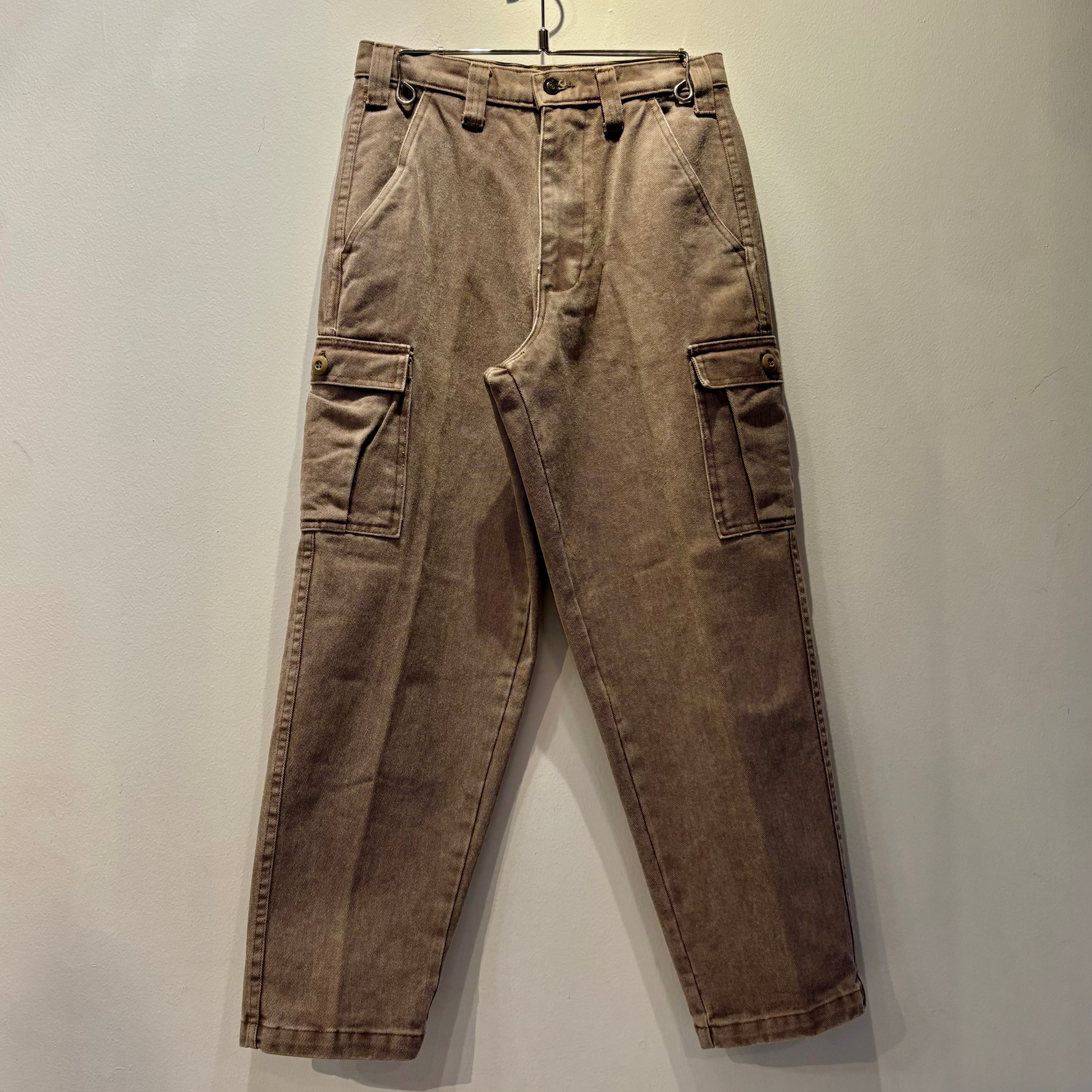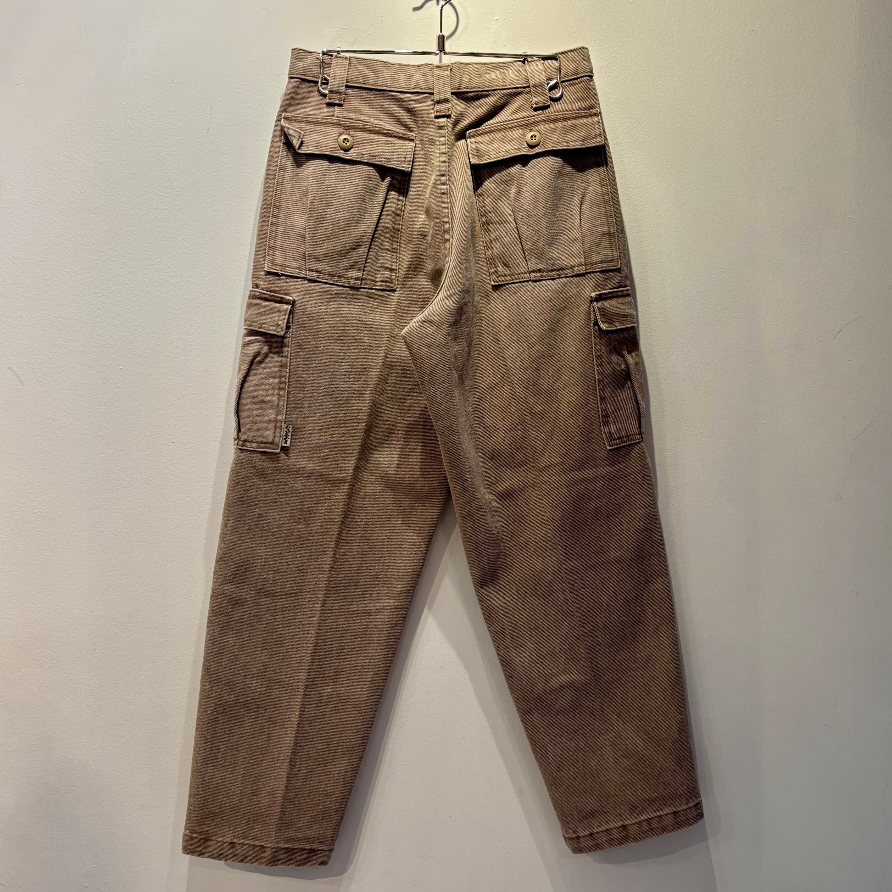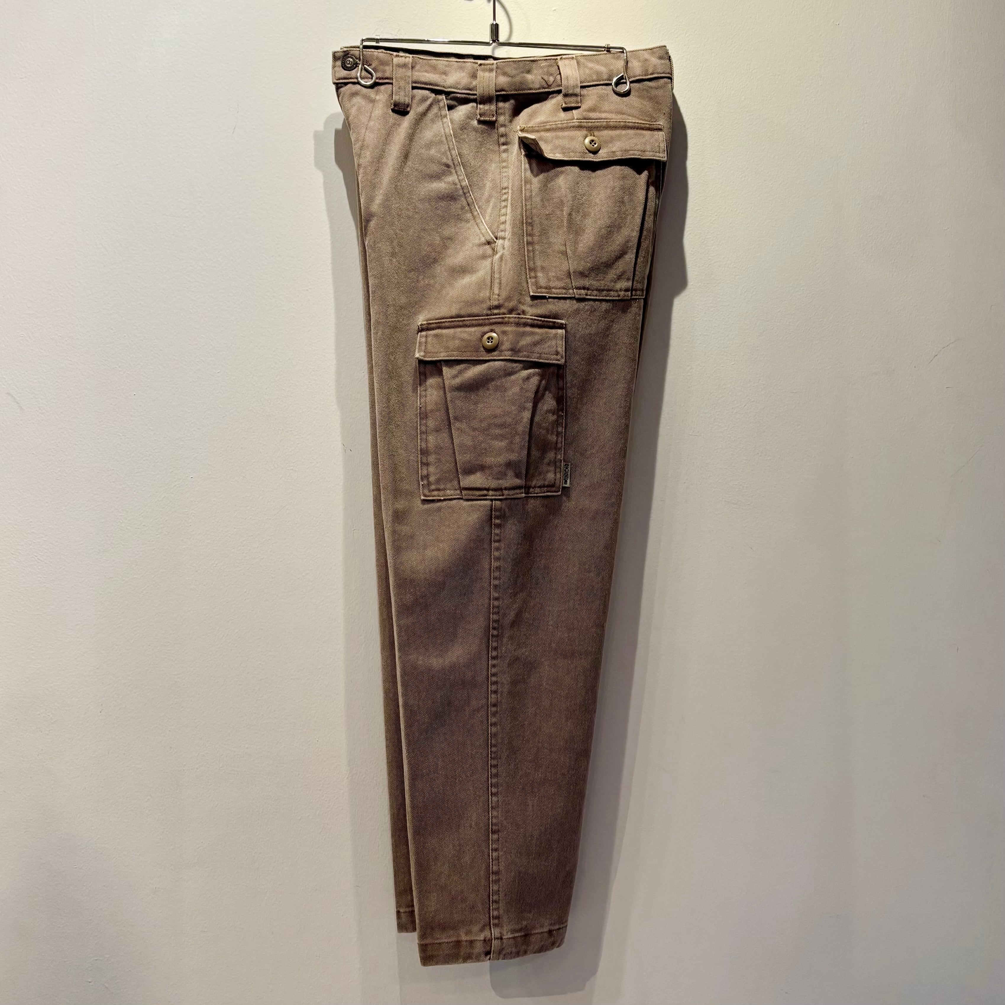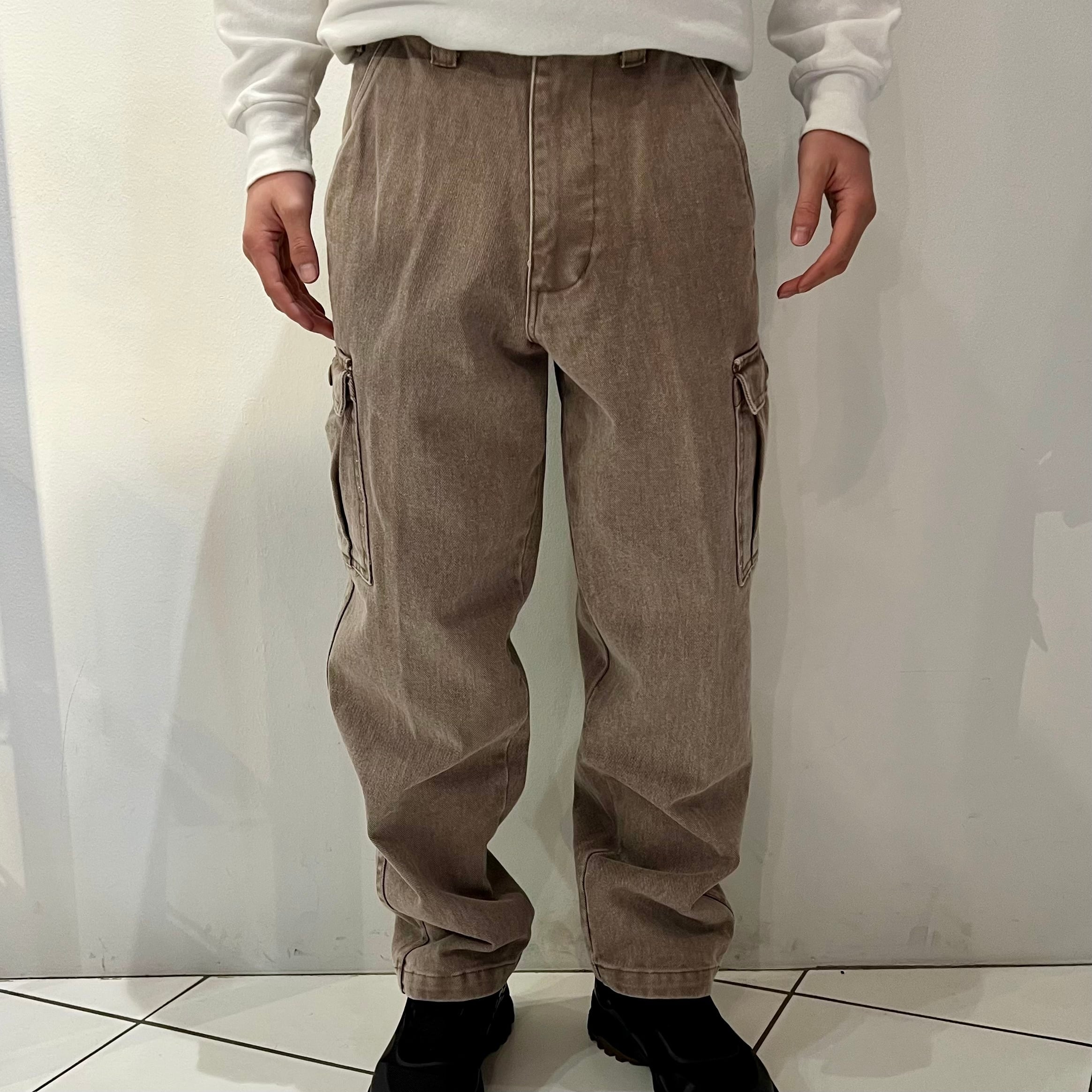 ウォッシュドブラウンデニムのコットン素材、左カーゴポケットにピスネーム、両サイドにカーゴポケット、フラップ付きバックポケットが付いたカーゴパンツ型デザインです。