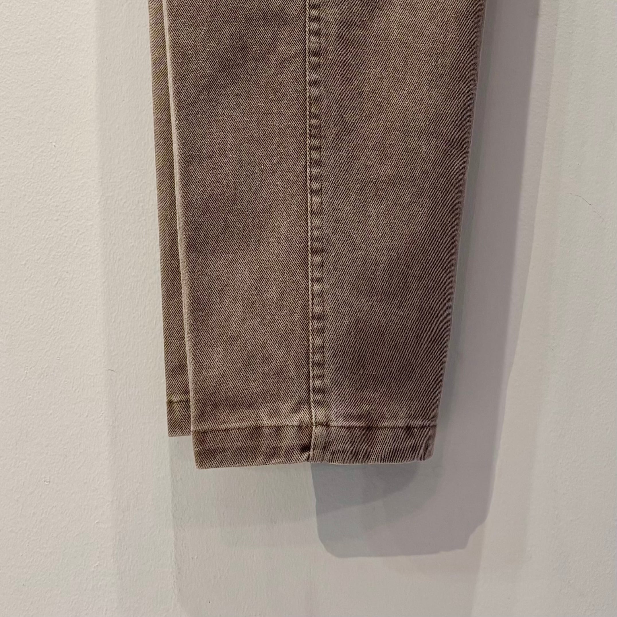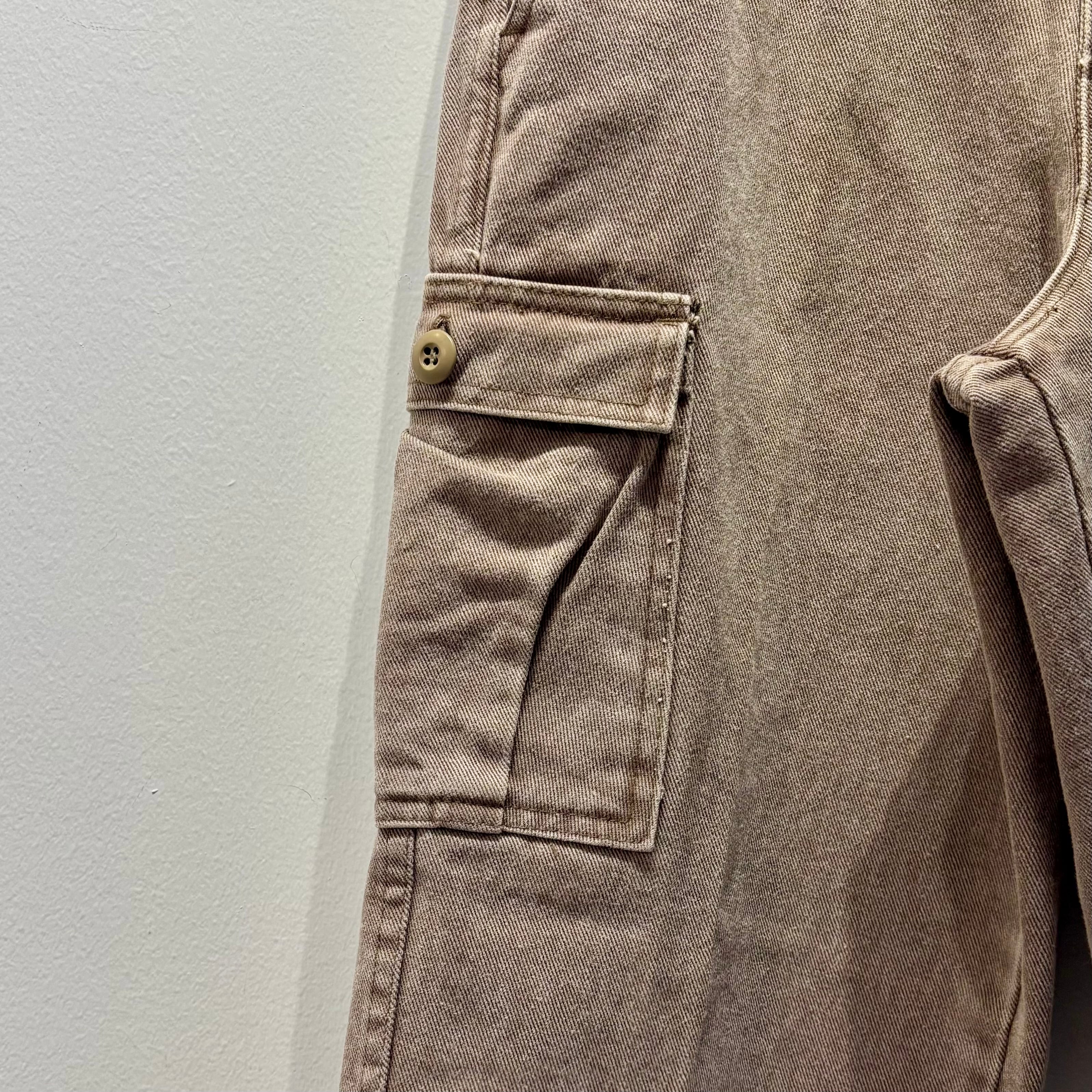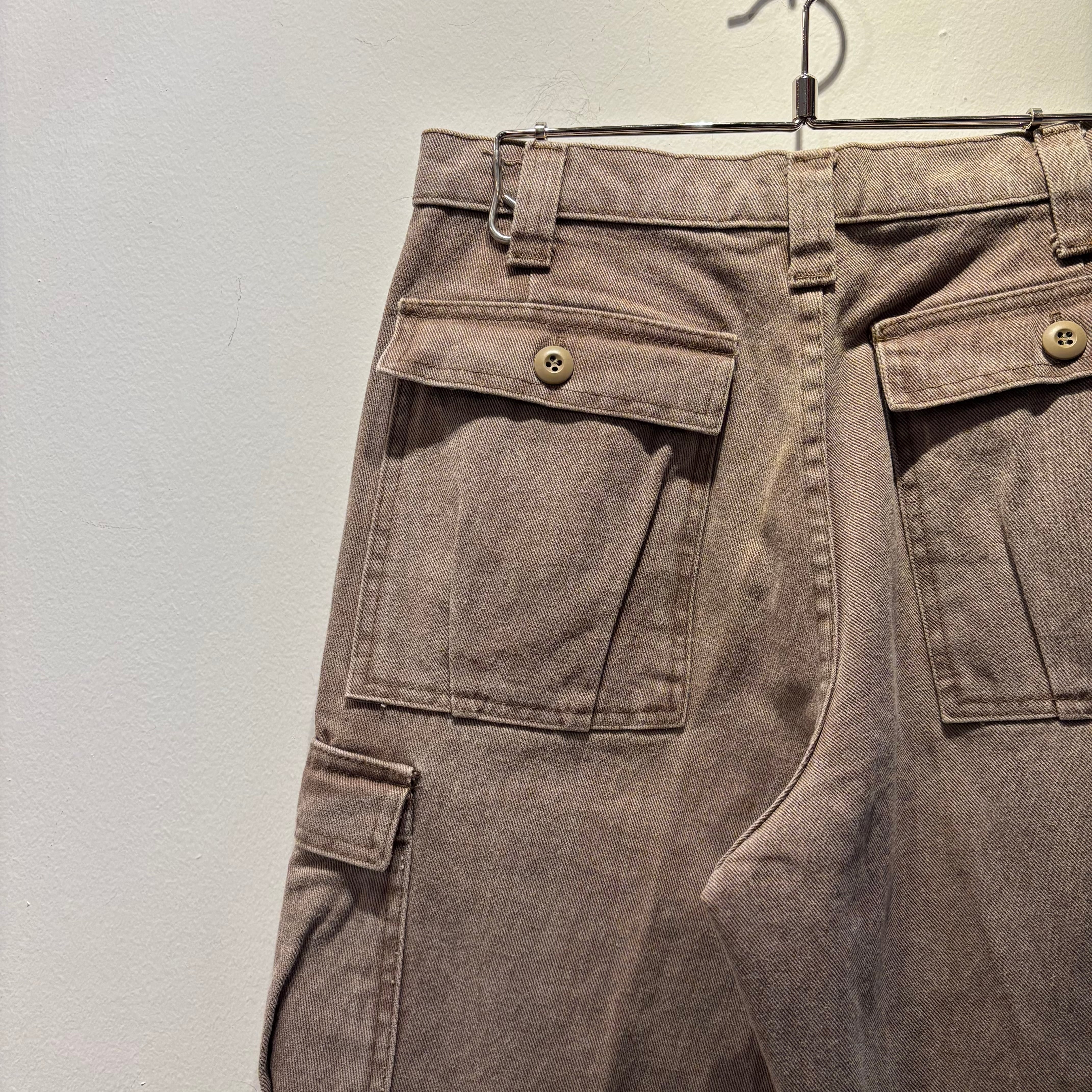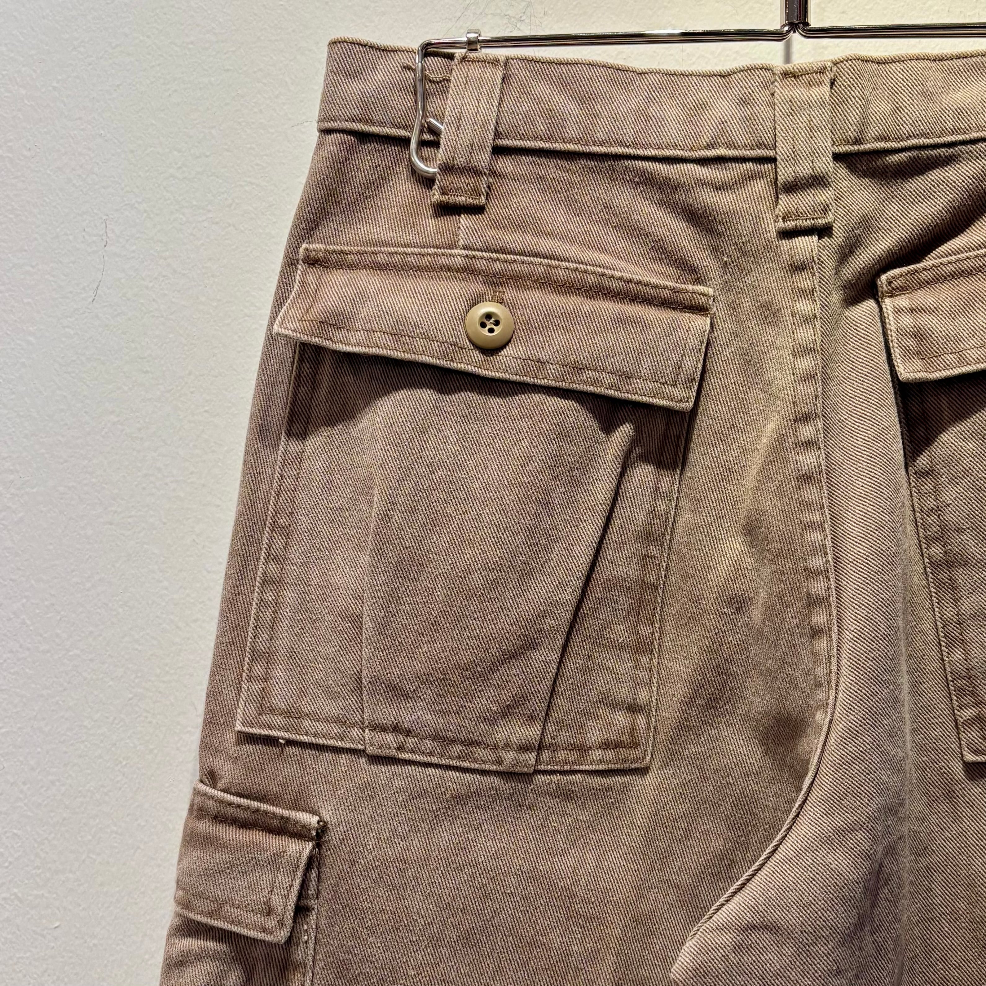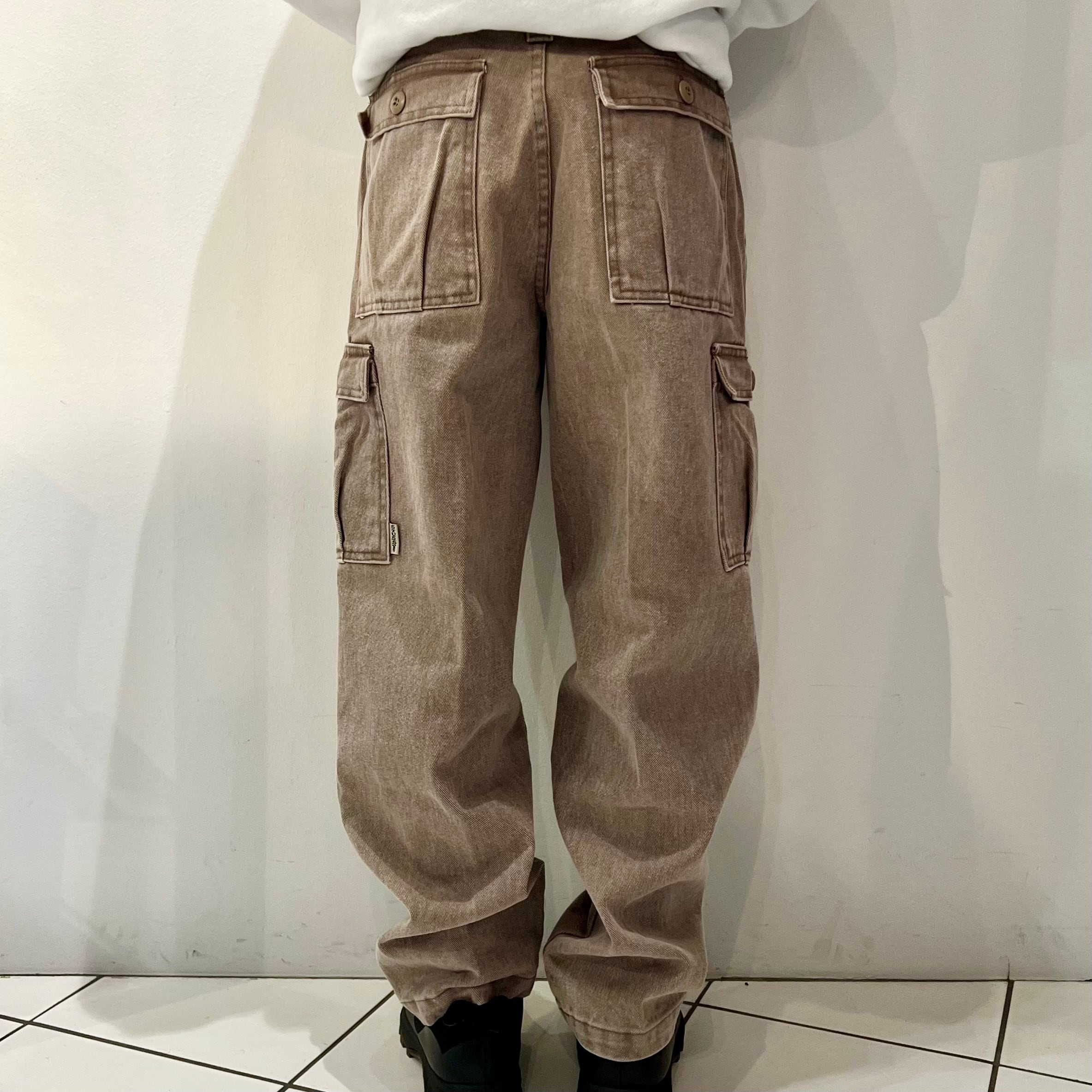ウォッシュドブラウンデニムのコットン素材、左カーゴポケットにピスネーム、両サイドにカーゴポケット、フラップ付きバックポケットが付いたカーゴパンツ型デザインです。