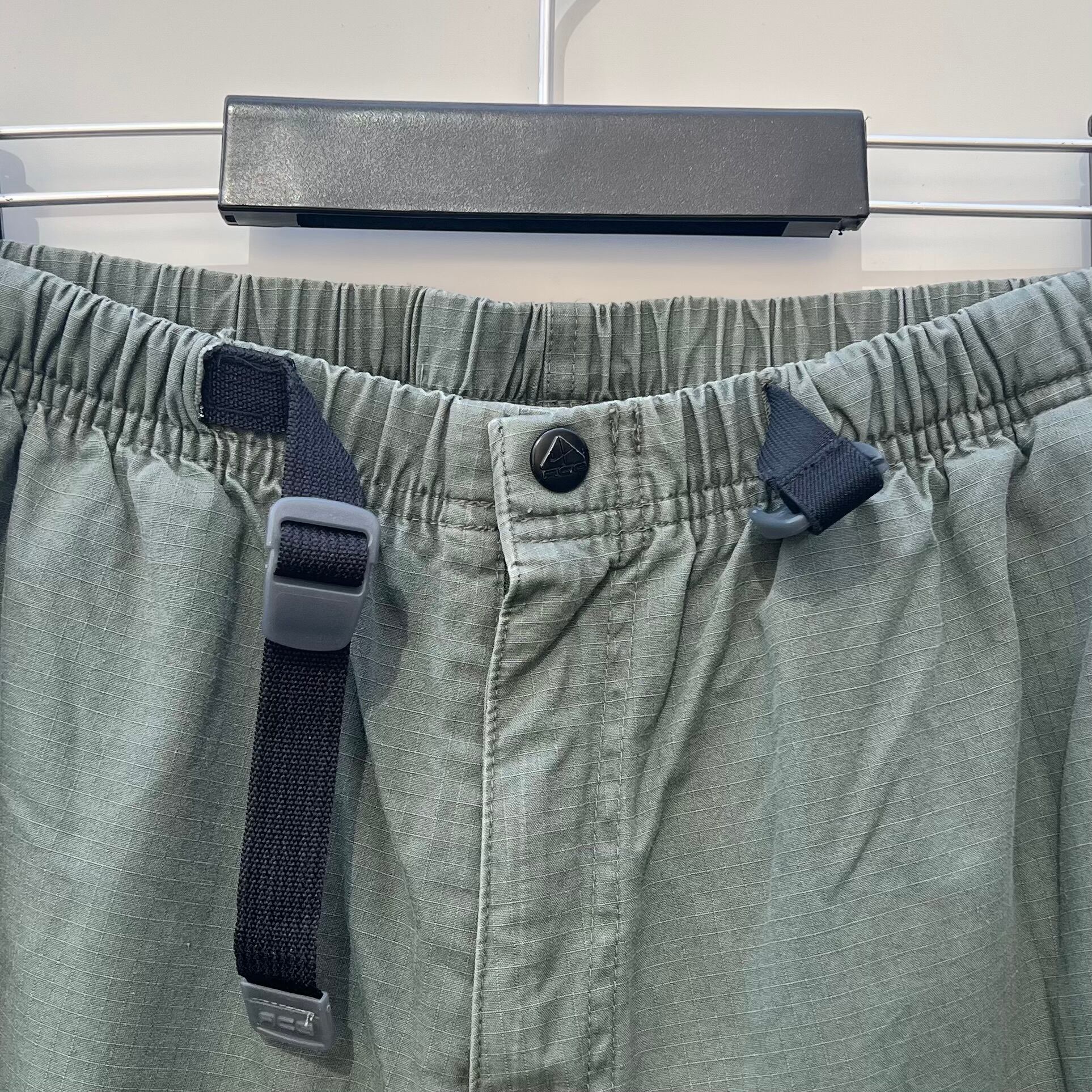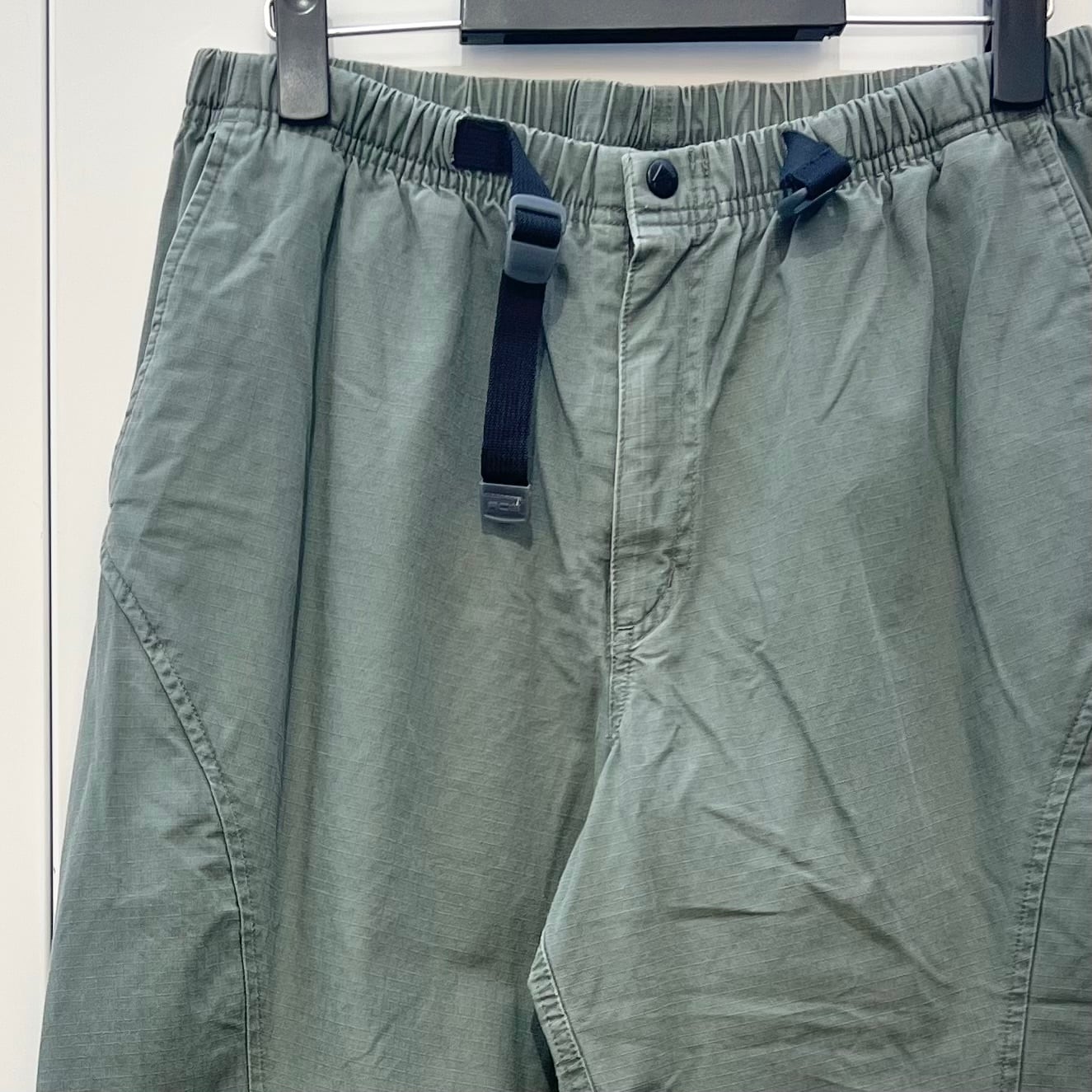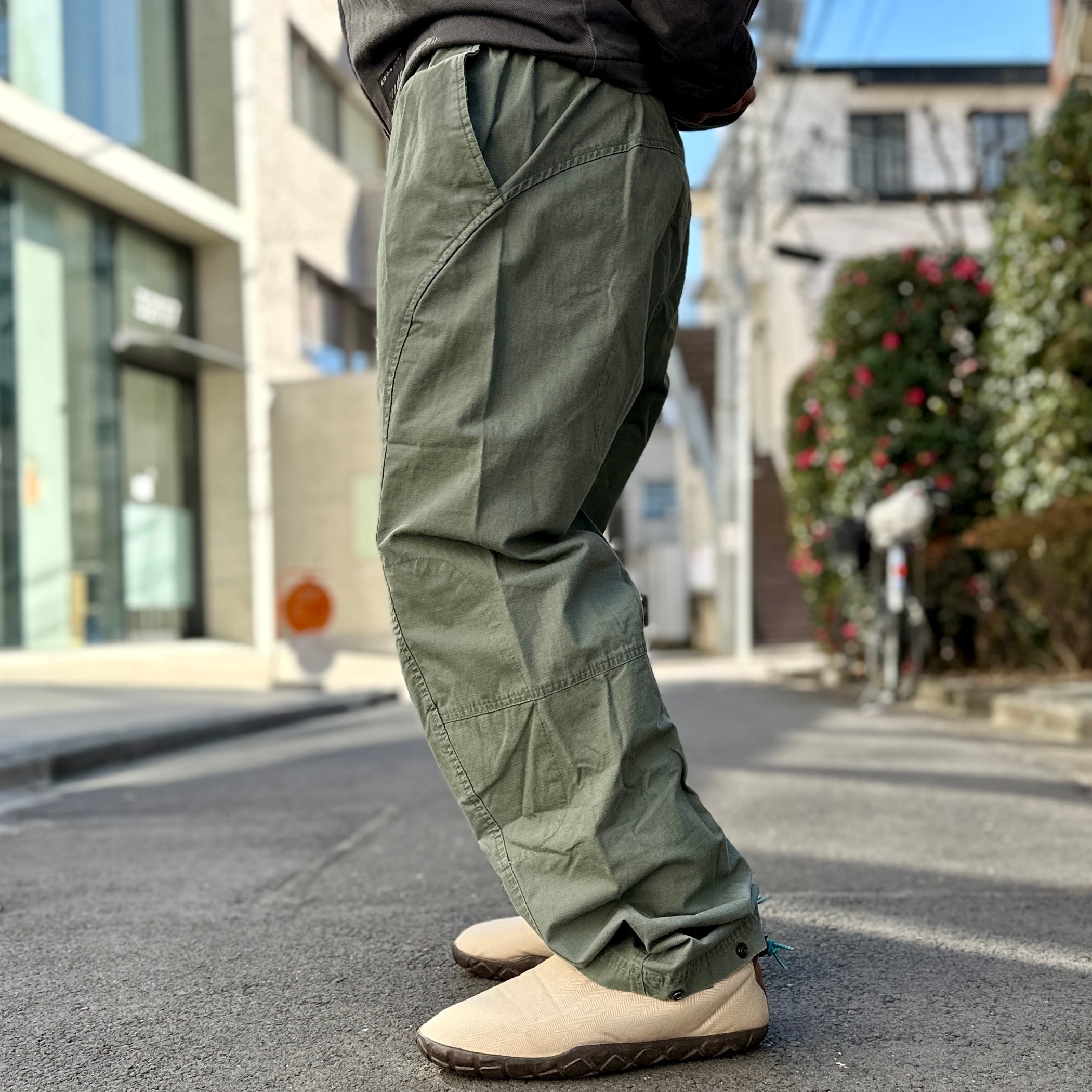 オリーブグリーンのコットンリップストップ素材、左足裾にロゴネーム、立体膝のダブルニー、ハンドウォームポケット、ウエストにクライミングベルトで調節、裾にスナップボタンアジャスターが付いたデザインです。