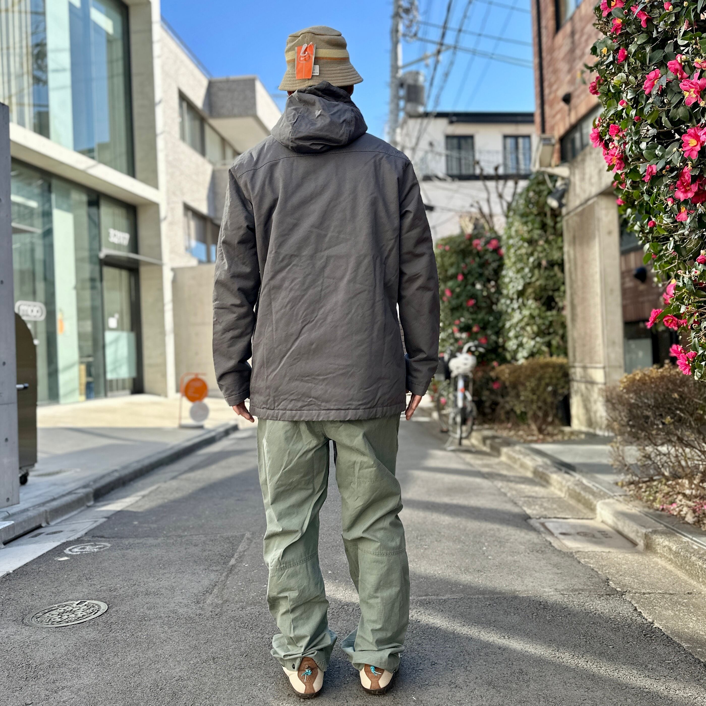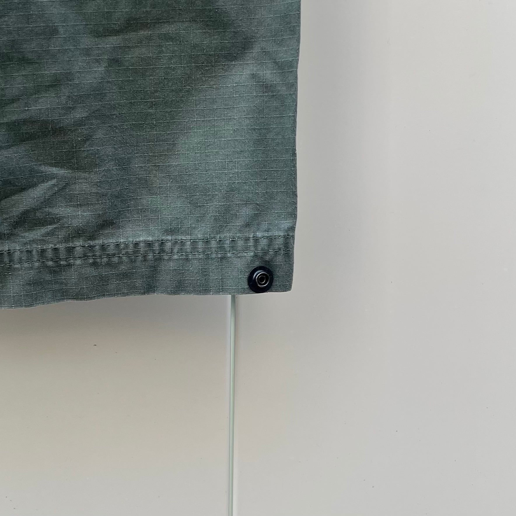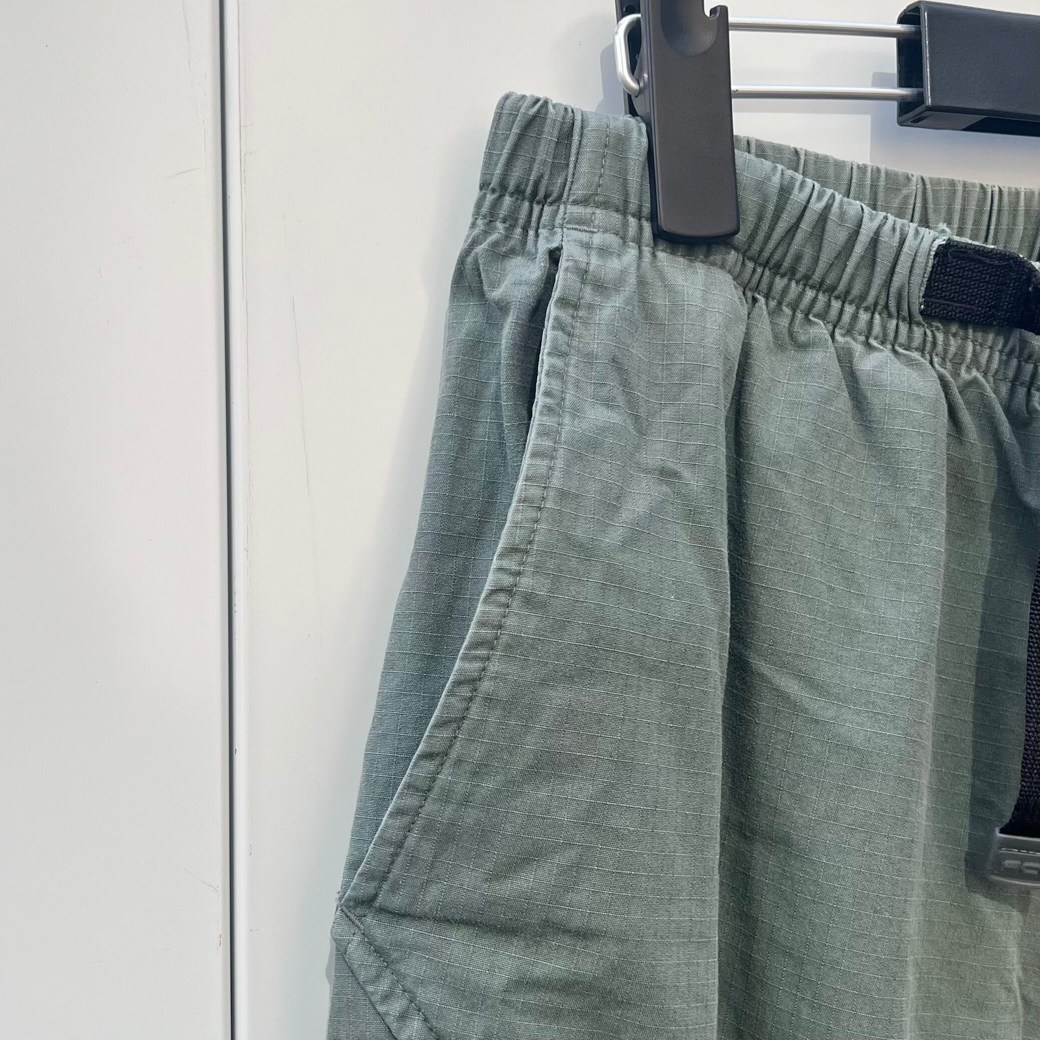 オリーブグリーンのコットンリップストップ素材、左足裾にロゴネーム、立体膝のダブルニー、ハンドウォームポケット、ウエストにクライミングベルトで調節、裾にスナップボタンアジャスターが付いたデザインです。