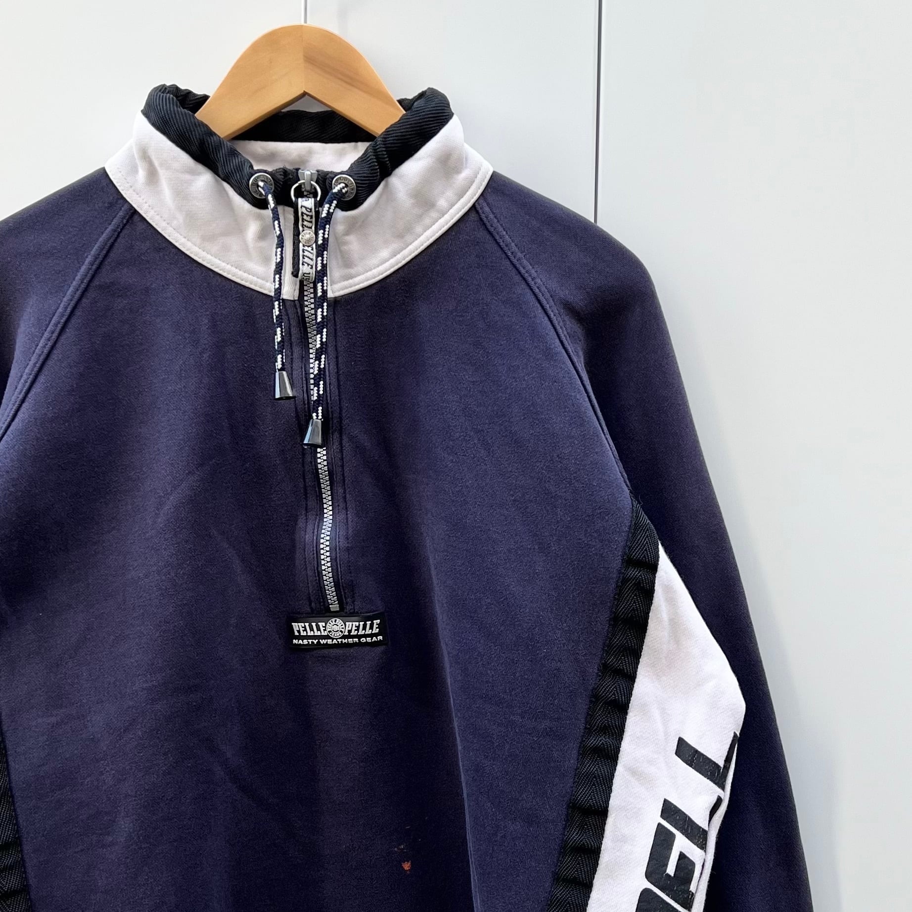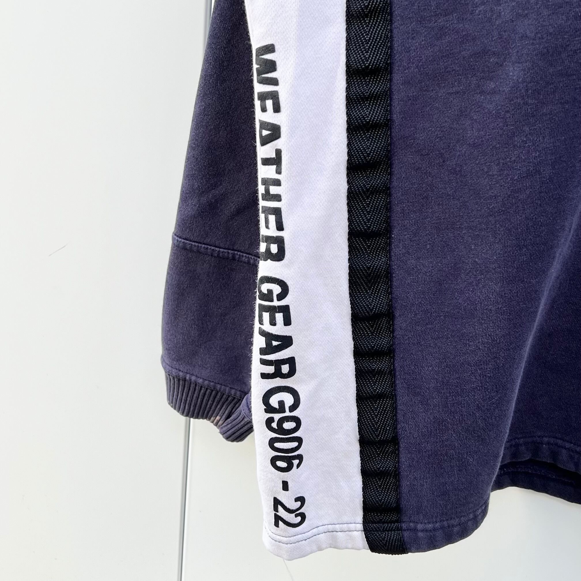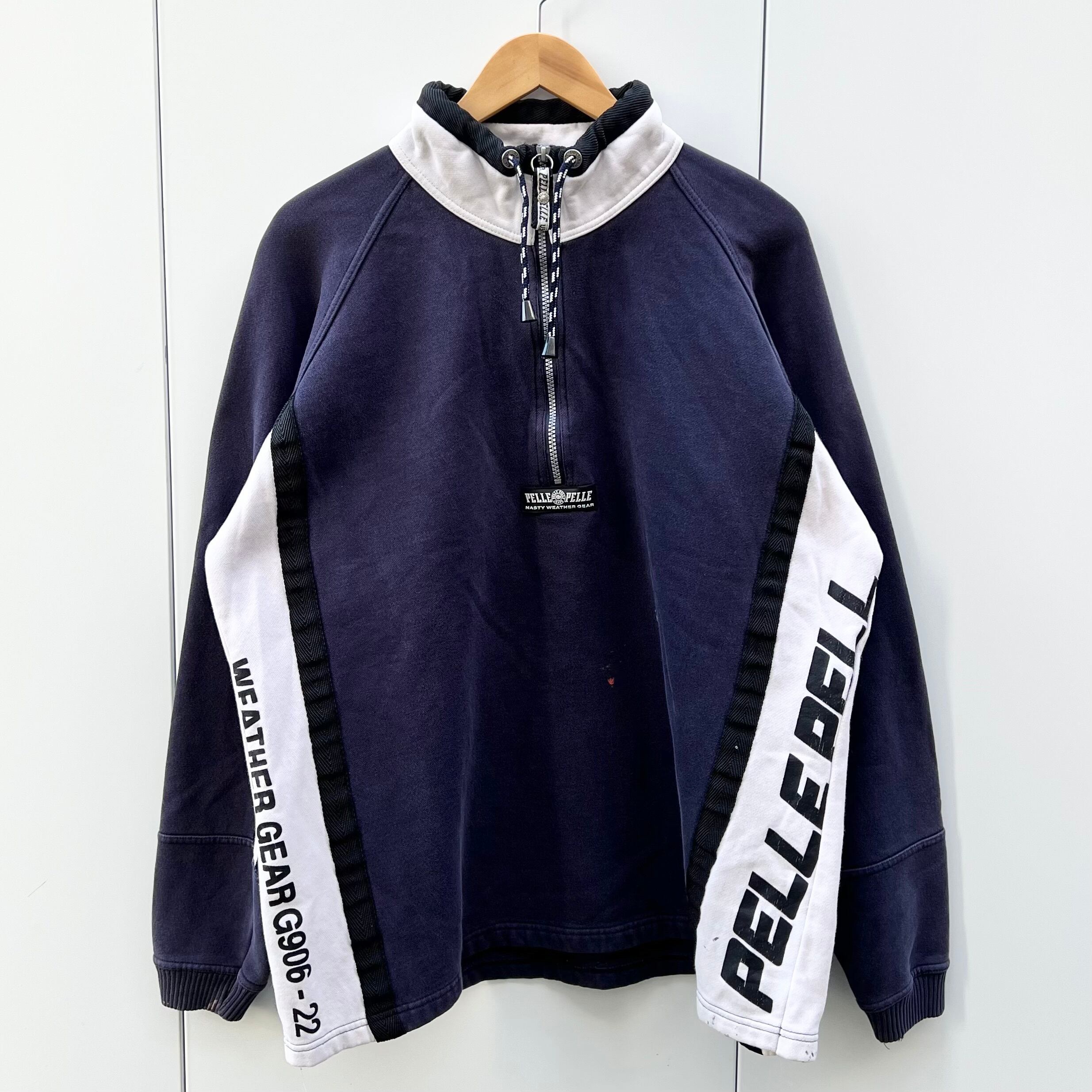 ネイビーxホワイトxブラックラインの裏起毛素材、フロント中央にラバーネーム、左サイドにPELKE PELLEプリント、右サイドにWEATHER GEAR G906-22プリント、ロゴテープのジッパースライダー、襟にドローコード、ハーフジップのシンプルデザインです。