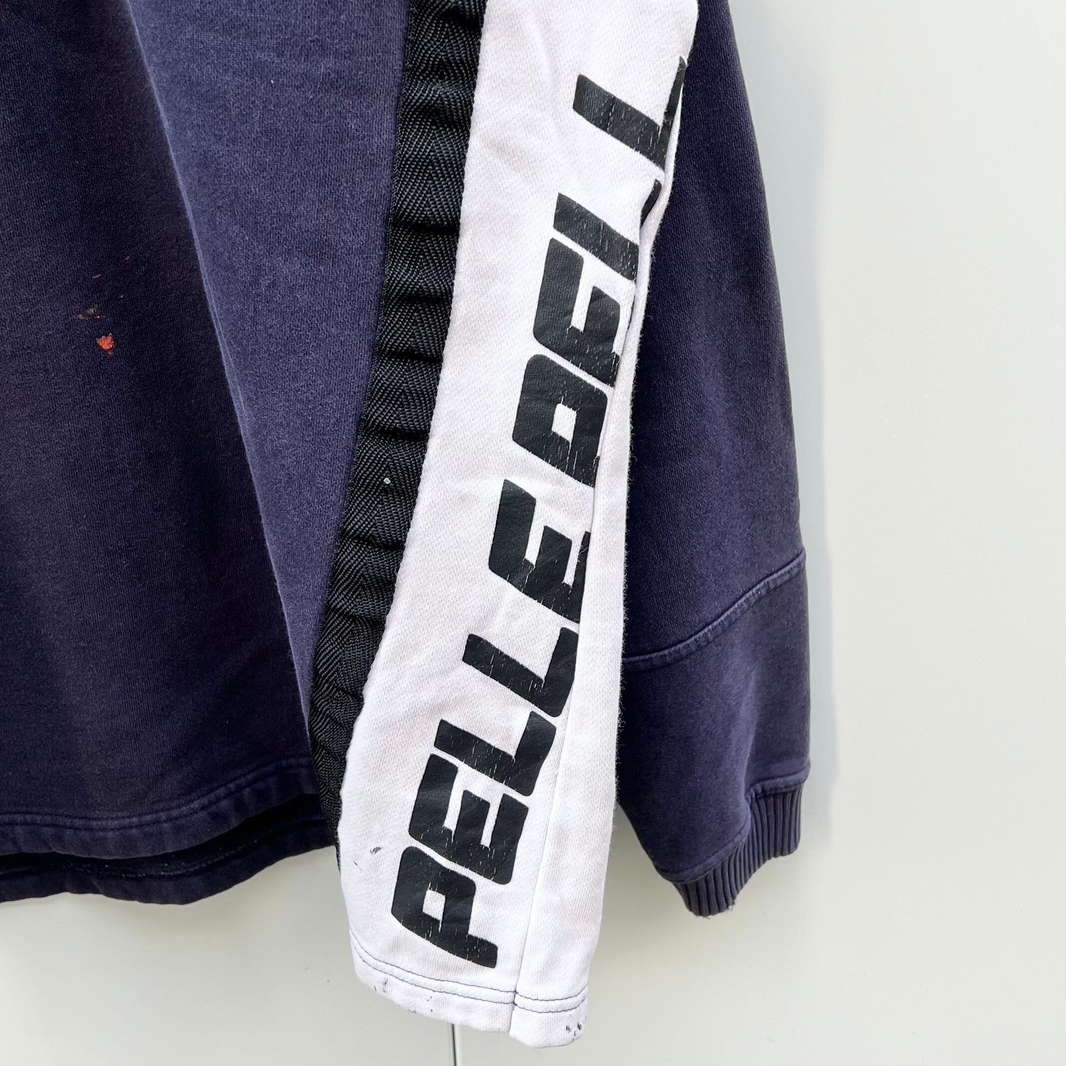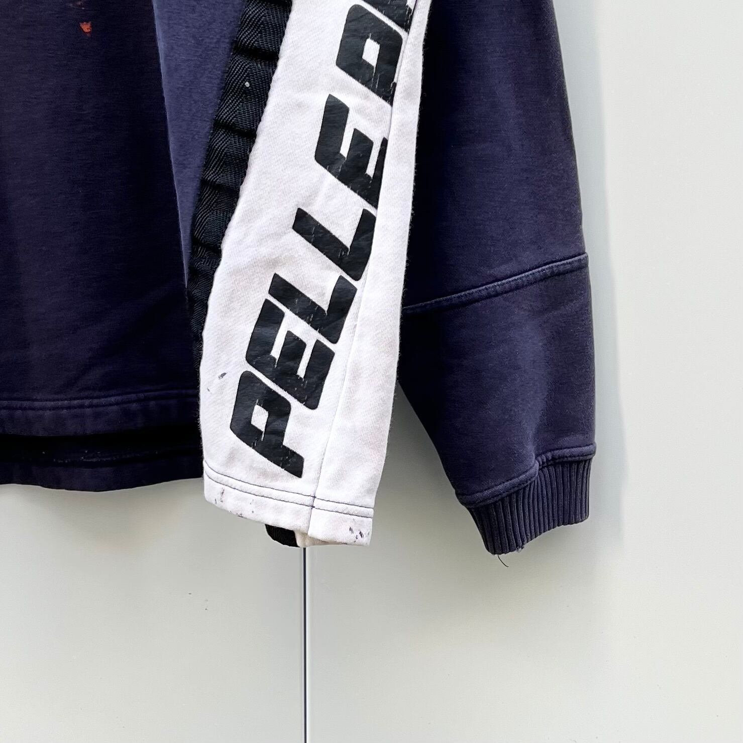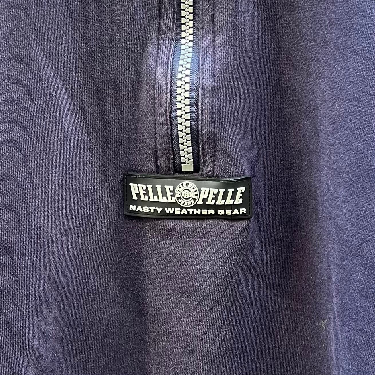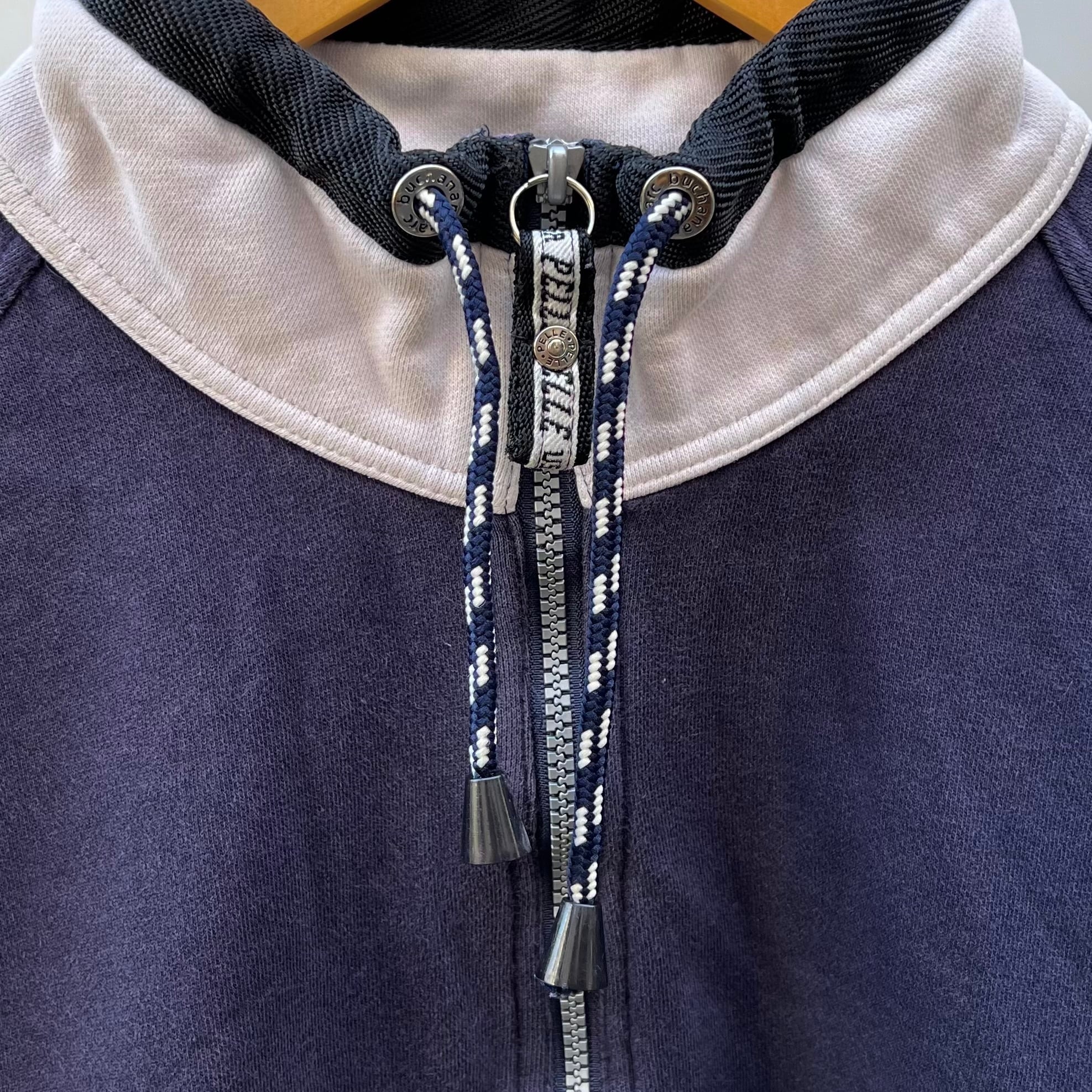 ネイビーxホワイトxブラックラインの裏起毛素材、フロント中央にラバーネーム、左サイドにPELKE PELLEプリント、右サイドにWEATHER GEAR G906-22プリント、ロゴテープのジッパースライダー、襟にドローコード、ハーフジップのシンプルデザインです。