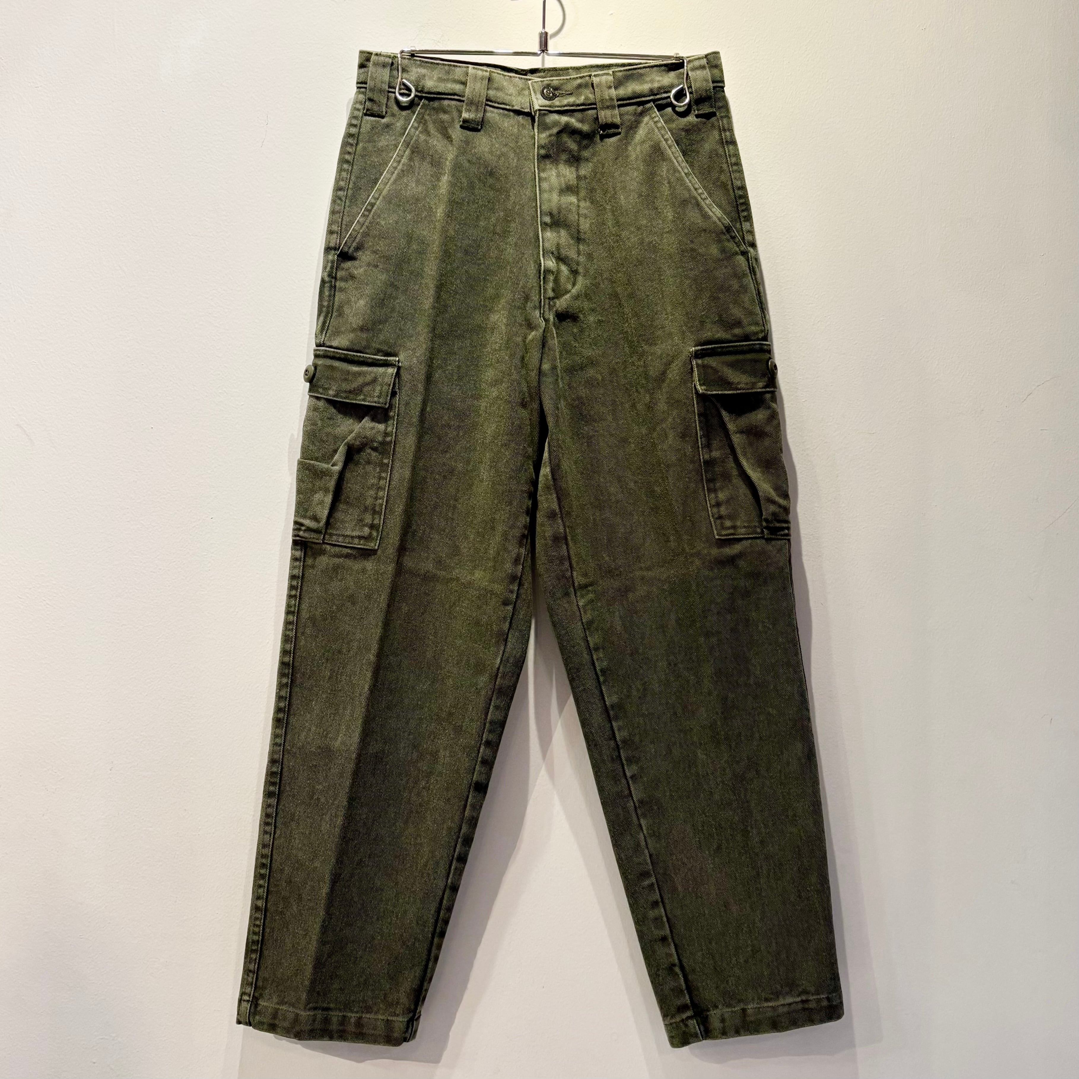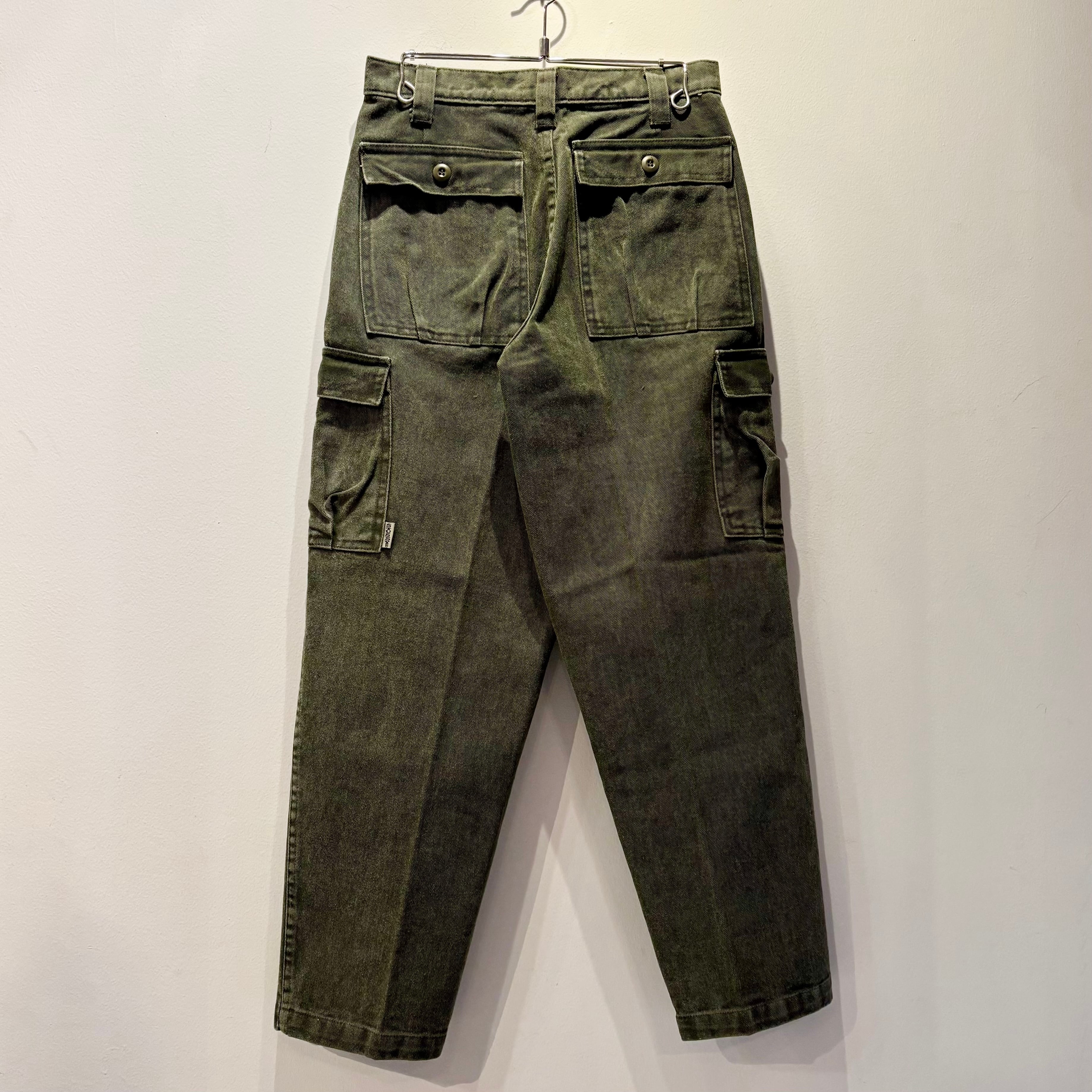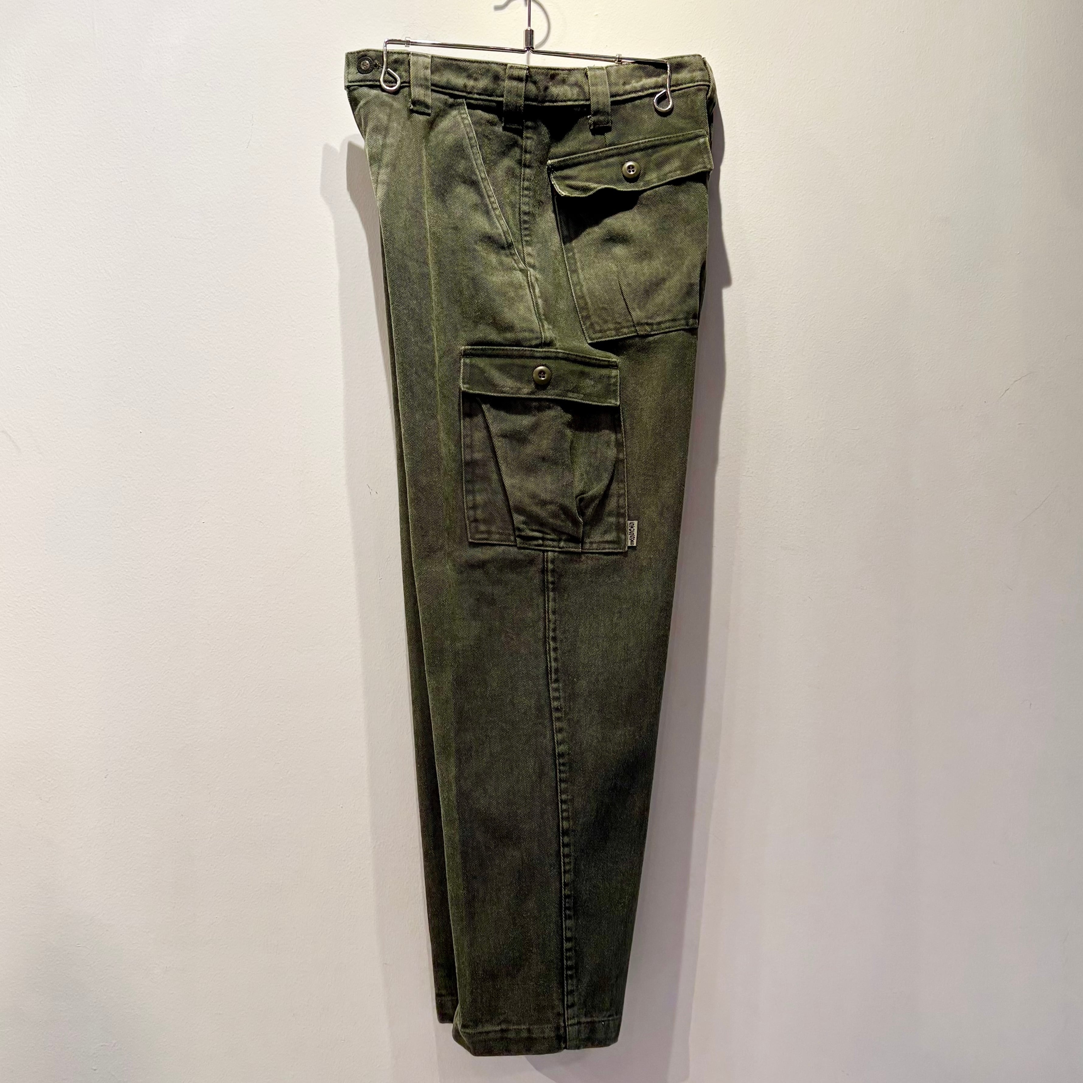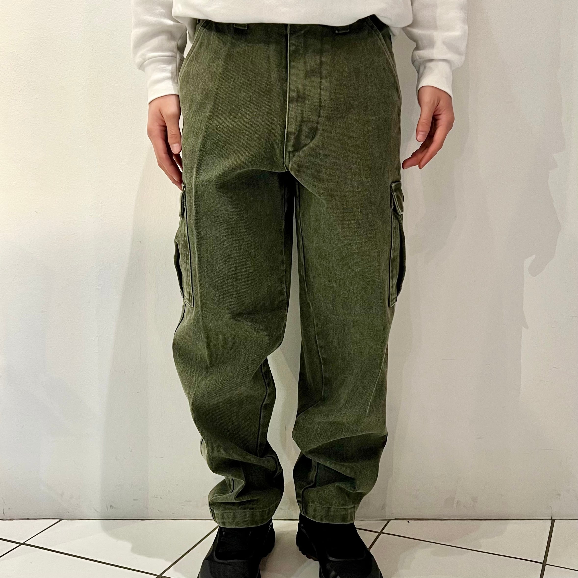 ウォッシュドオリーブグリーンデニムのコットン素材、左カーゴポケットにピスネーム、両サイドにカーゴポケット、フラップ付きバックポケットが付いたカーゴパンツ型デザインです。