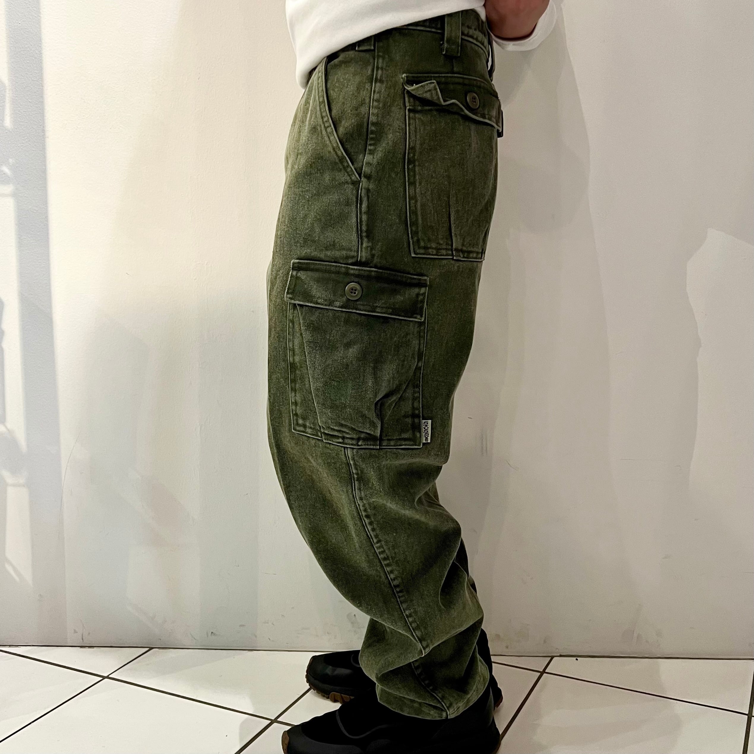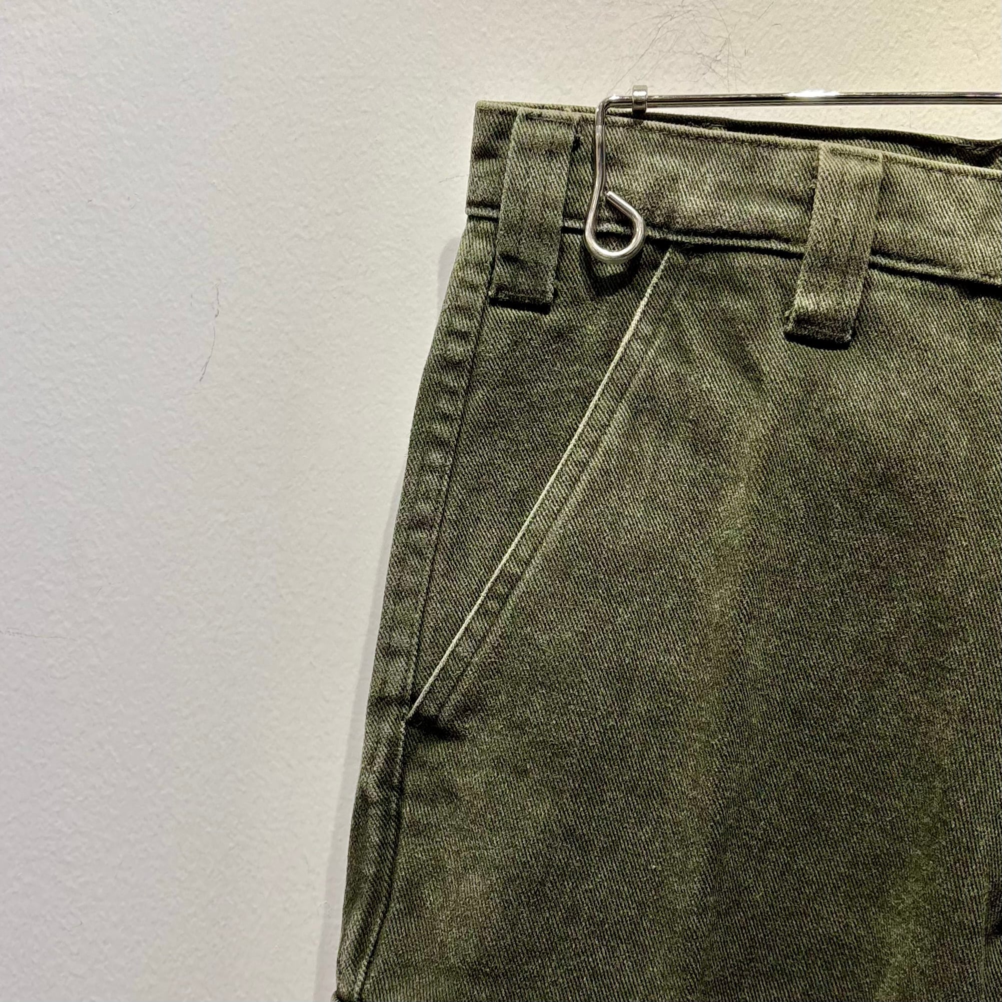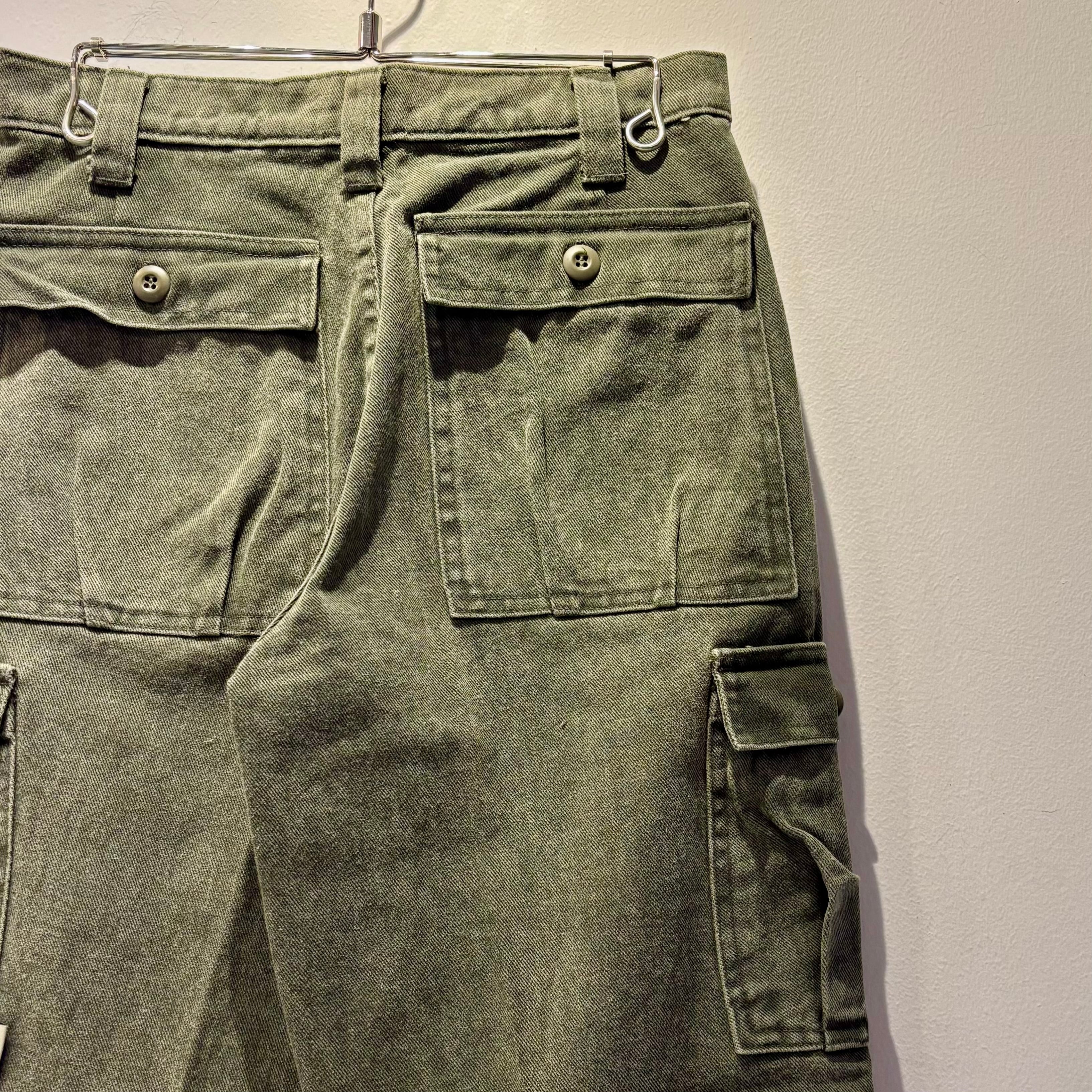 ウォッシュドオリーブグリーンデニムのコットン素材、左カーゴポケットにピスネーム、両サイドにカーゴポケット、フラップ付きバックポケットが付いたカーゴパンツ型デザインです。
