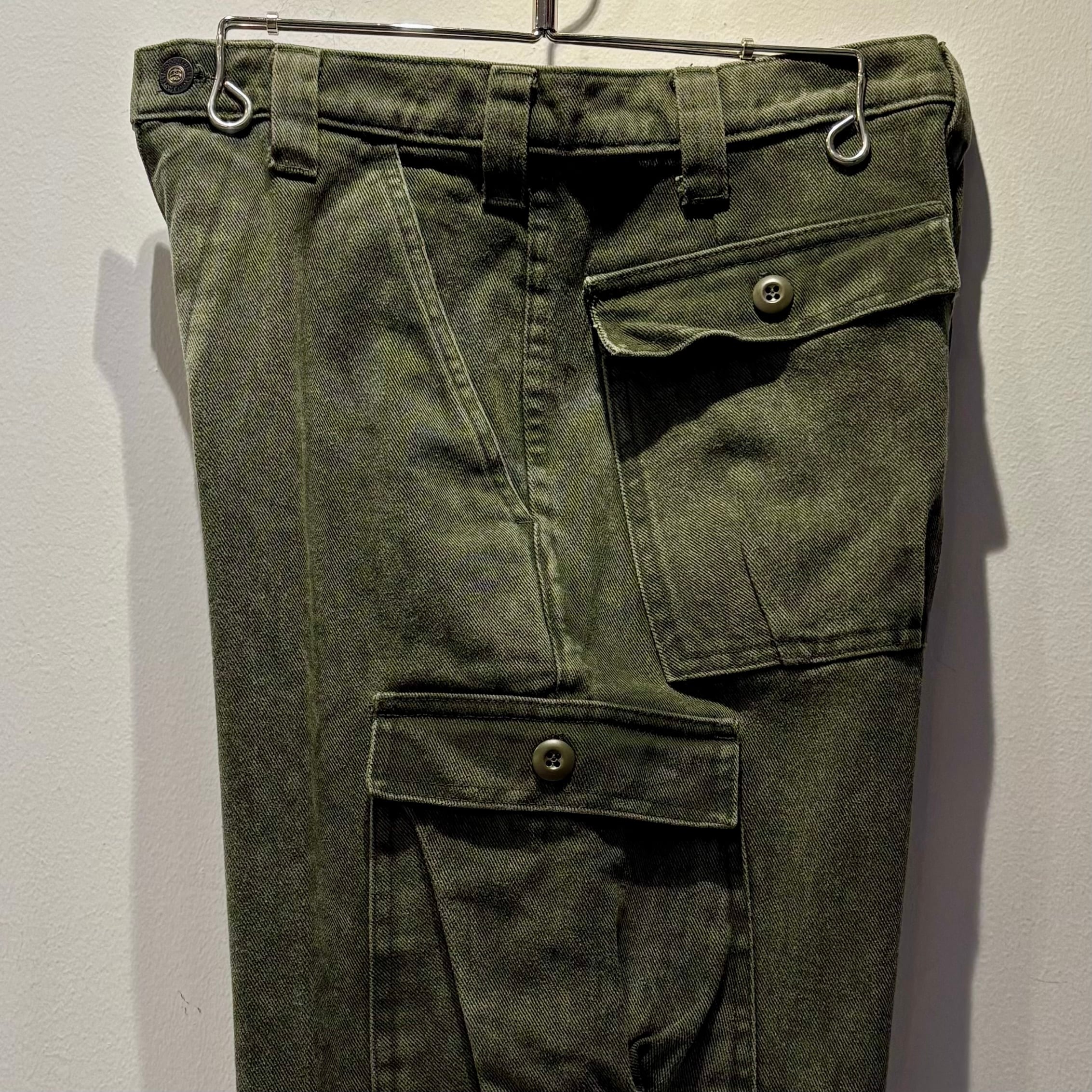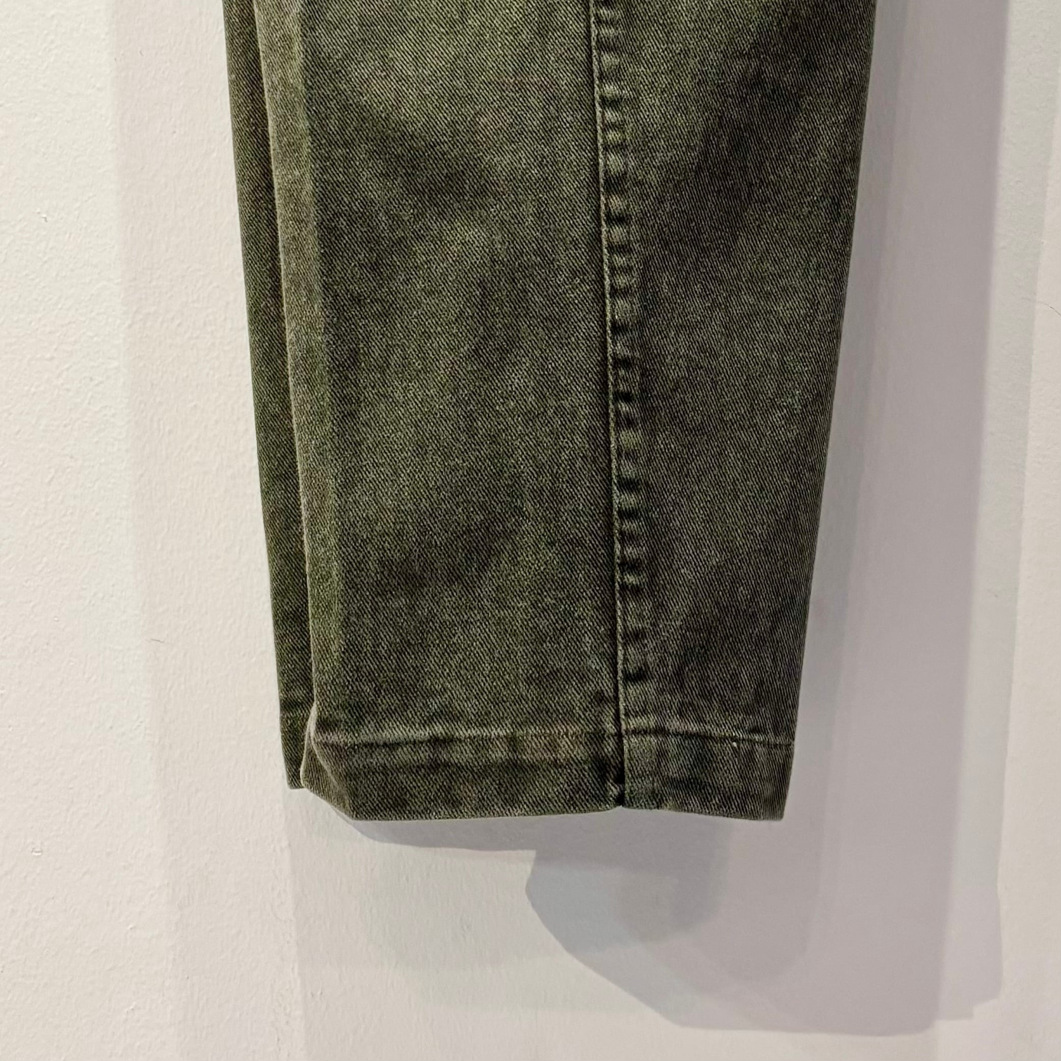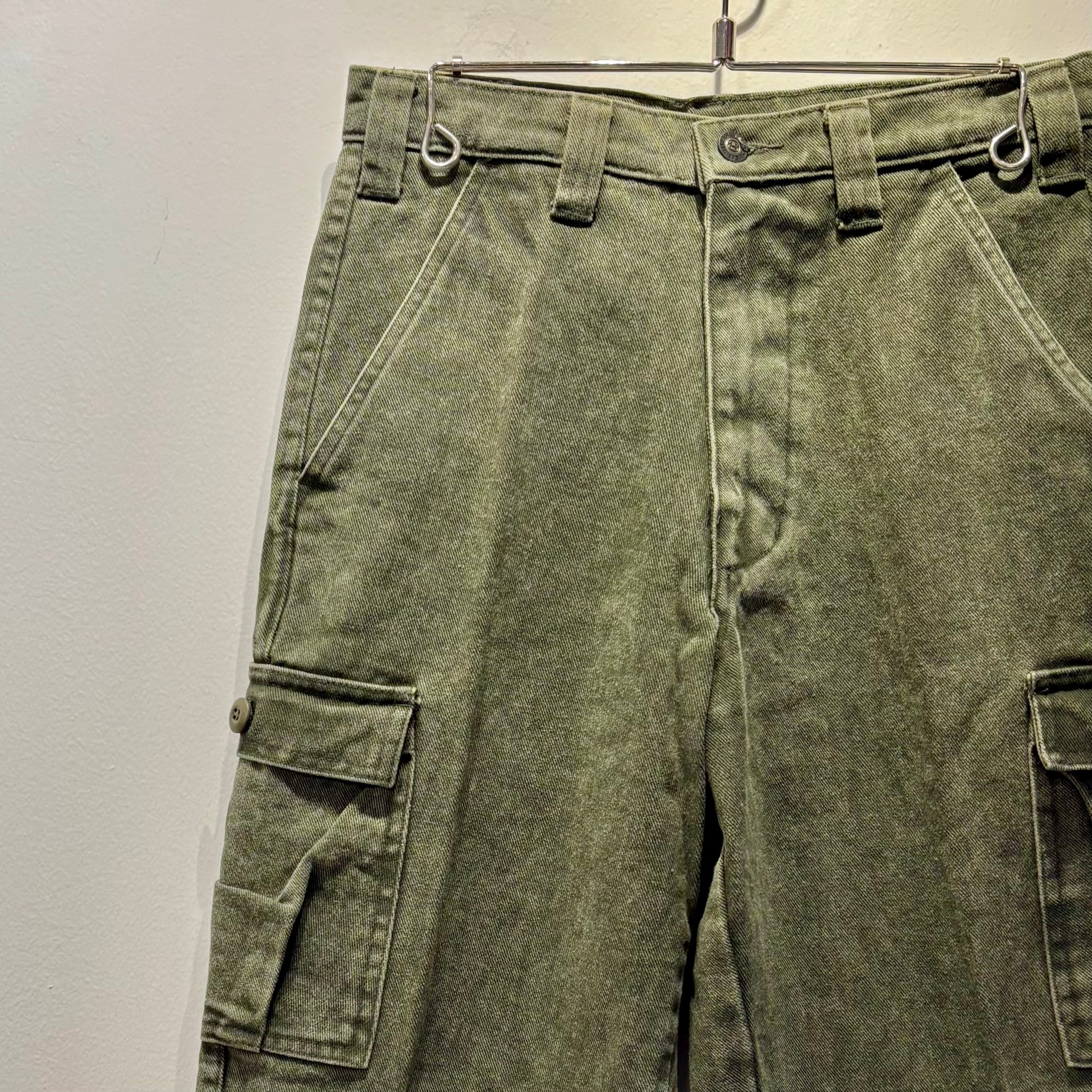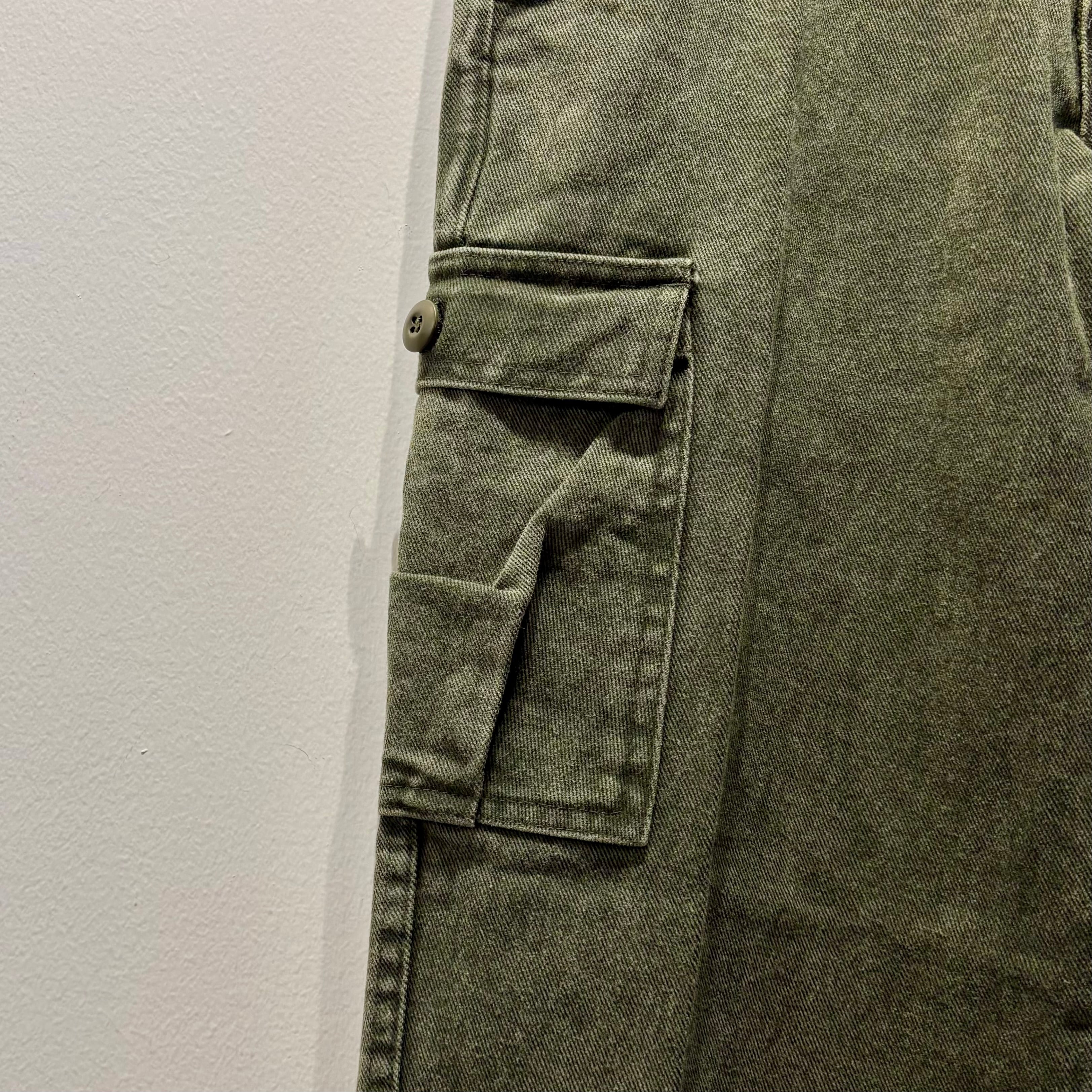 ウォッシュドオリーブグリーンデニムのコットン素材、左カーゴポケットにピスネーム、両サイドにカーゴポケット、フラップ付きバックポケットが付いたカーゴパンツ型デザインです。