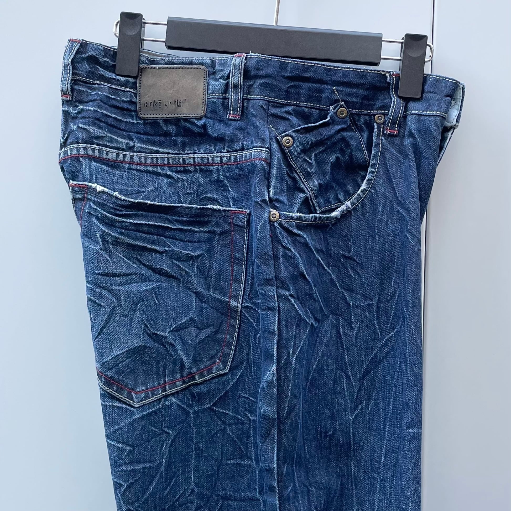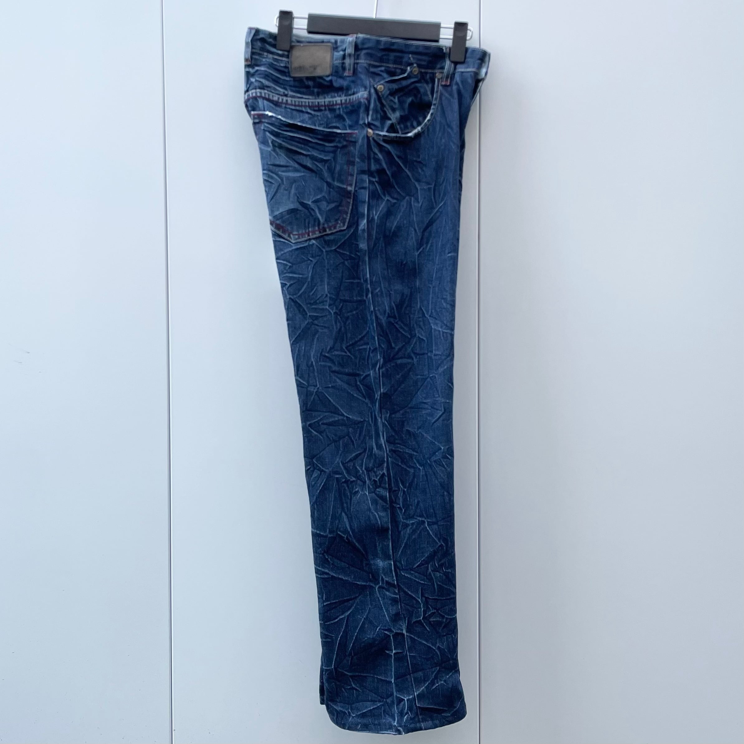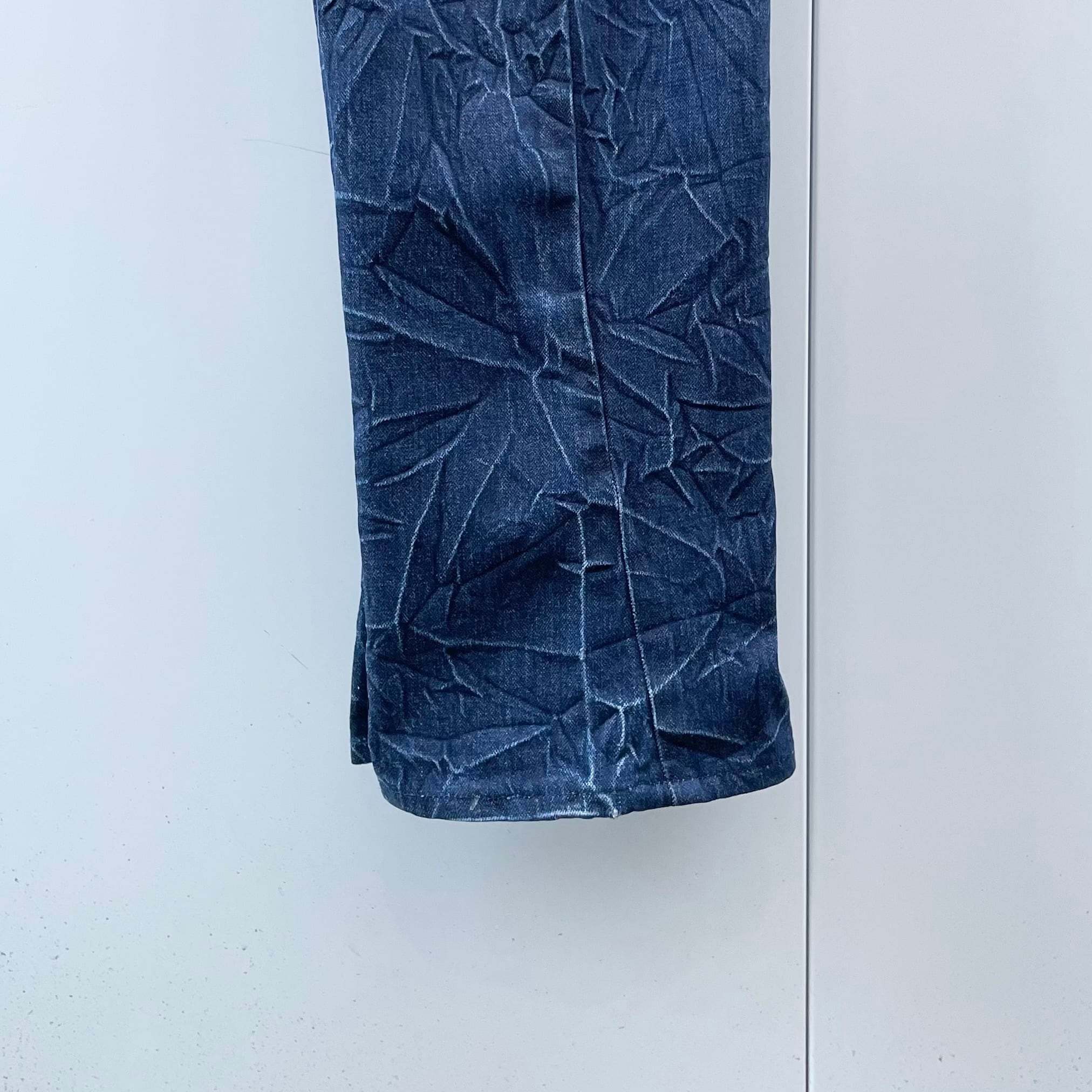 ウォッシュドシワ加工ブルーデニム、左バックポケットにかけてロゴプリント、1972刺繍、ロゴ入りボタン、リベットの付いた5ポケット型デザインです。