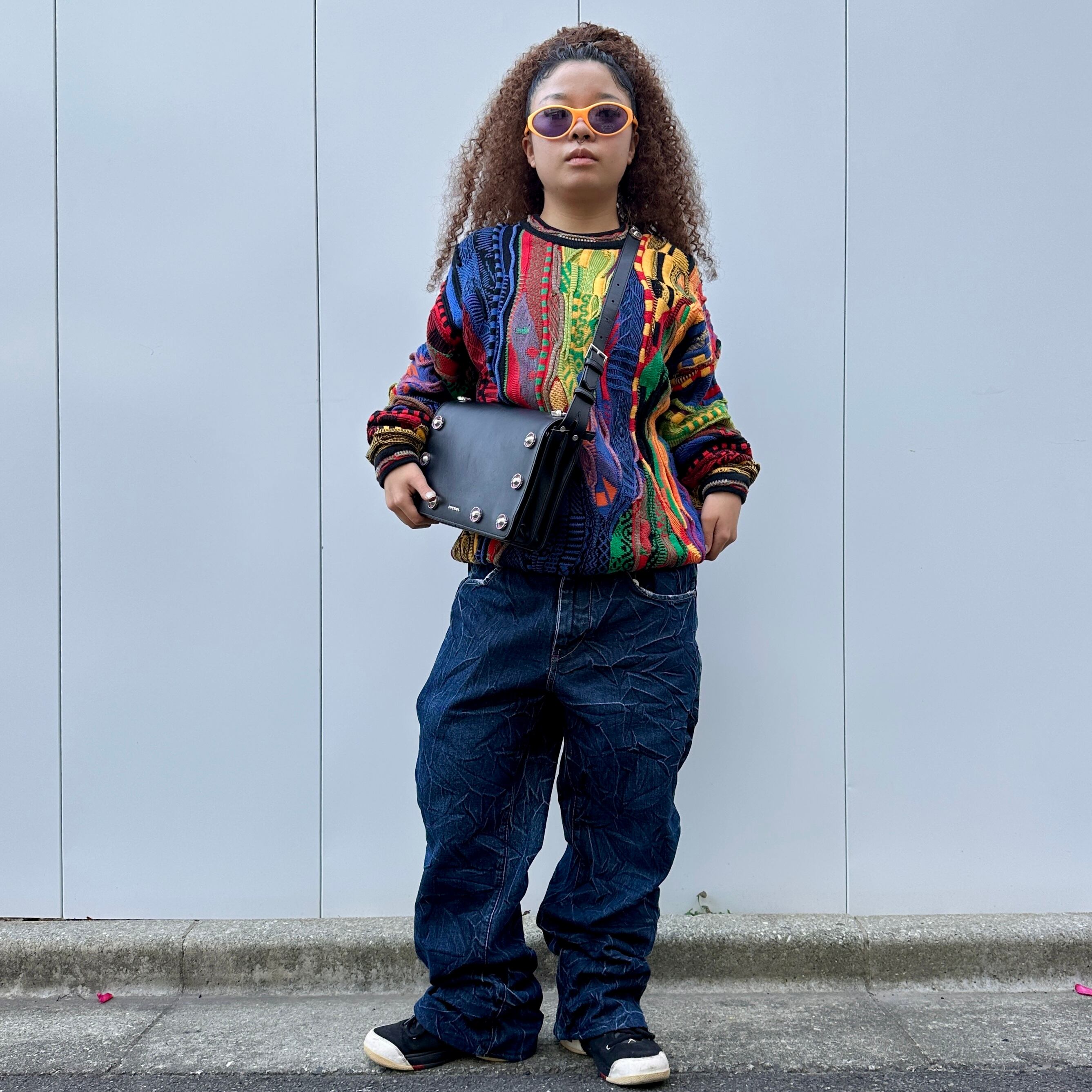 ・フロントフラップに10個のサークル状のメタルチャーム、メタルロゴ
