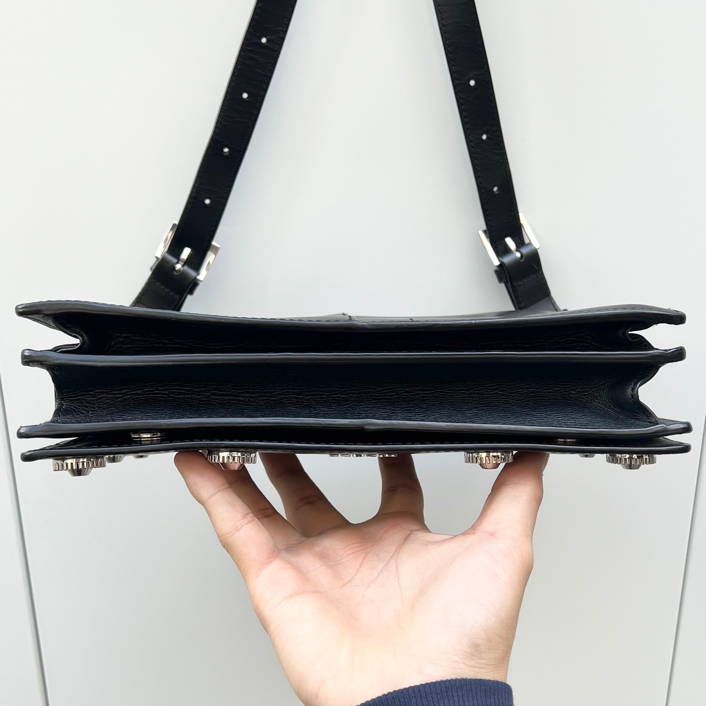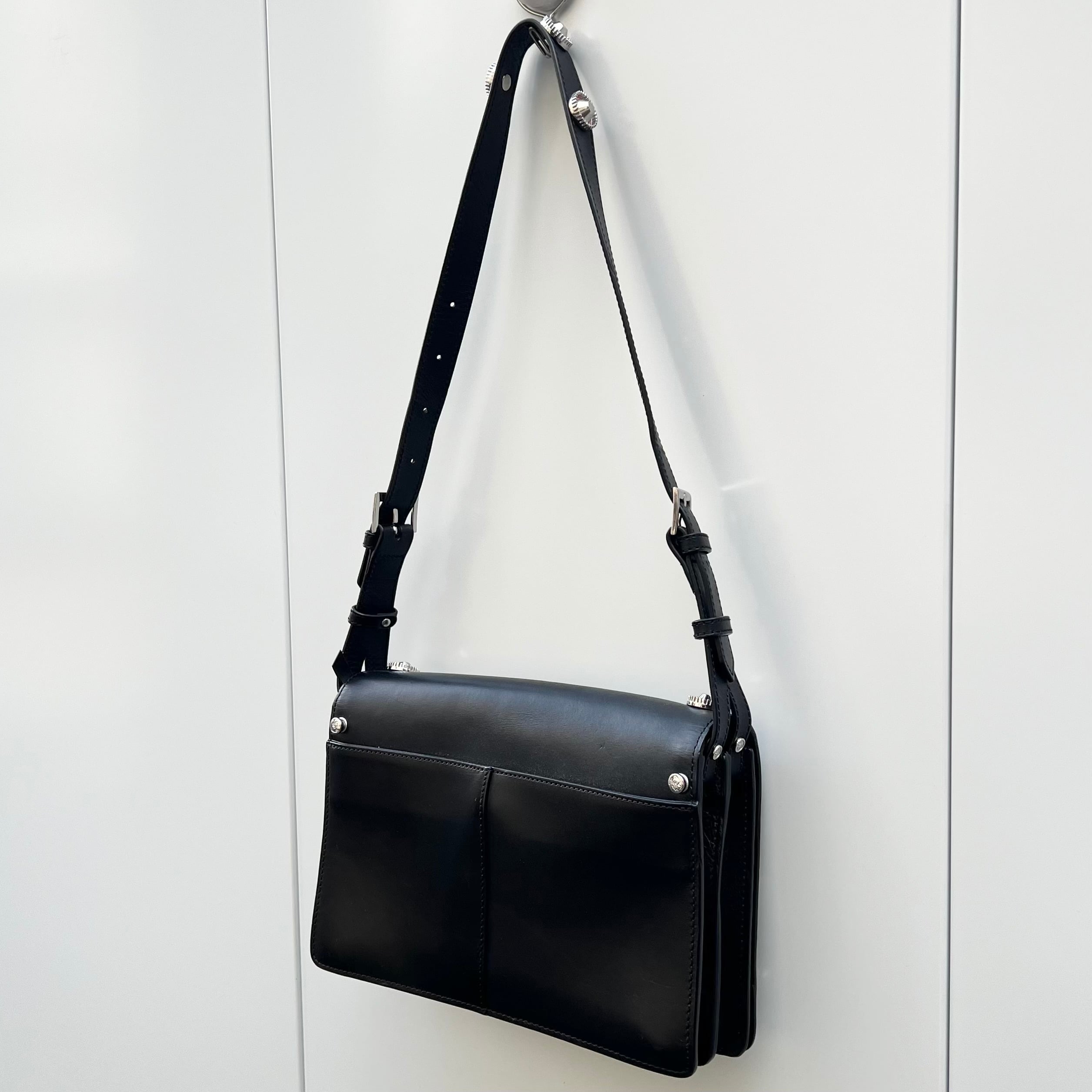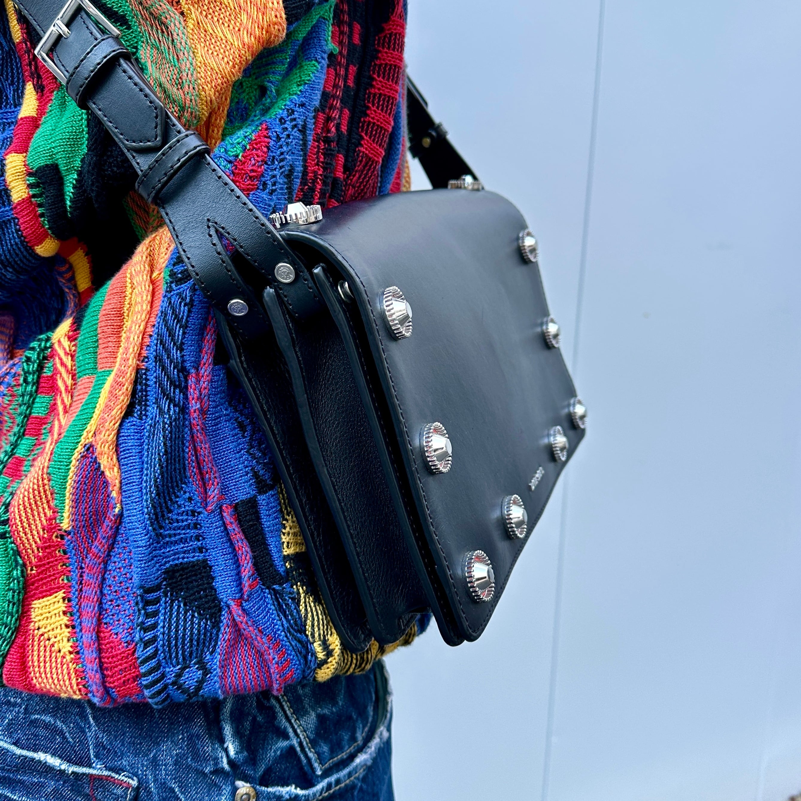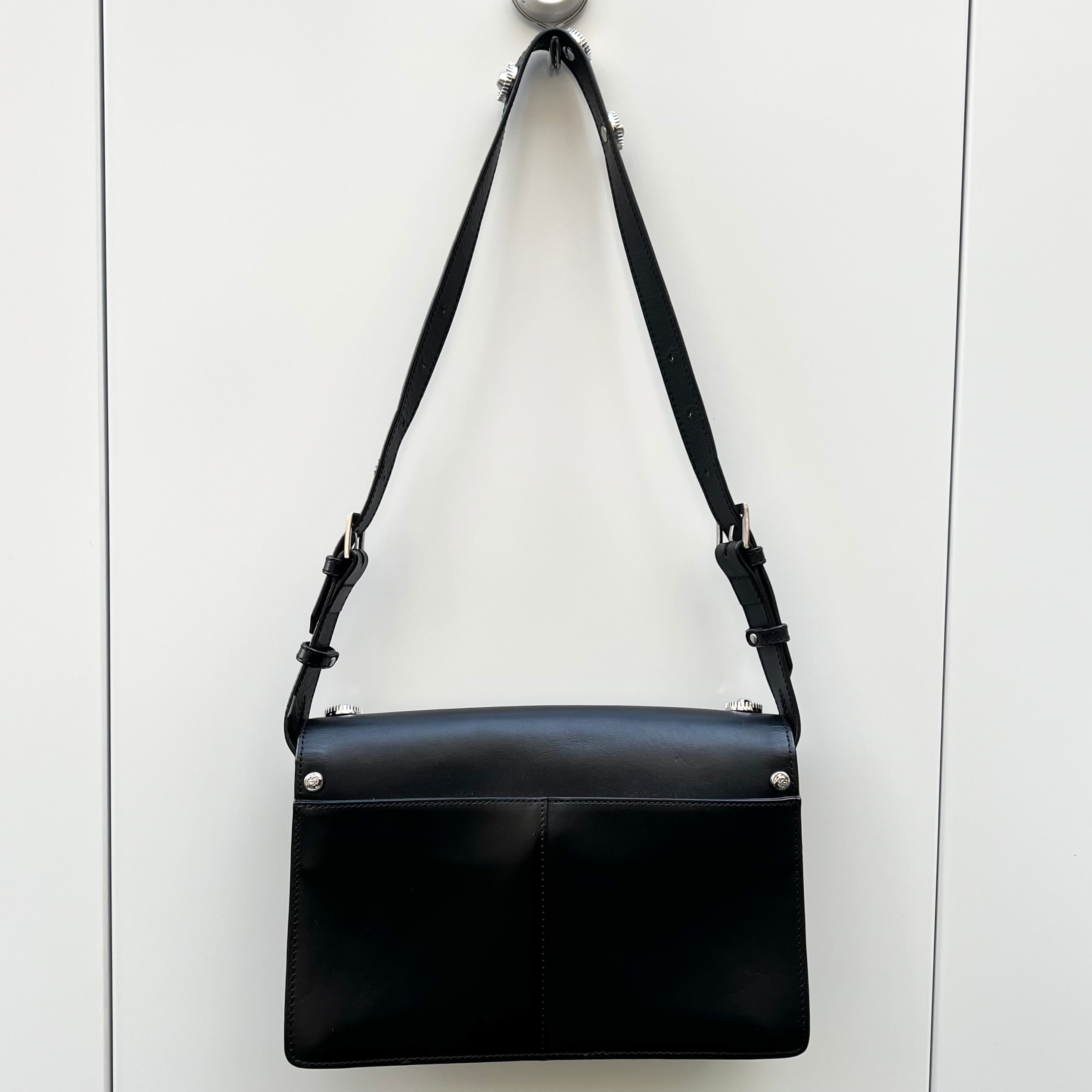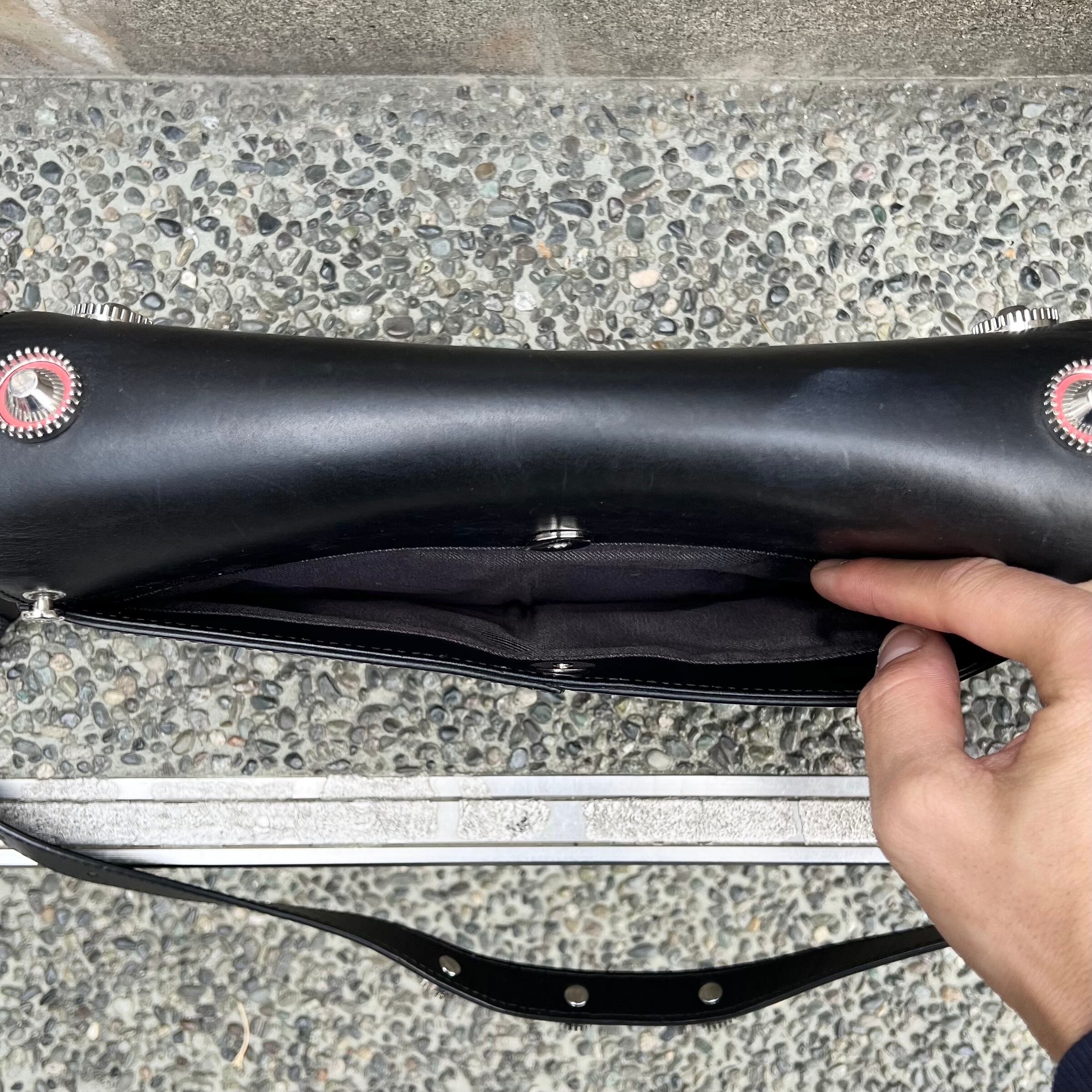 ブラックレザー、フラップで開閉、ジッパー付きを含む3つのポケット、フロントフラップに10個のサークル状のメタルチャーム、メタルロゴ、ジッパー付き内ポケット、背面にポケット、脱着式ストラップが付いたデザインです。