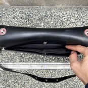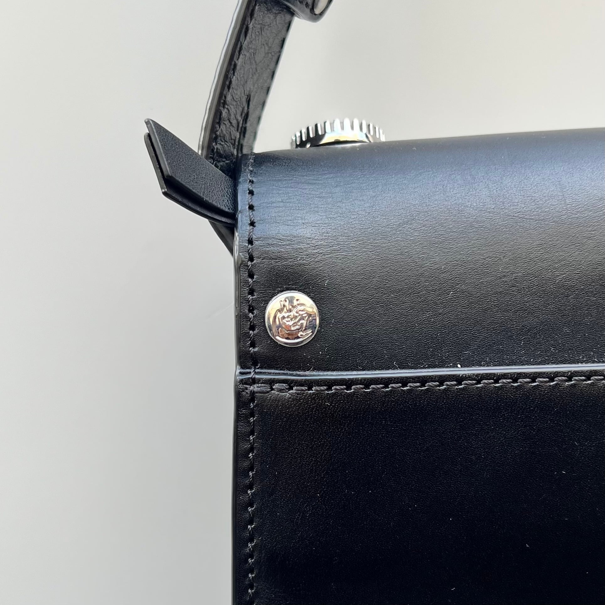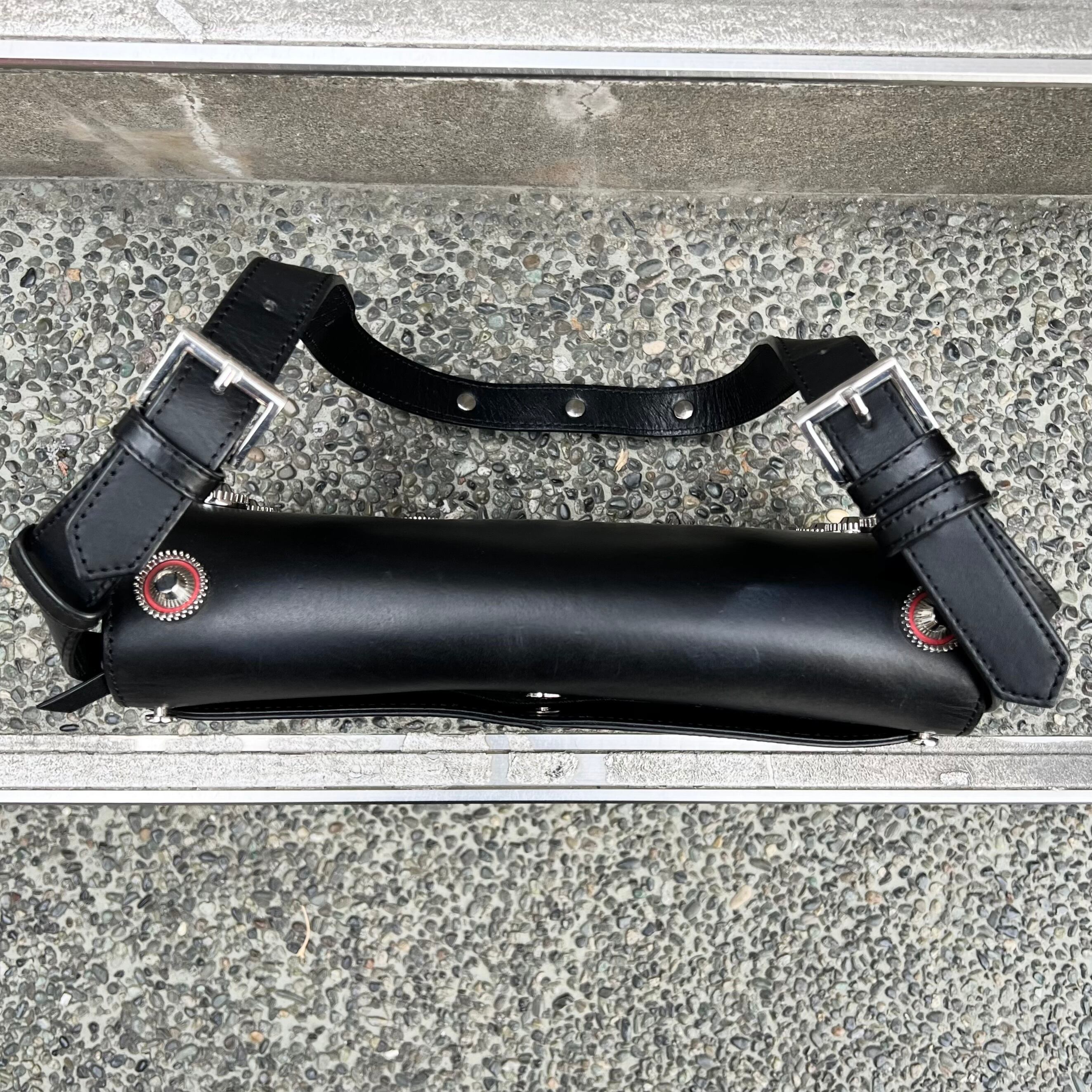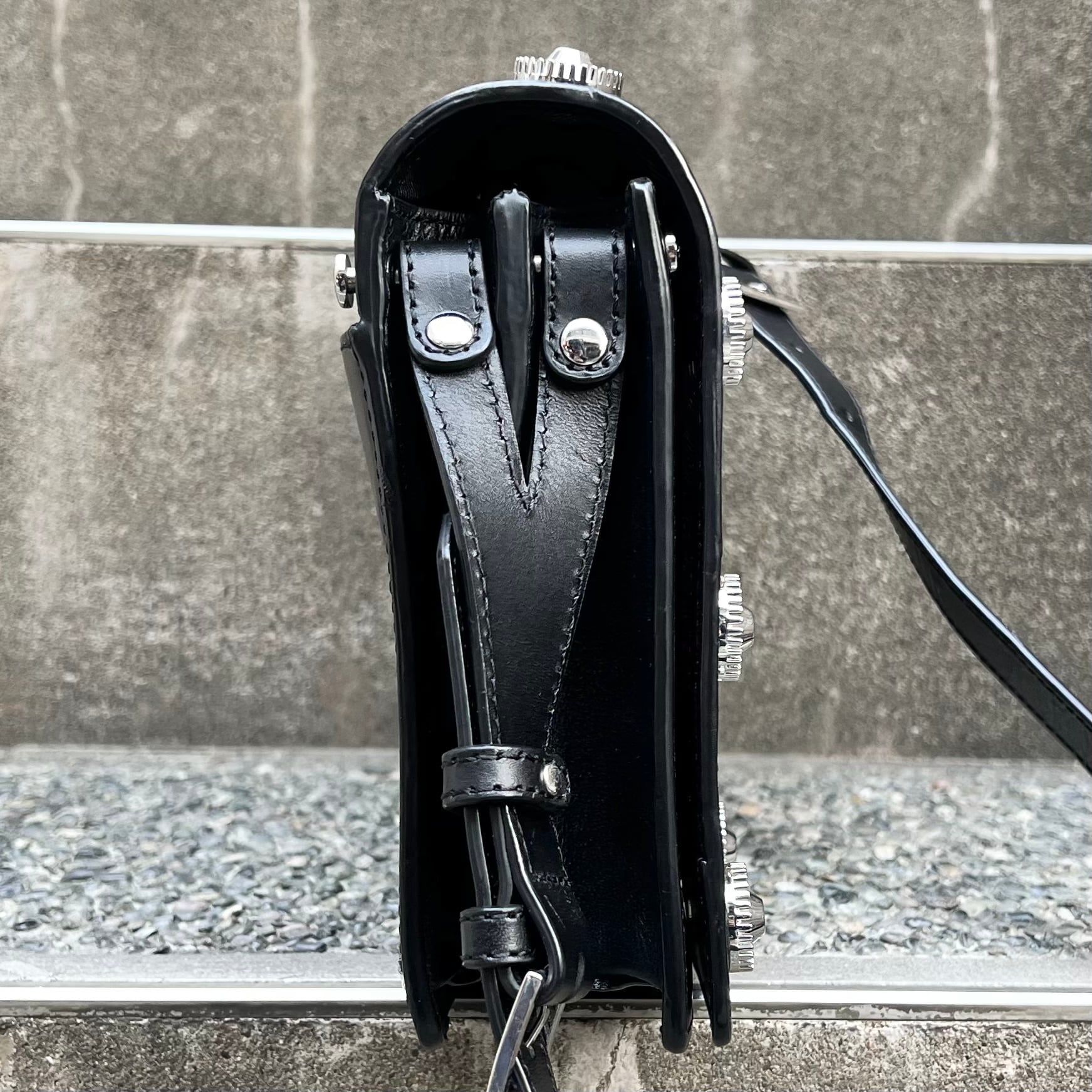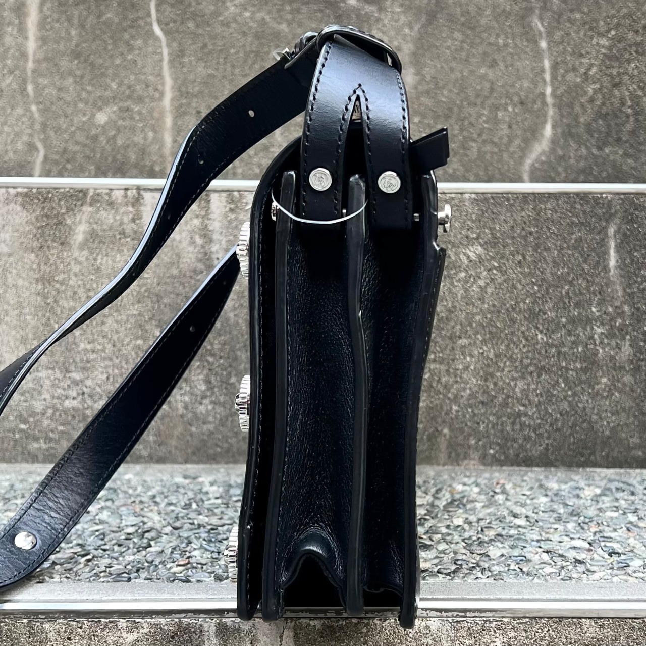 ブラックレザー、フラップで開閉、ジッパー付きを含む3つのポケット、フロントフラップに10個のサークル状のメタルチャーム、メタルロゴ、ジッパー付き内ポケット、背面にポケット、脱着式ストラップが付いたデザインです。