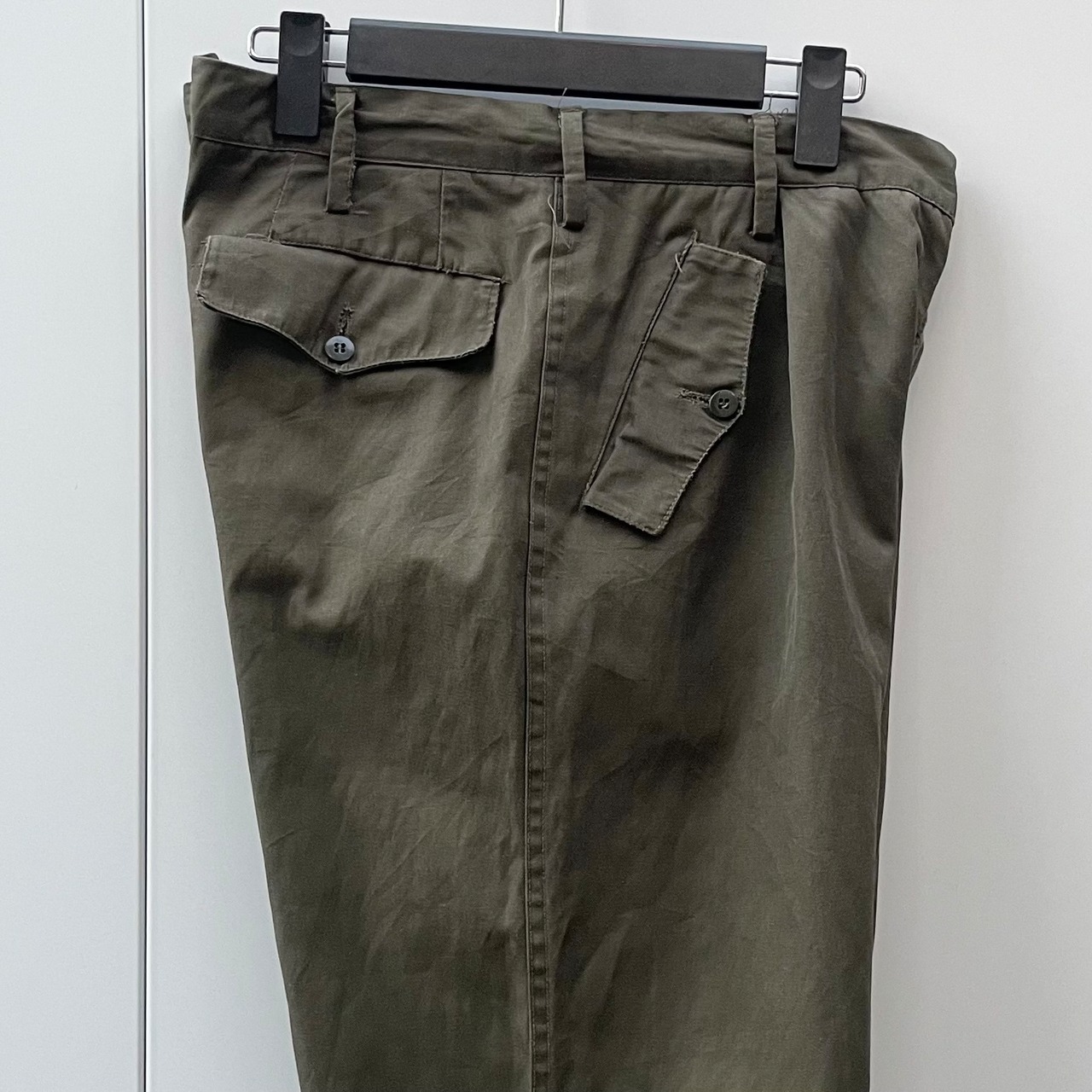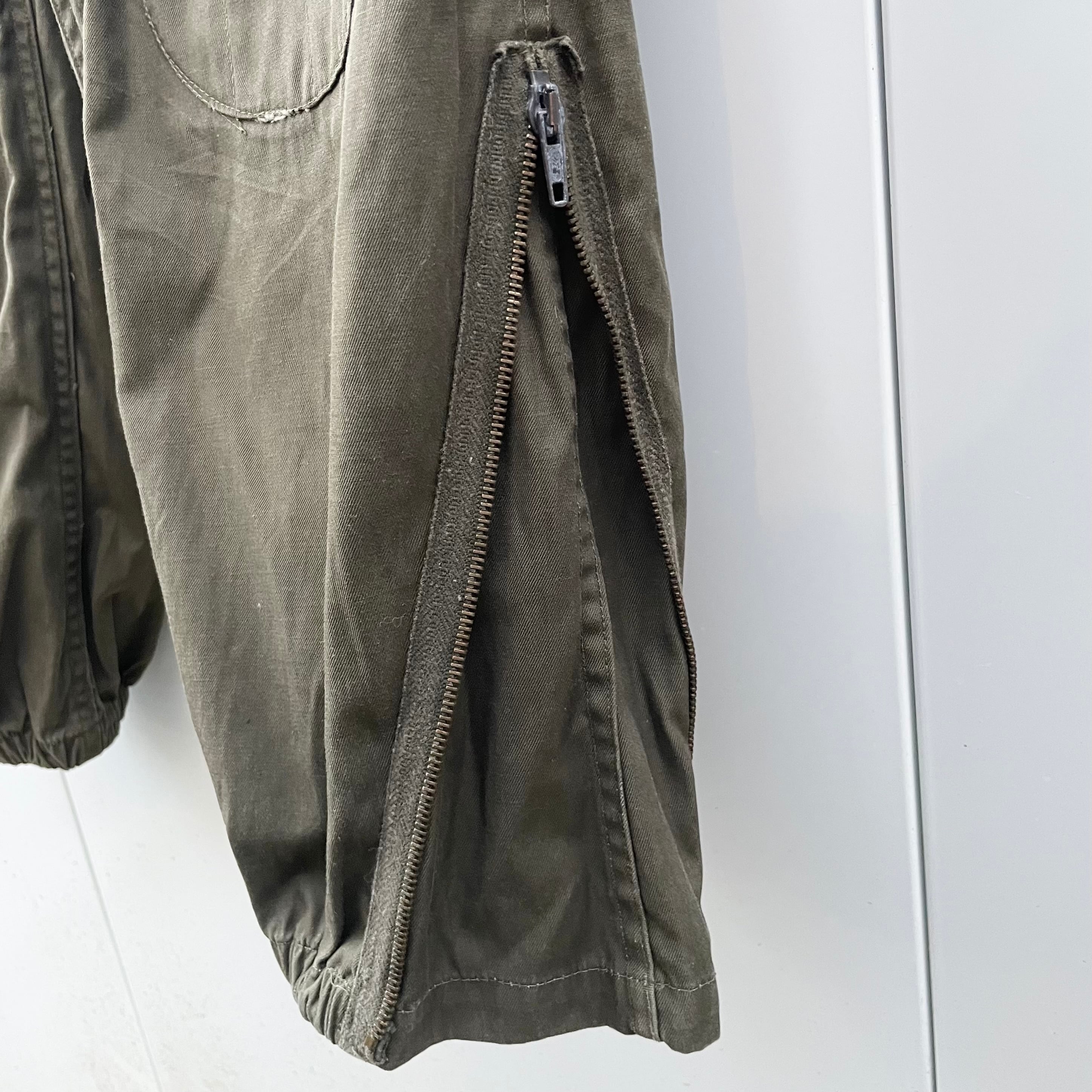 オリーブグリーンのコットン系素材、フラップ付きハンドウォームポケット、ニーパッド、フラップ付きバックポケット、裾の両サイドにジッパーで開閉するデザインです。