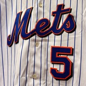 ホワイトxブルーストライプのポリエステル素材、フロントにMetsと5ワッペン、左袖にCロゴマークワッペンとRマーク刺繍、バックに大きくSHINJO 5のワッペンが付いた豪華デザインです。