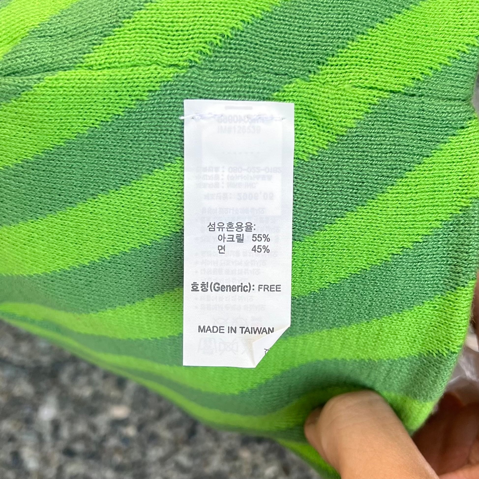 ライトグリーン/グリーンストライプxグリーンストライプのリバーシブル、裾にピスネームの付いたデザインです。