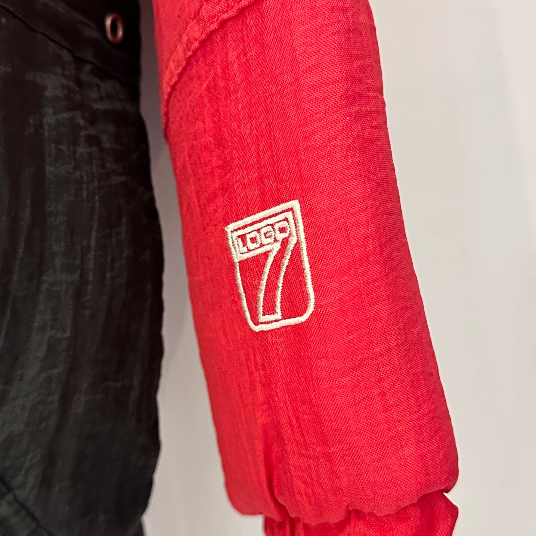 ブラックxレッドxホワイトのナイロン素材、左胸にロゴとロゴマーク刺繍、バックに大きくBULLSとロゴマーク刺繍、左袖にLOGO7マーク刺繍、スナップボタンでフード脱着するデザインです。