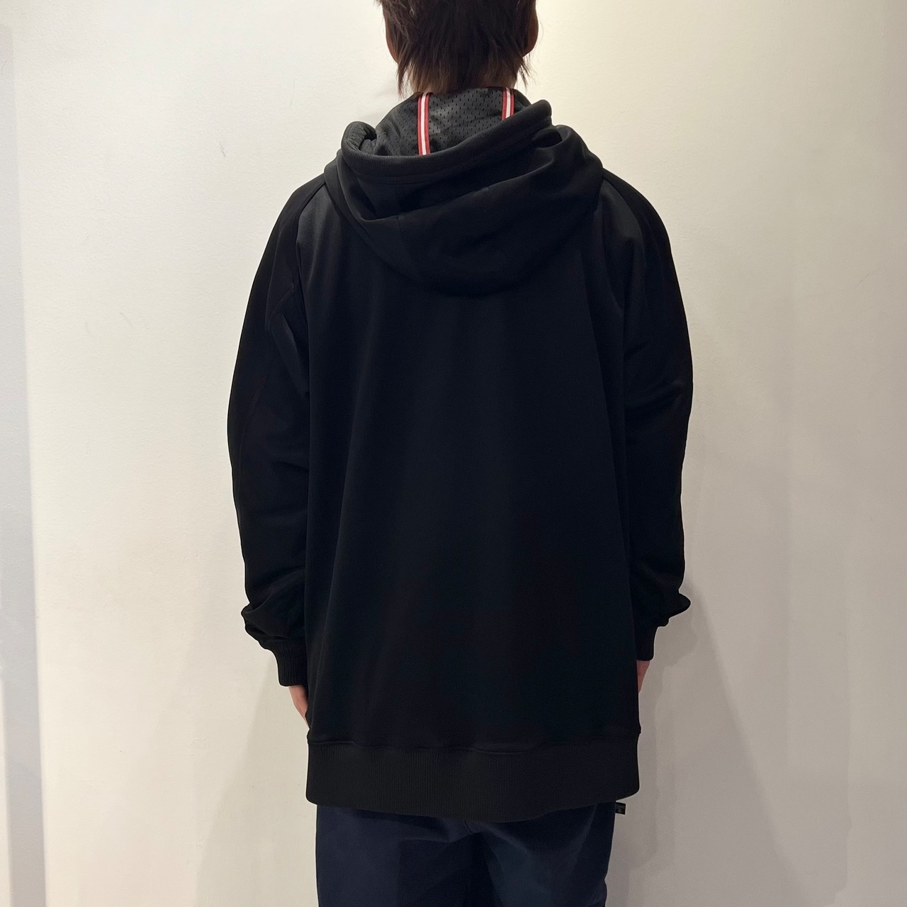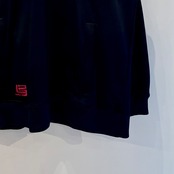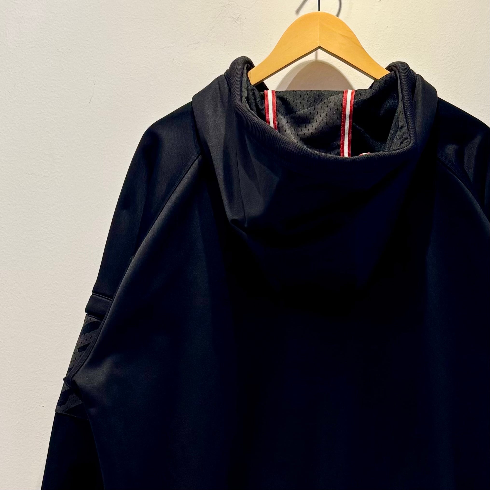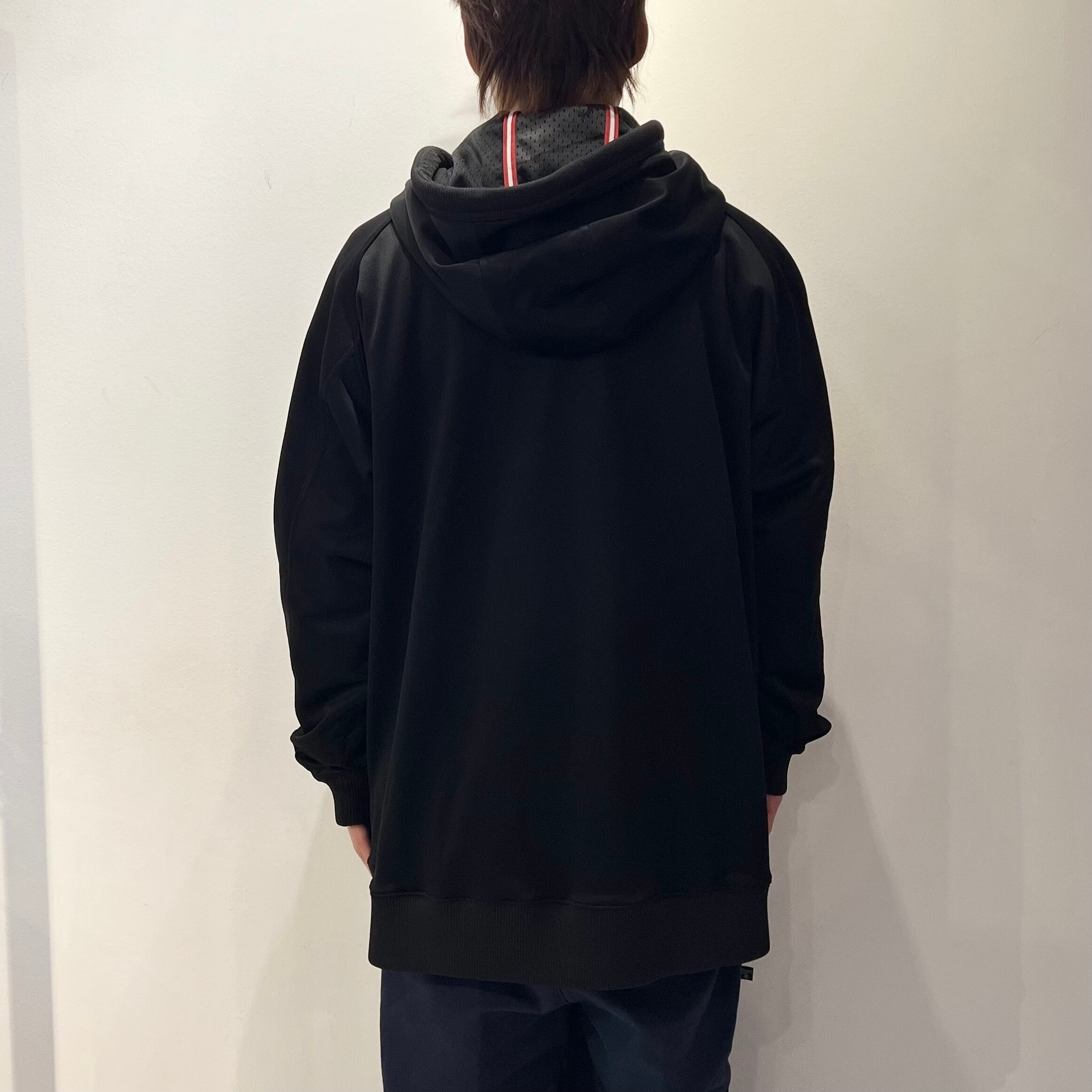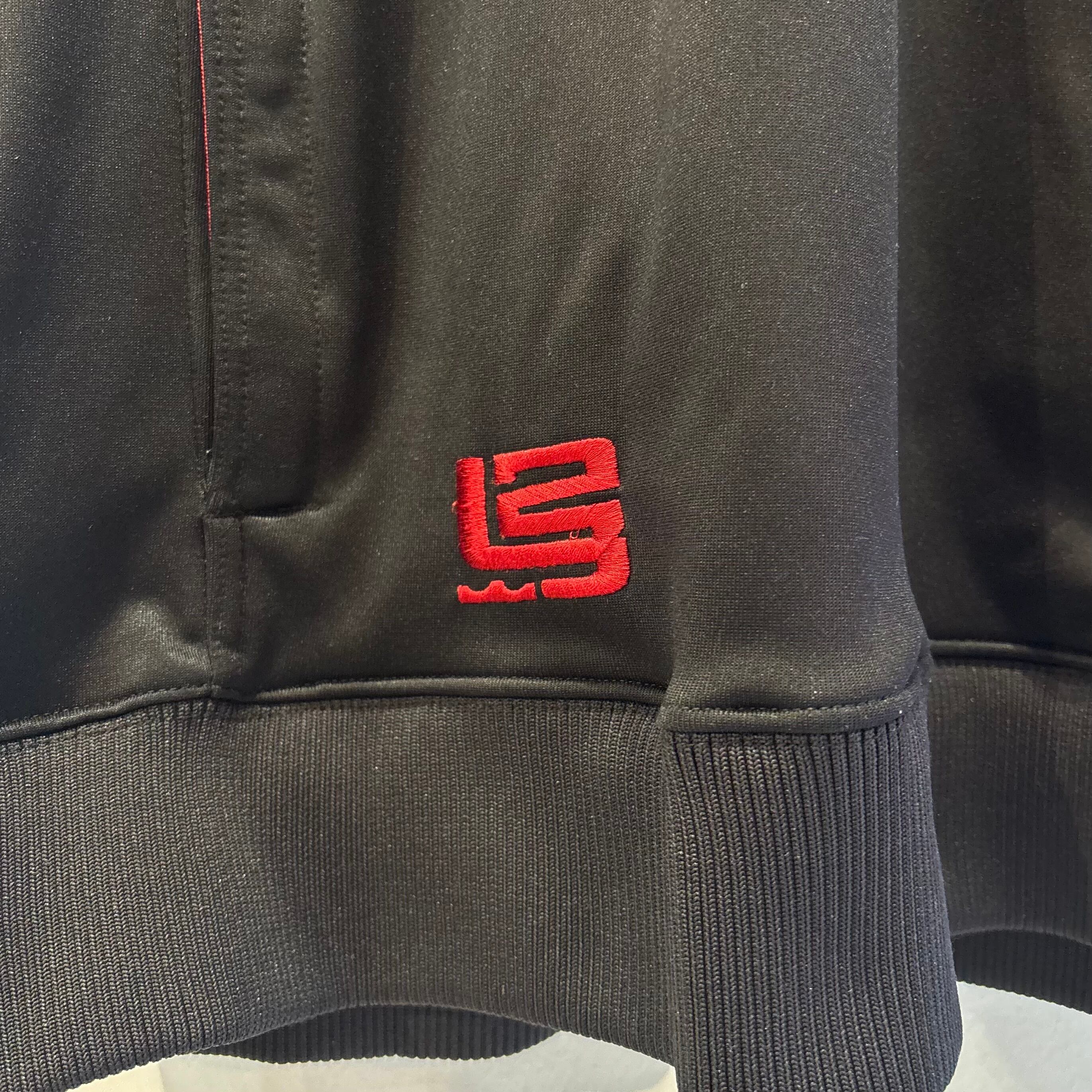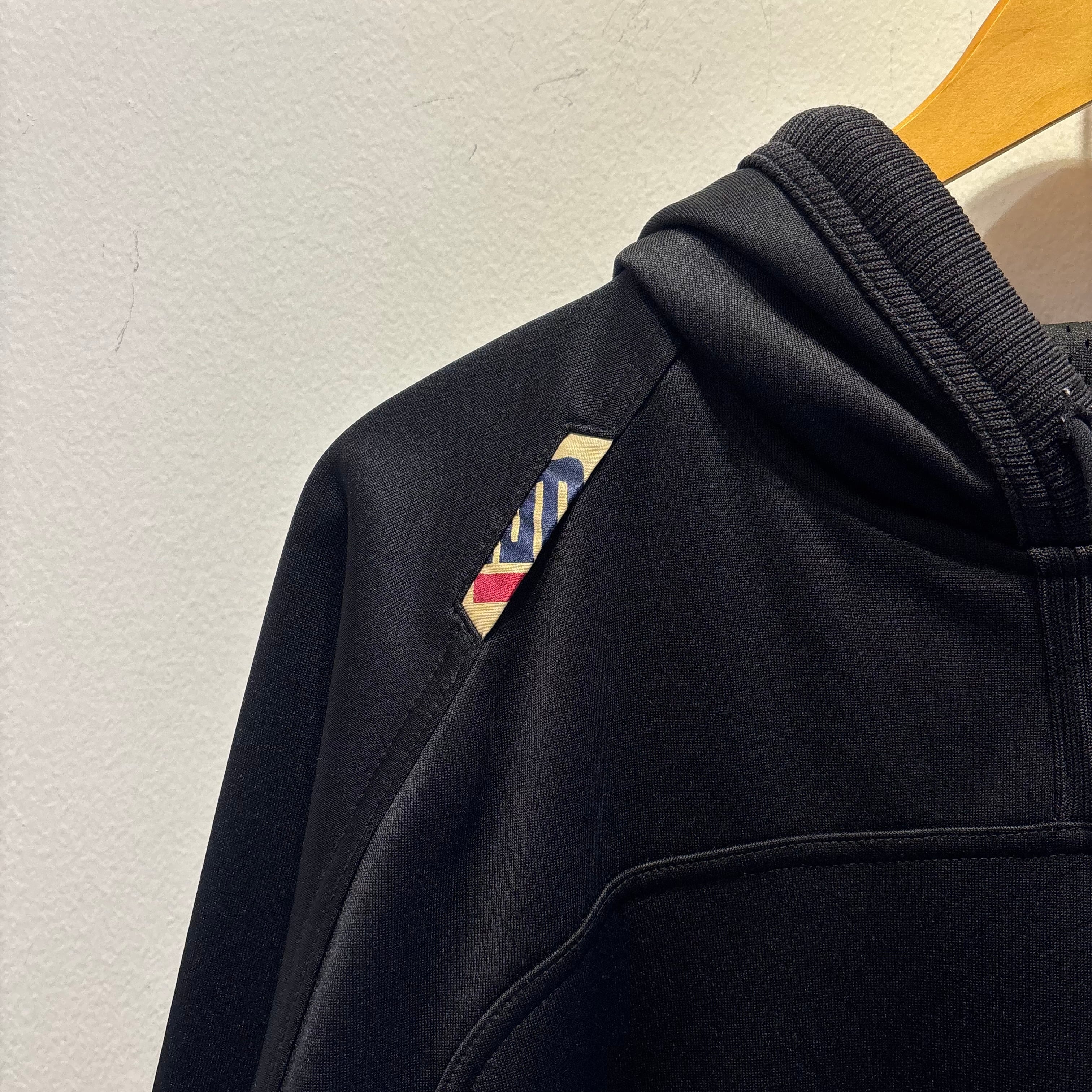 ブラックのジャージ素材、左胸にスウォッシュ刺繍、右肩に23ネーム、右裾にロゴマーク刺繍、左袖にロゴマーク入りのジッパー付きポケット、両サイドにジッパー付きハンドウォームポケットの付いたデザインです。