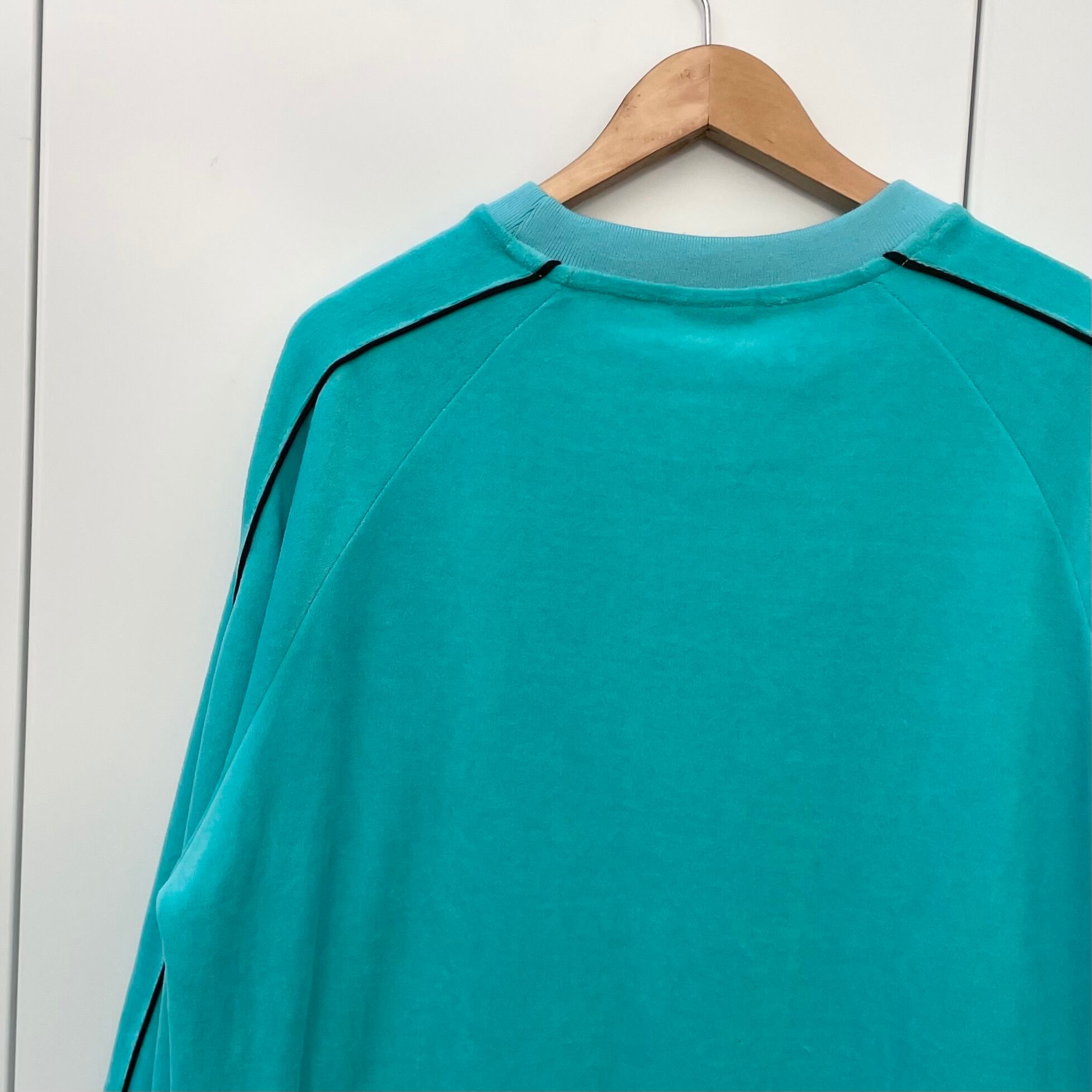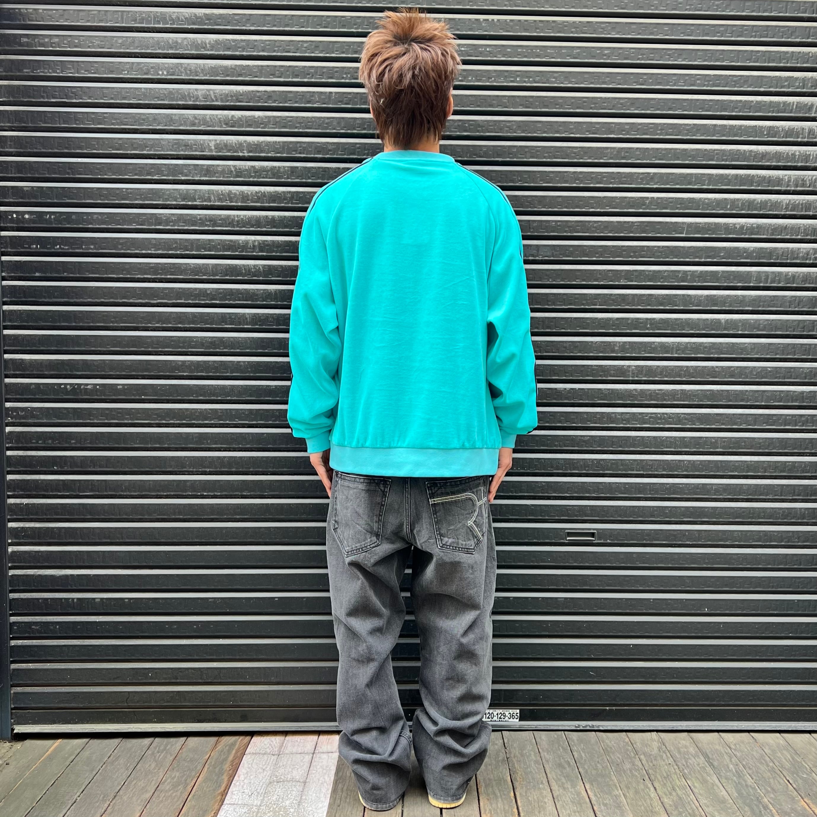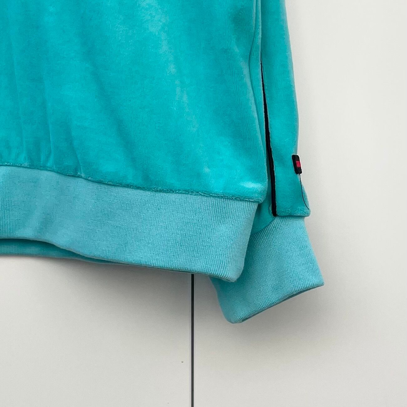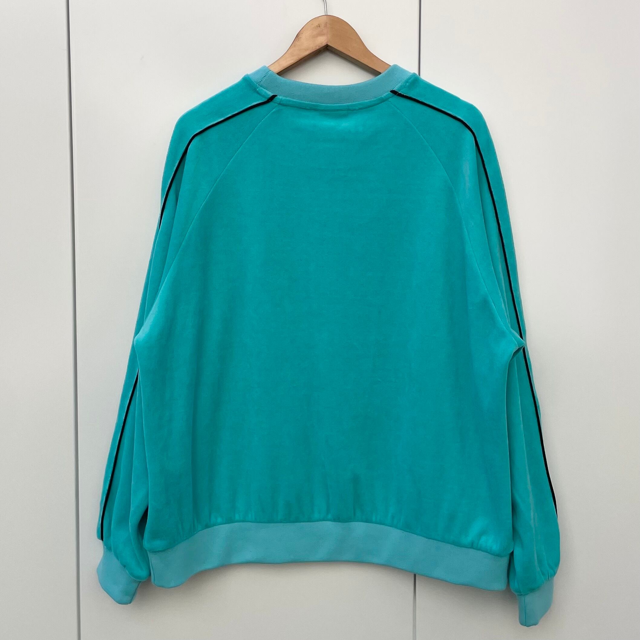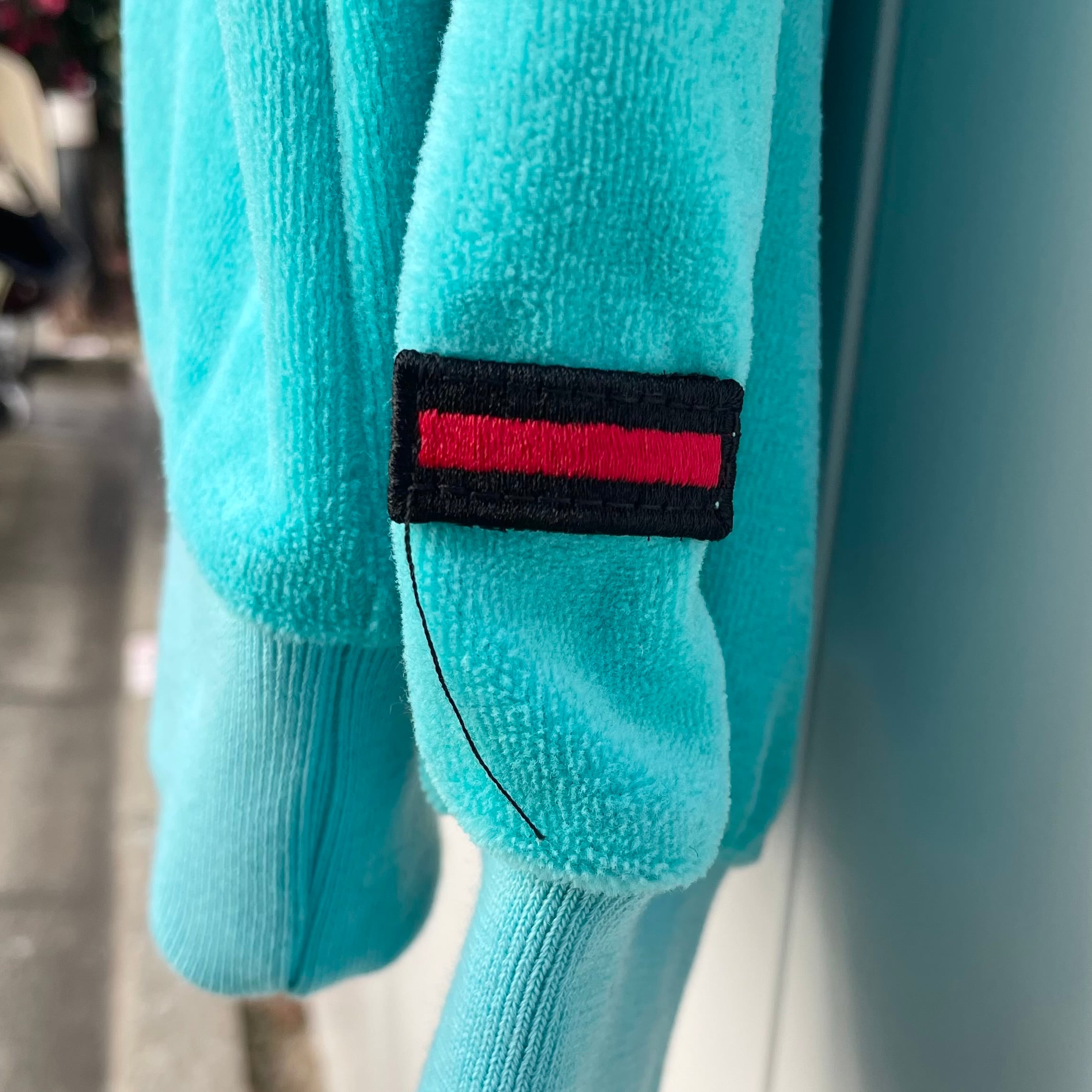 ミントグリーンのベロア素材xブラックパイピング、フロントにロゴ刺繍、左袖にロゴマークワッペンが付いたシンプルデザインです。