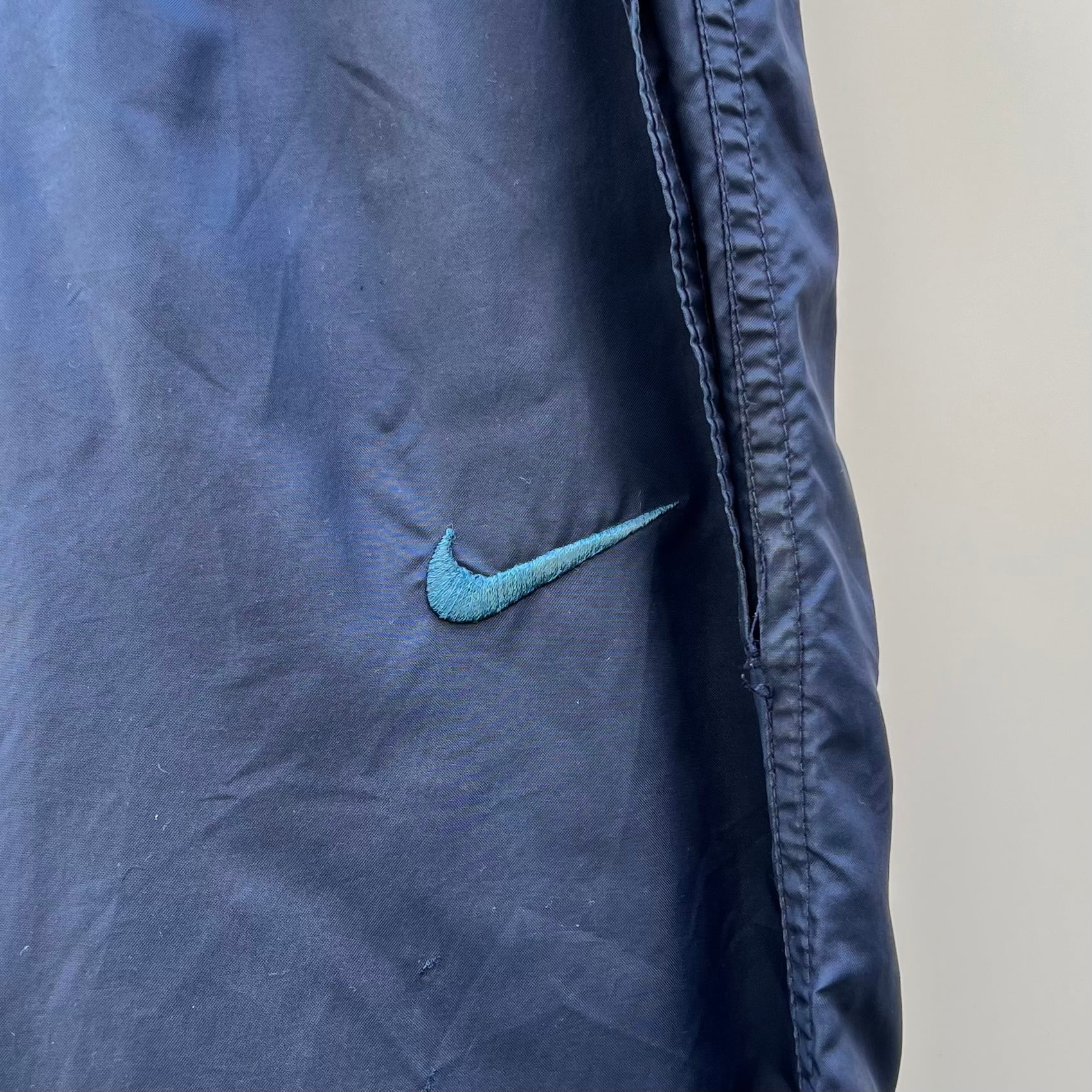 ネイビーのナイロン素材、左足にスウォシュ刺繍、裾にゴムが入るスタンダードデザインです。