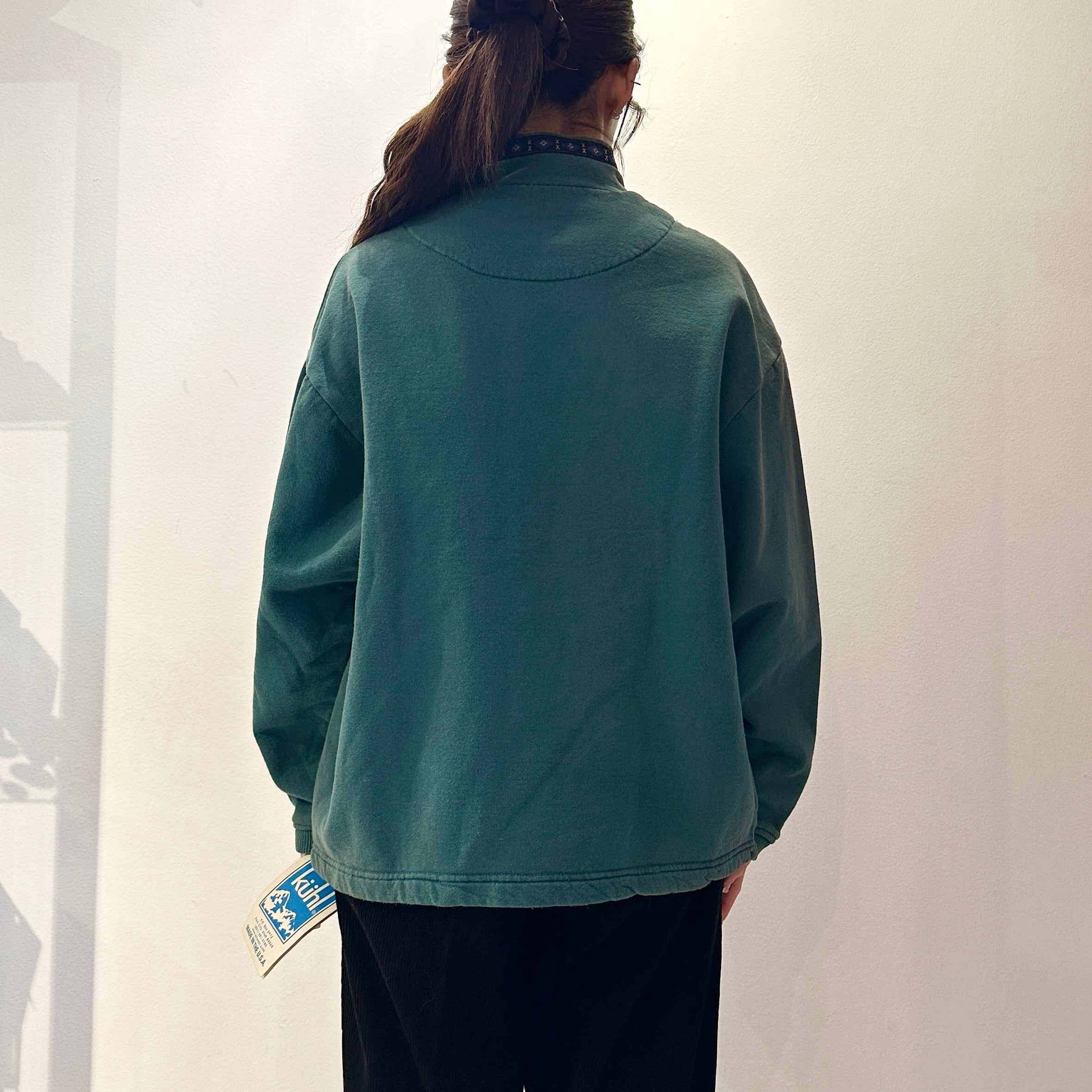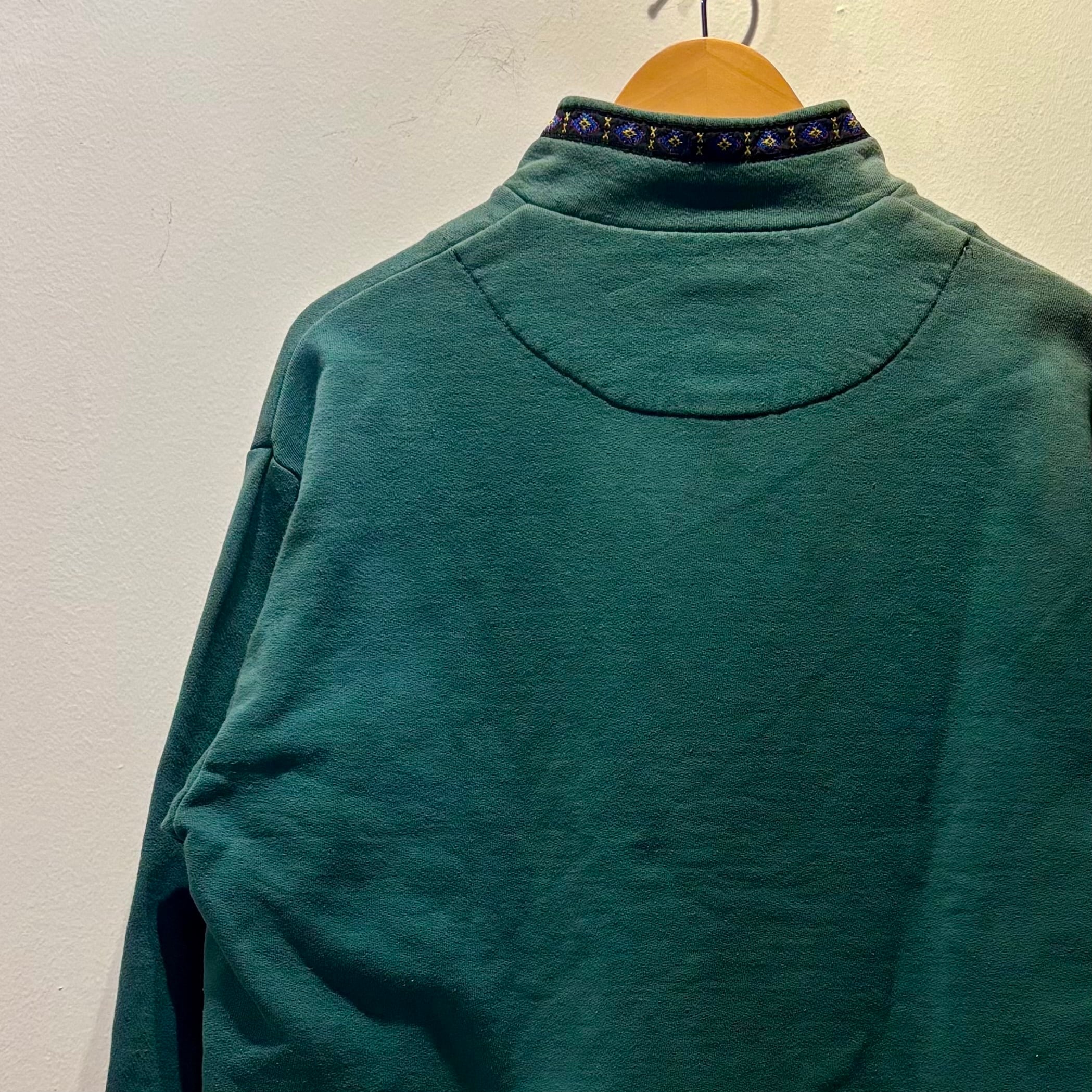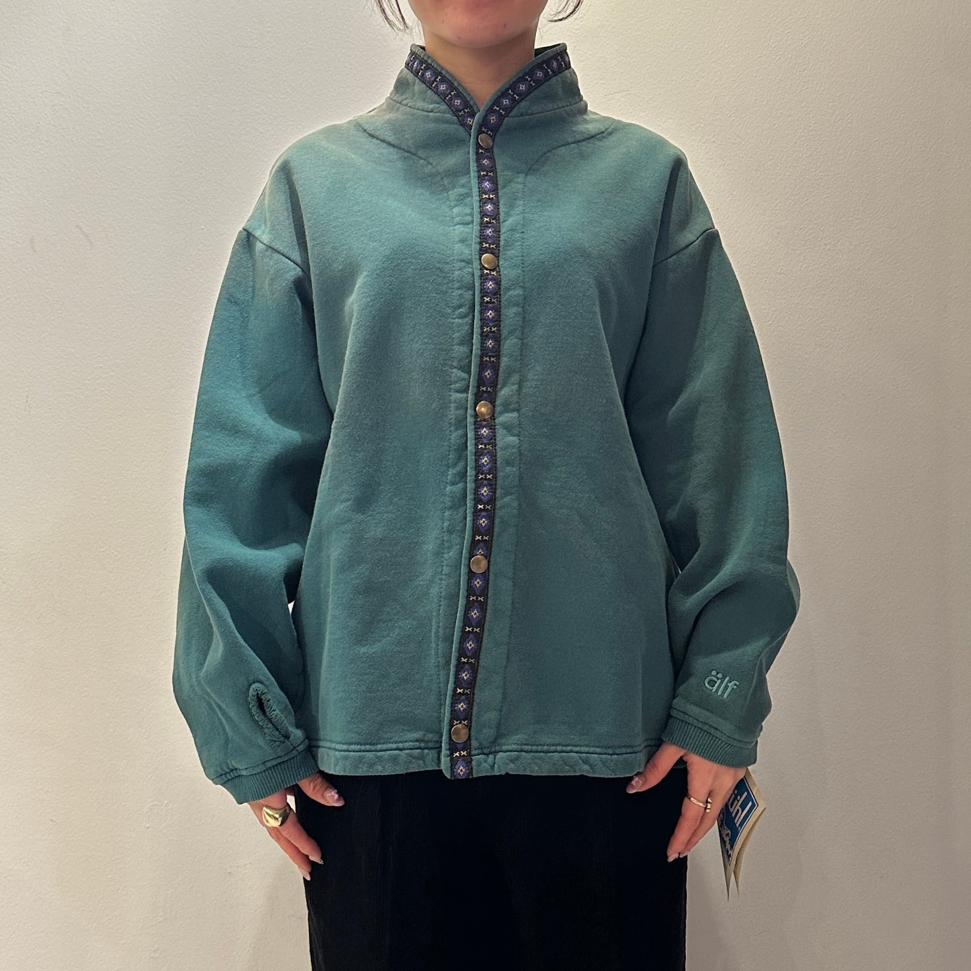 グリーンの裏起毛素材、前立てから襟にかけてチロリアンテープ、左袖にロゴ刺繍、5つのスナップボタン、両袖に指ぬき穴が付いたデザインです。