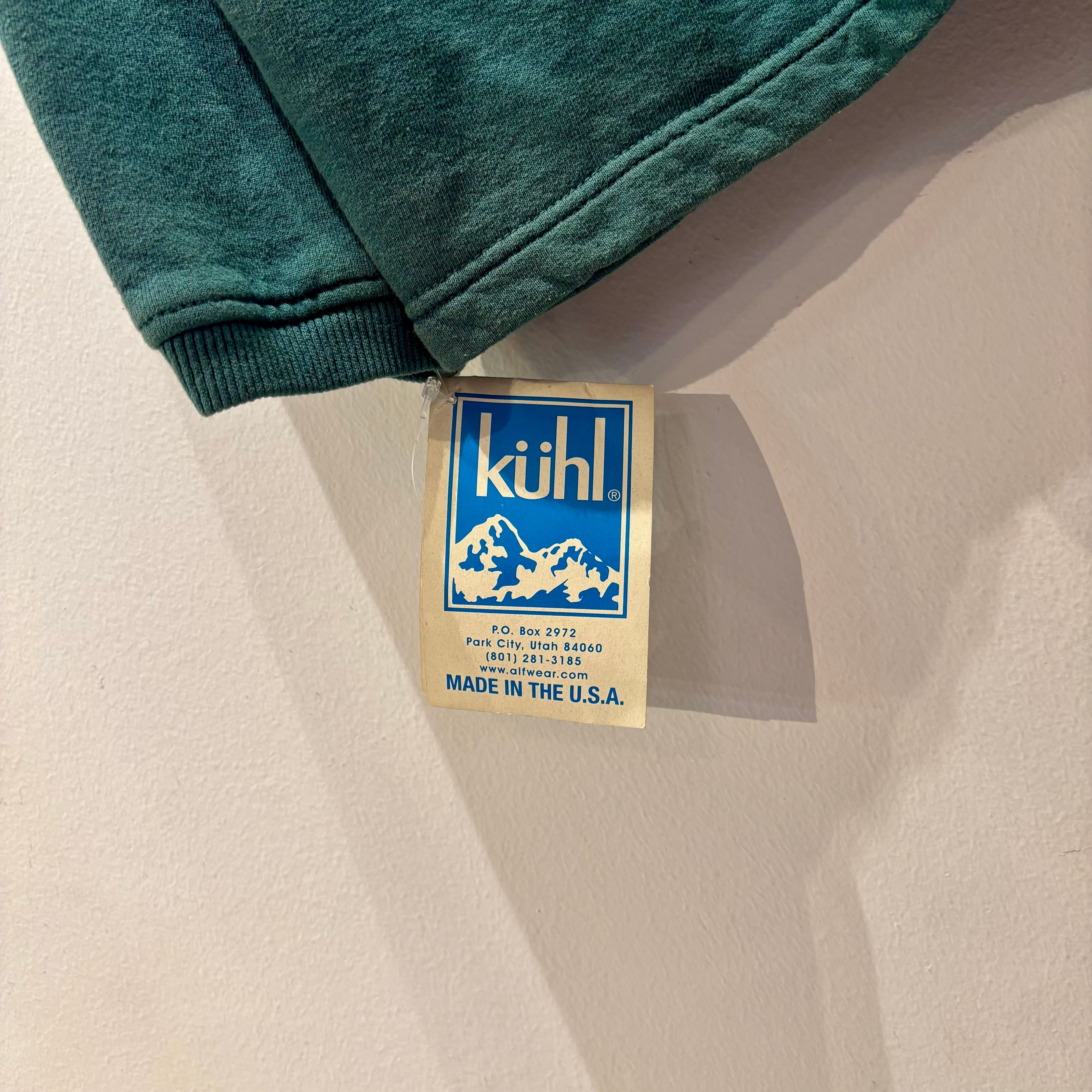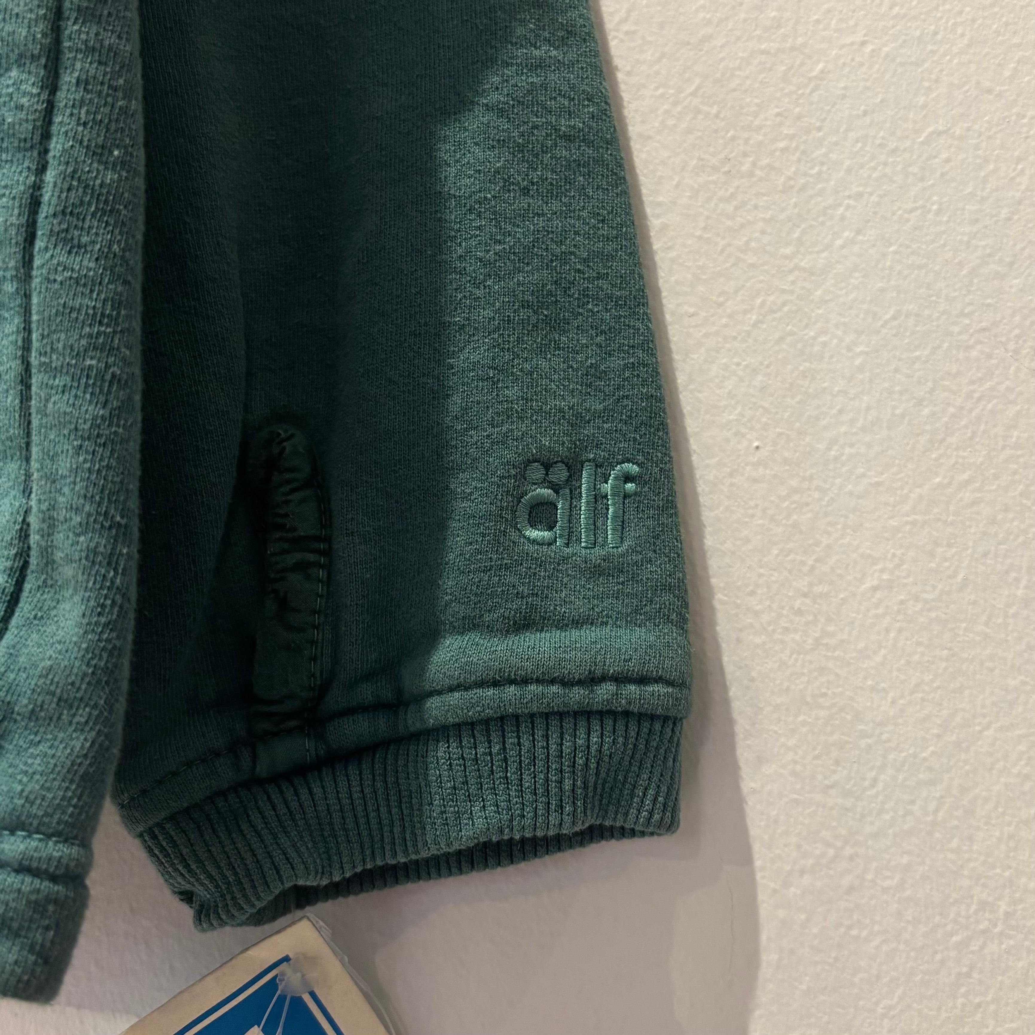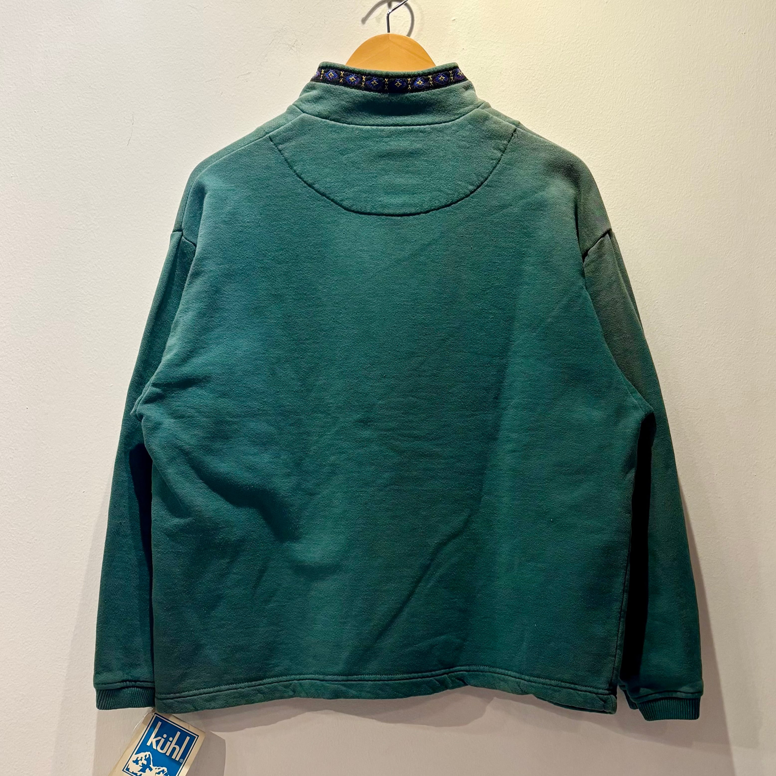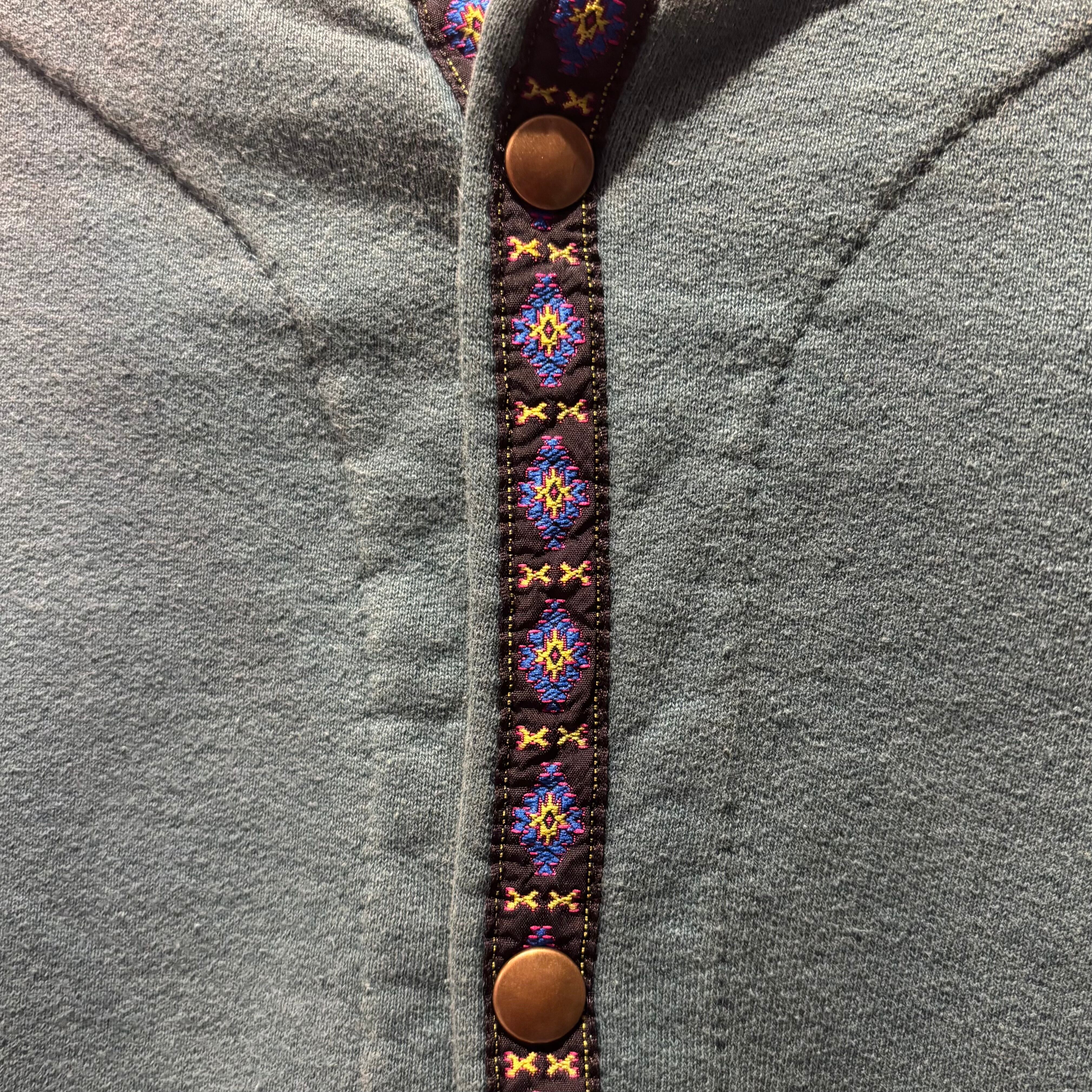 グリーンの裏起毛素材、前立てから襟にかけてチロリアンテープ、左袖にロゴ刺繍、5つのスナップボタン、両袖に指ぬき穴が付いたデザインです。