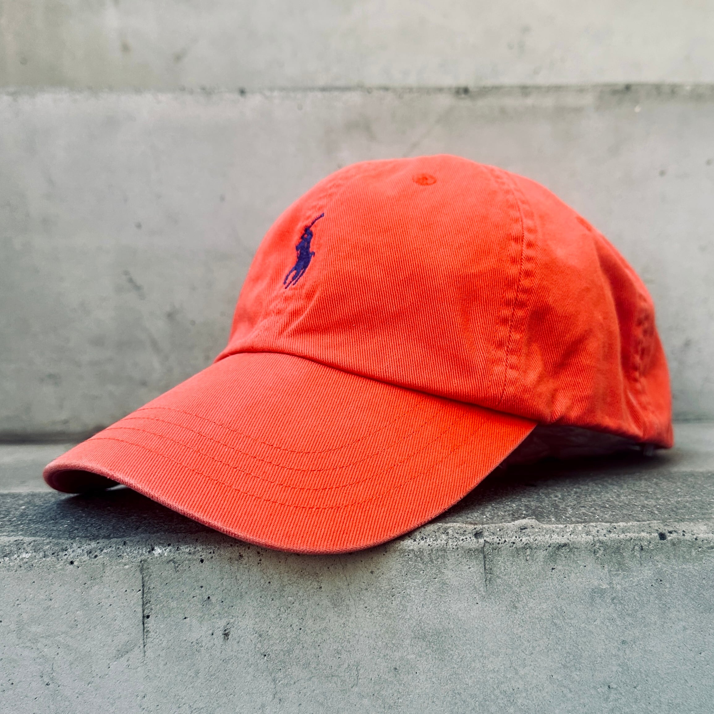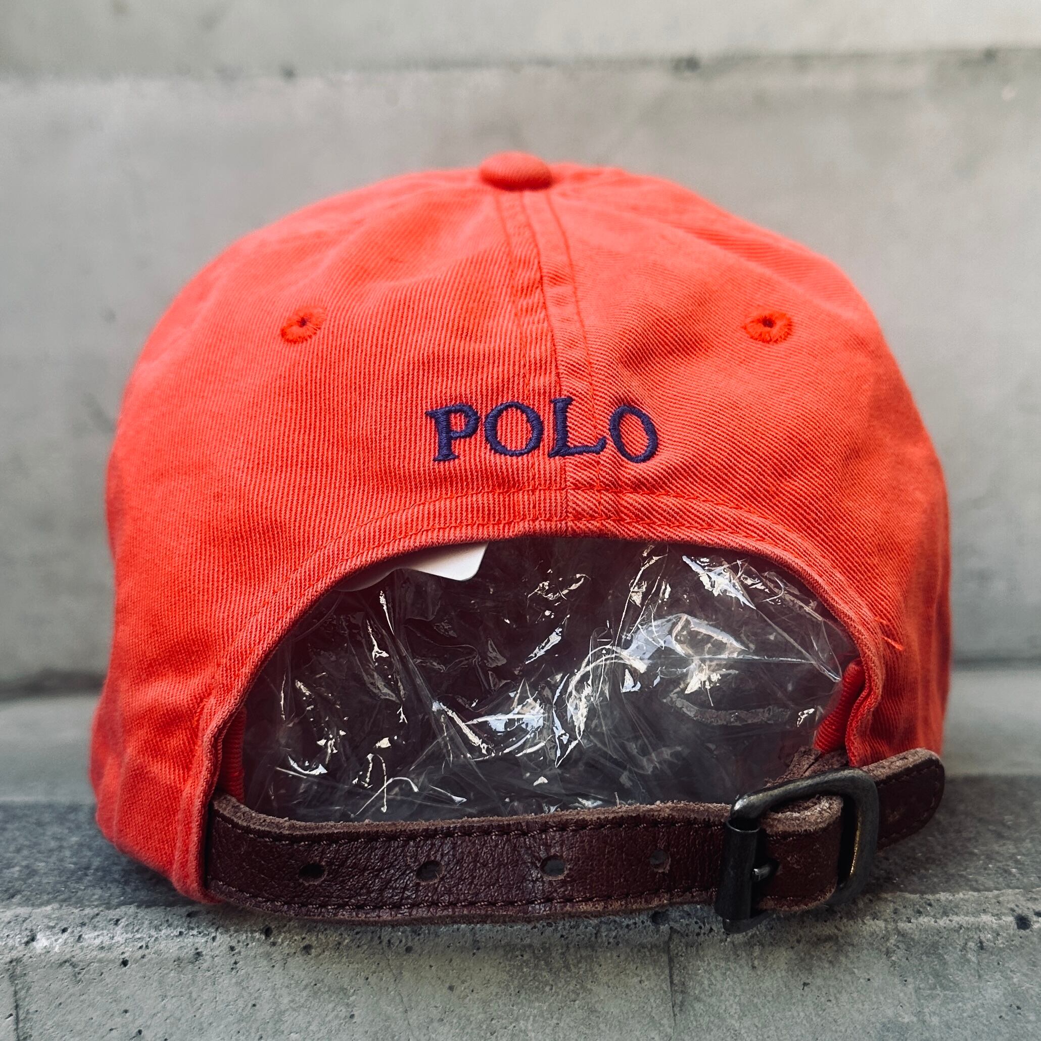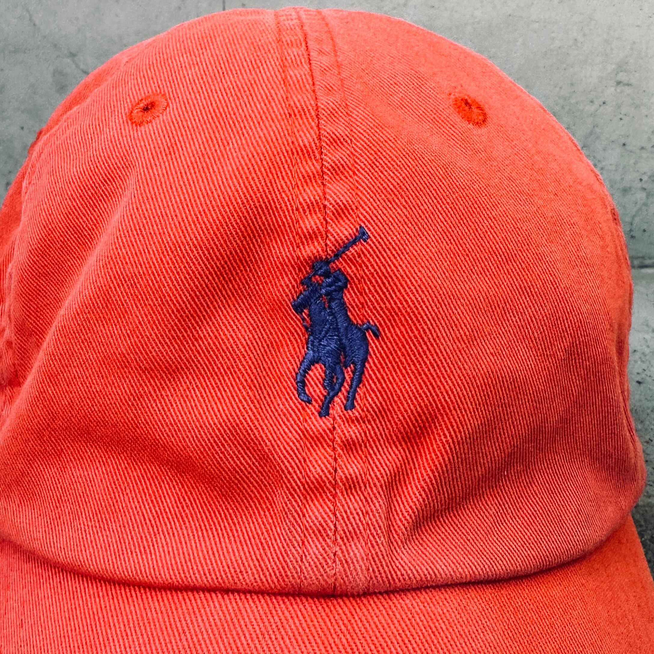 ネイビーのコットン素材、フロントにオレンジのポニー刺繍、バックにPOLO刺繍、生地スライドアジャスターが付いた定番デザインです。