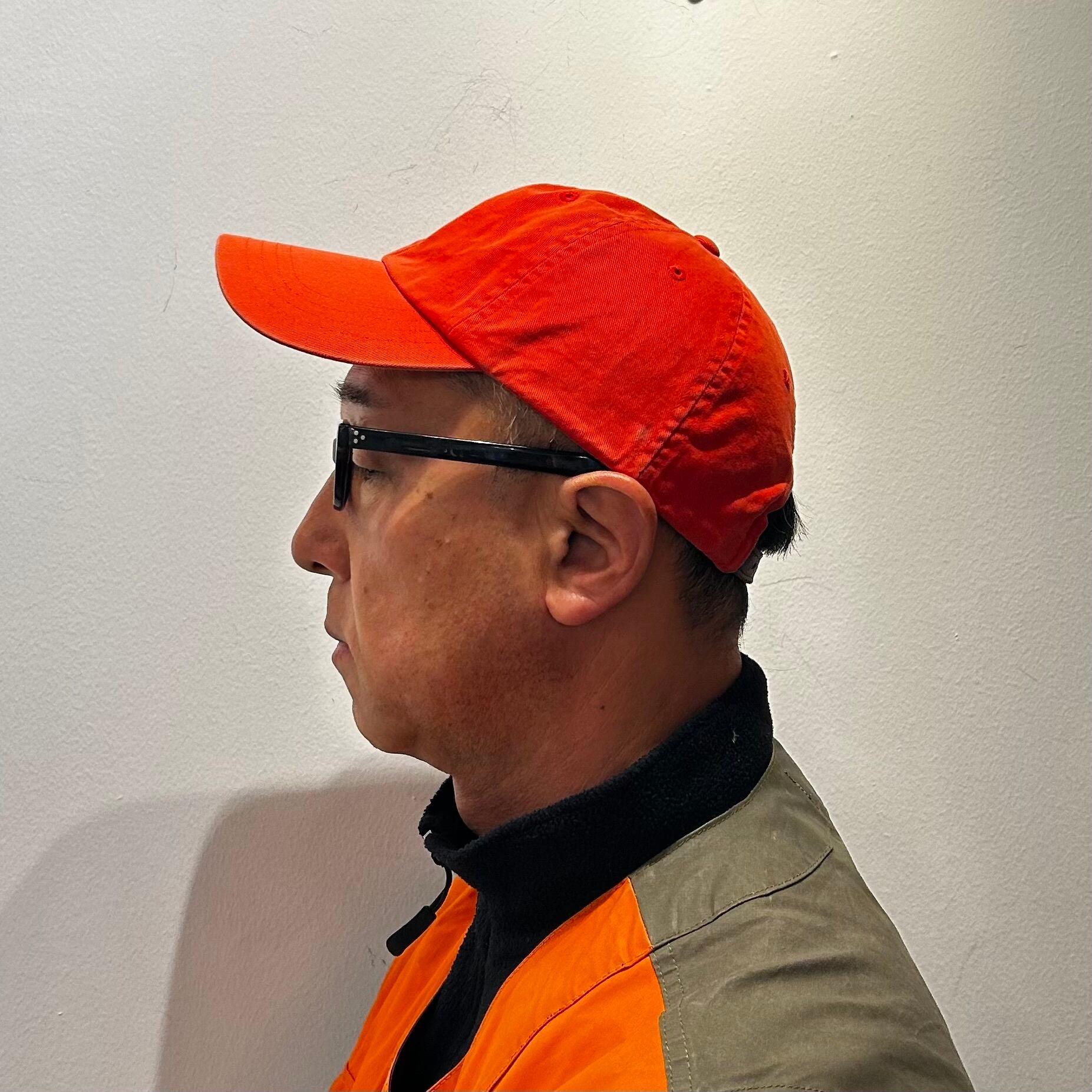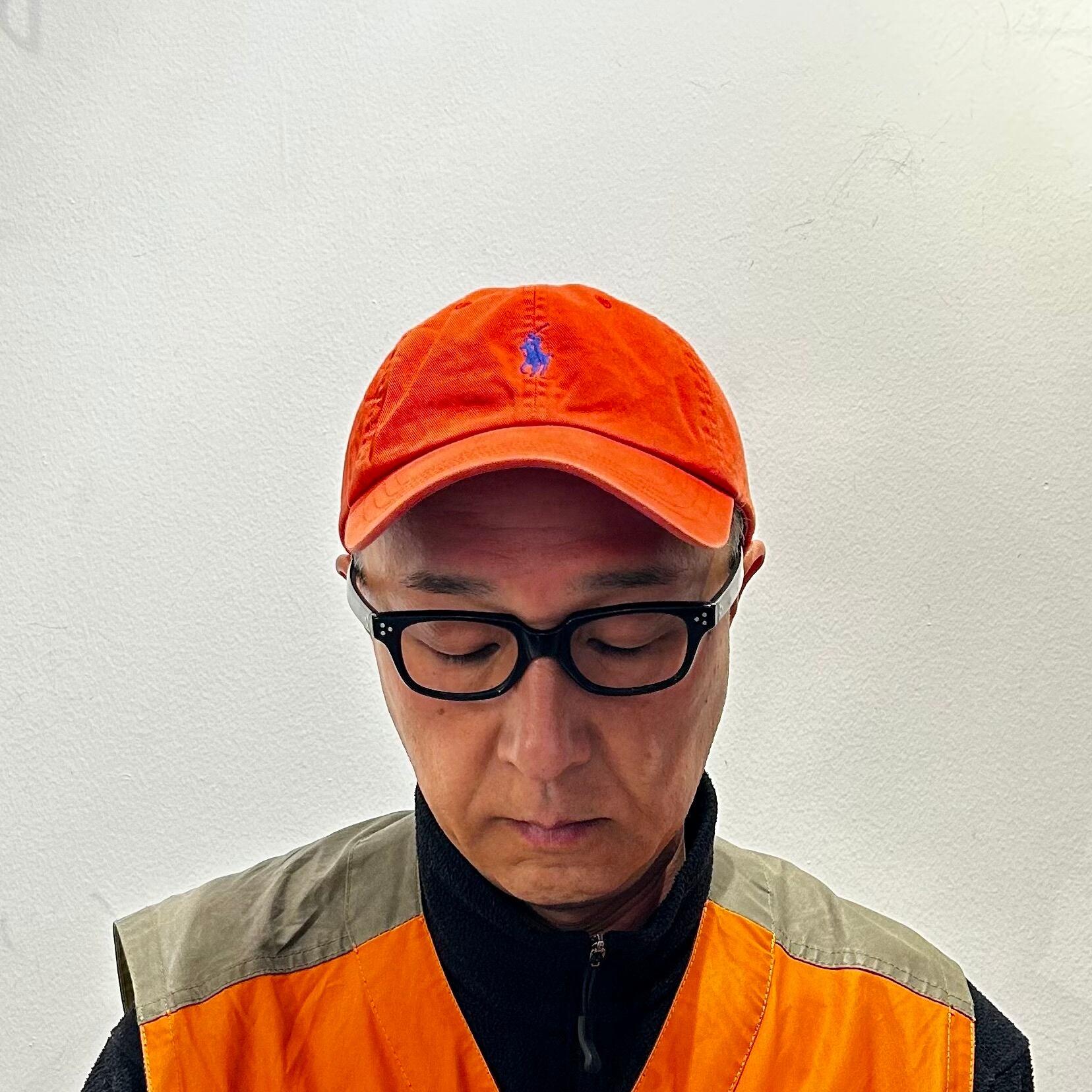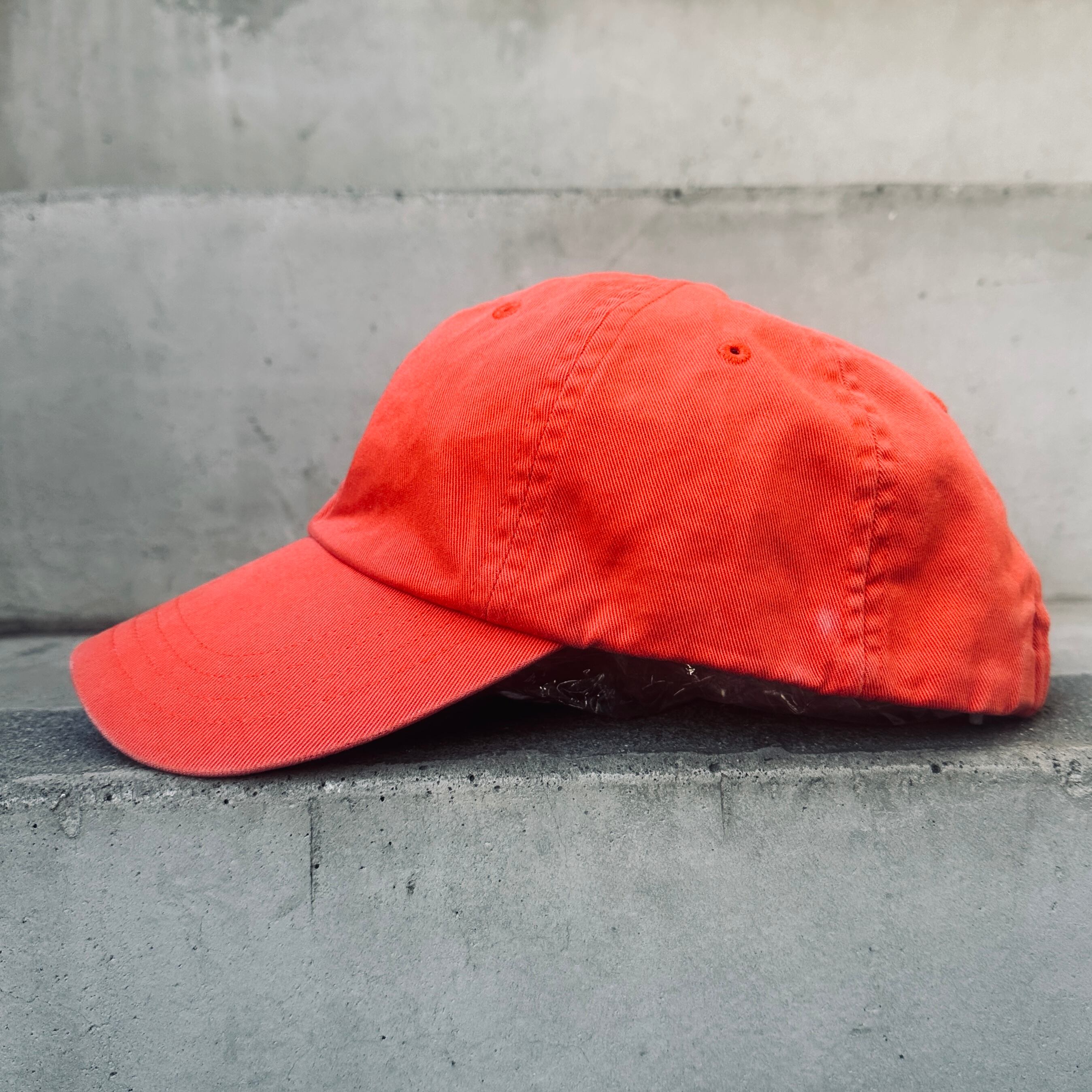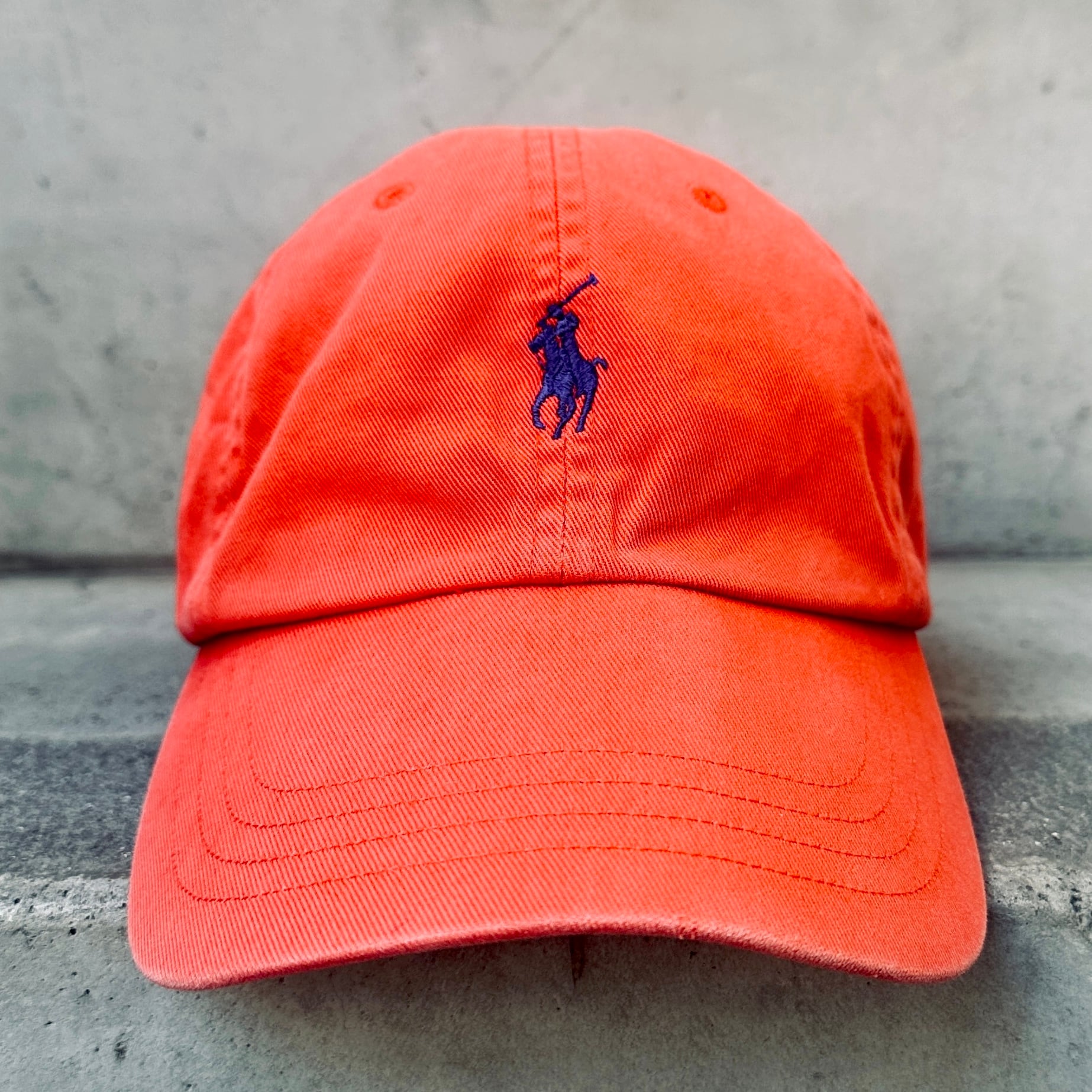 ネイビーのコットン素材、フロントにオレンジのポニー刺繍、バックにPOLO刺繍、生地スライドアジャスターが付いた定番デザインです。