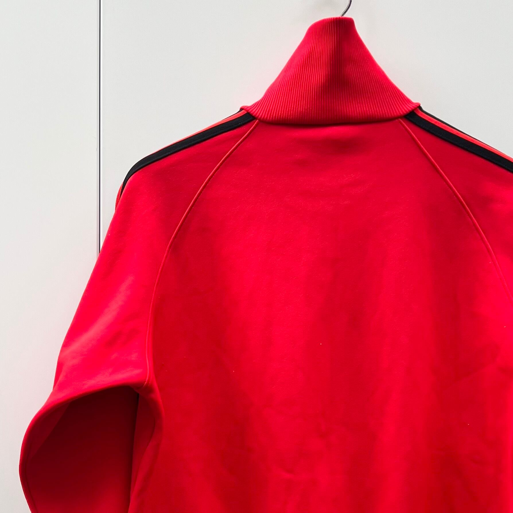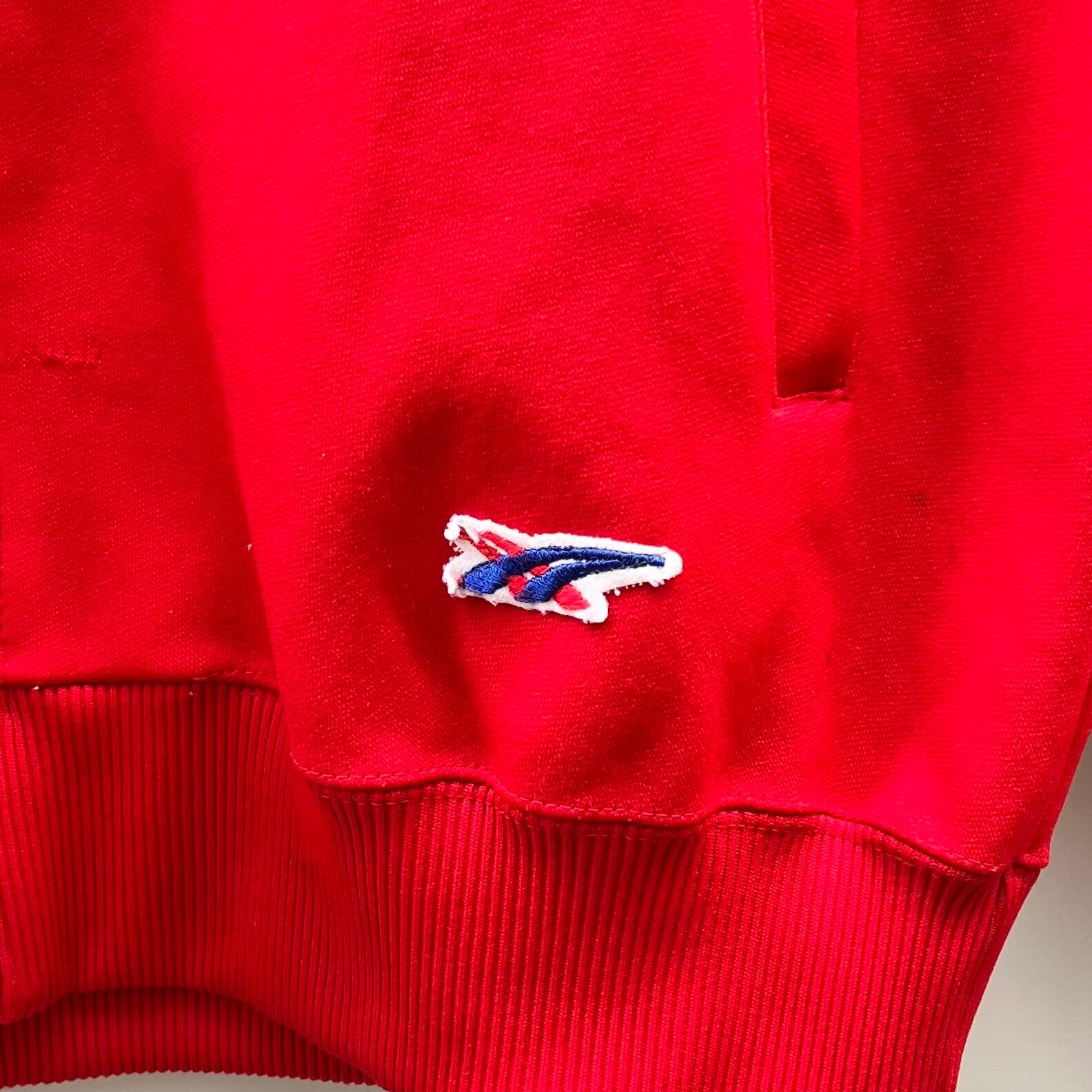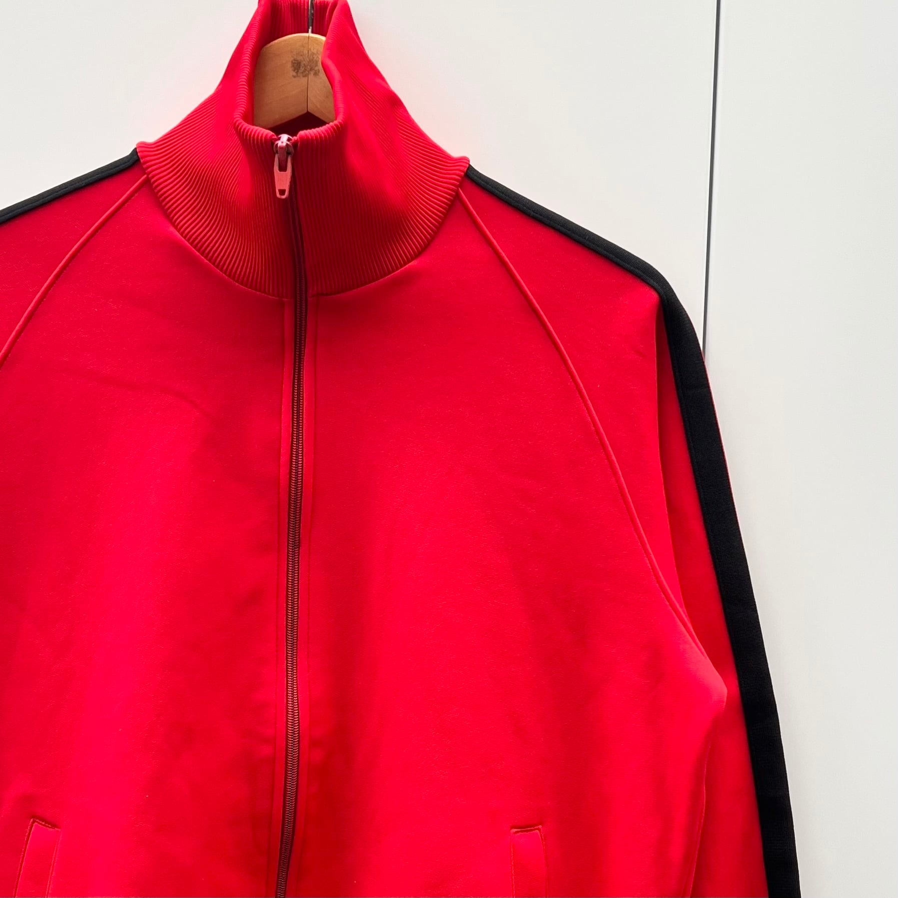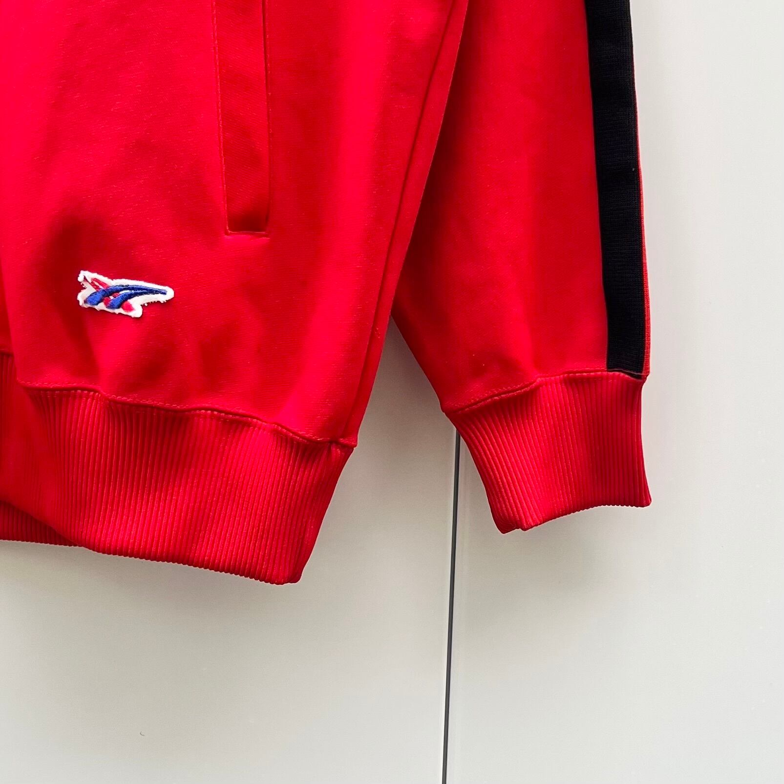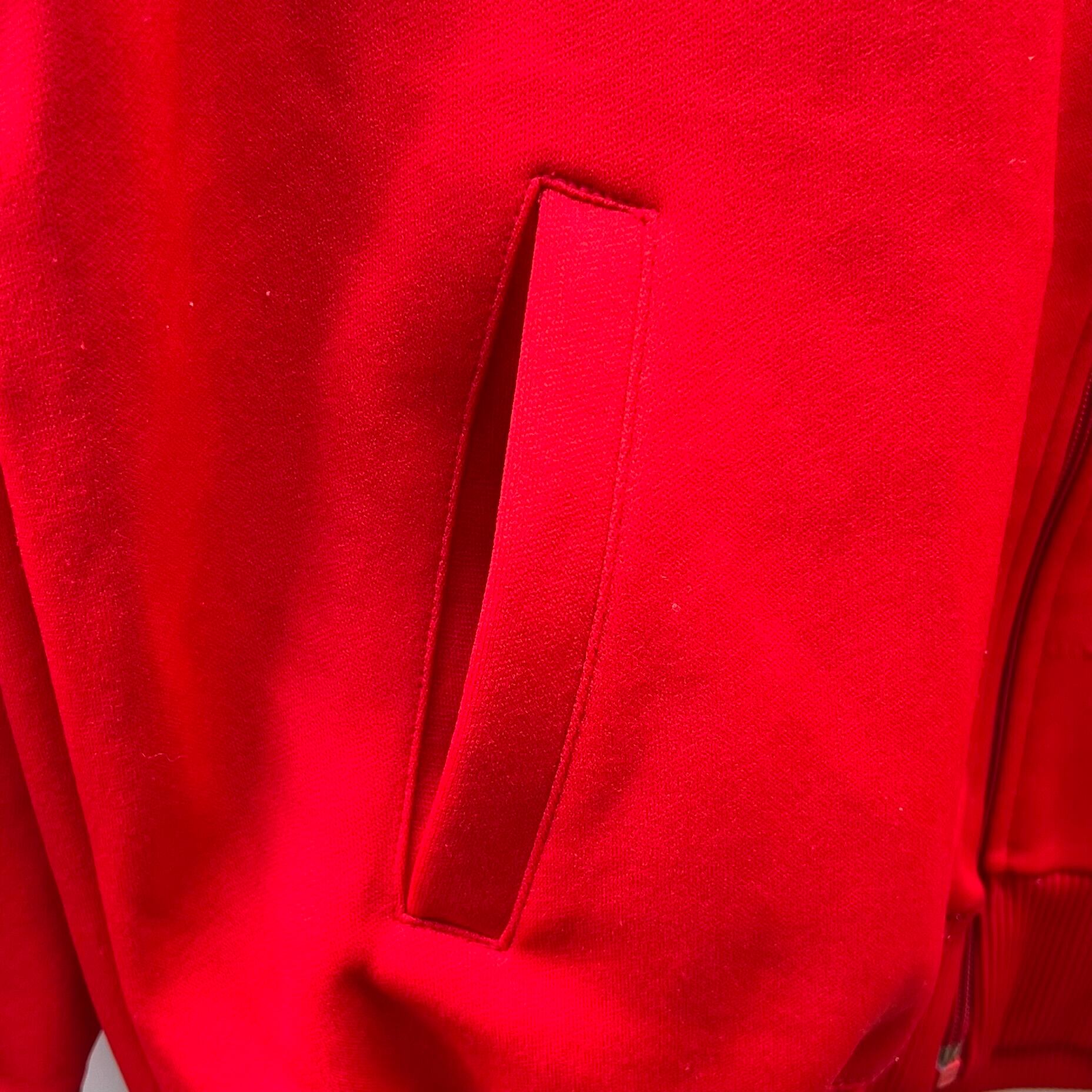 レッドxブラックラインのジャージ素材、左裾にロゴマークワッペン、ハンドウオームポケットが付いたシンプルデザインです。
