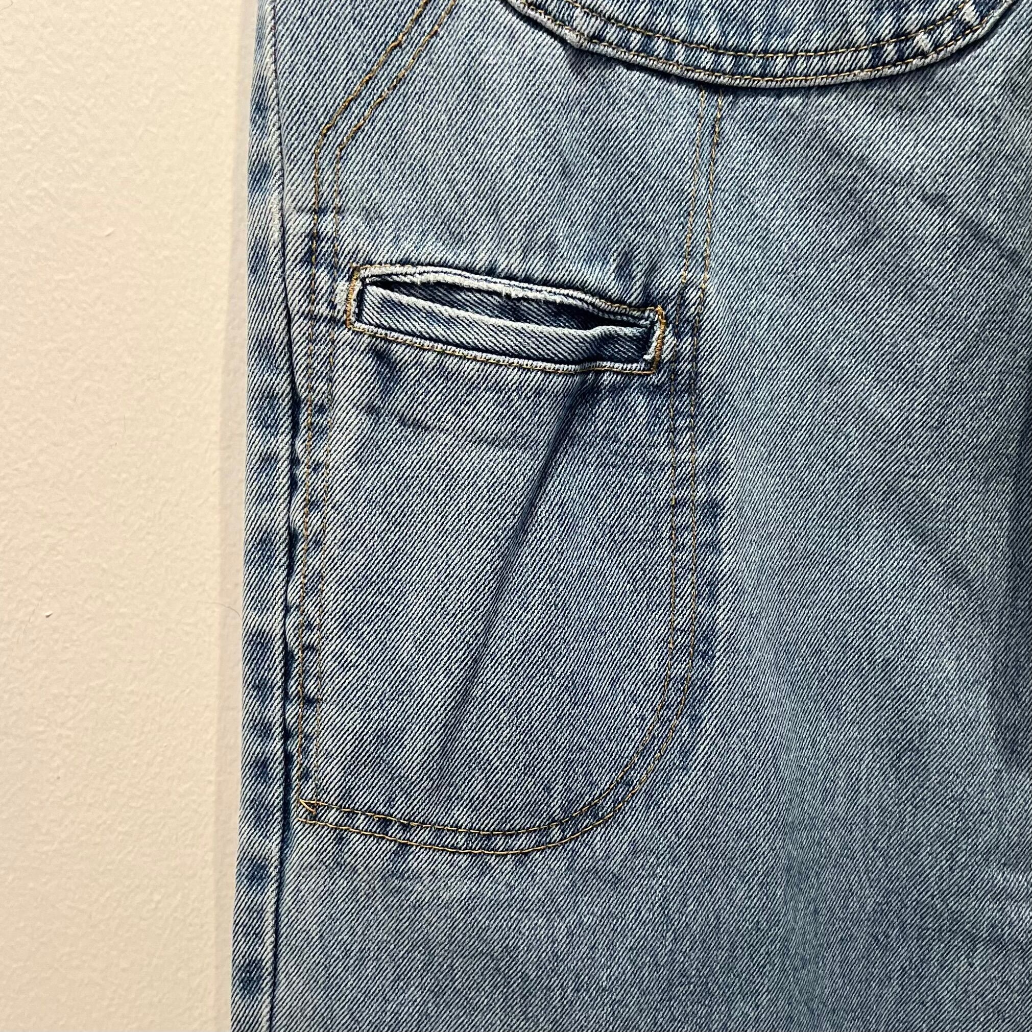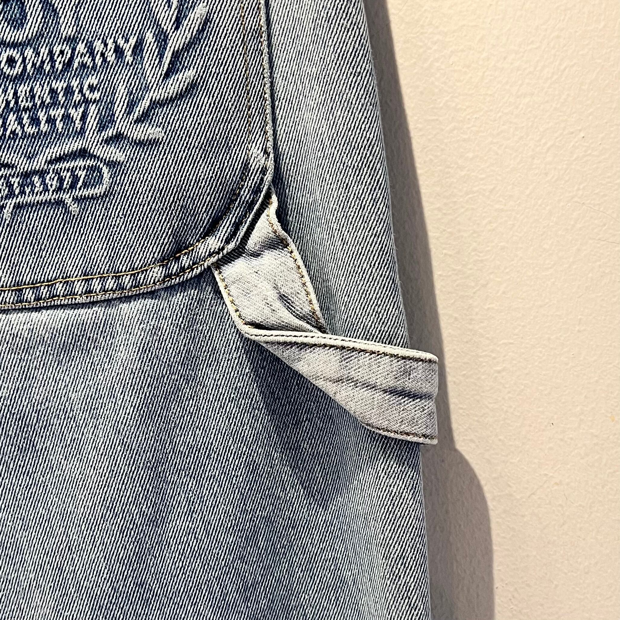 ウォッシュドブルーデニム、右バックポケットにエンボスロゴ、右にロゴ入りハンマーループ、左にサイドポケット、コインポケットにネーム、ロゴ入りボタン、リベットを使用したデザインです。