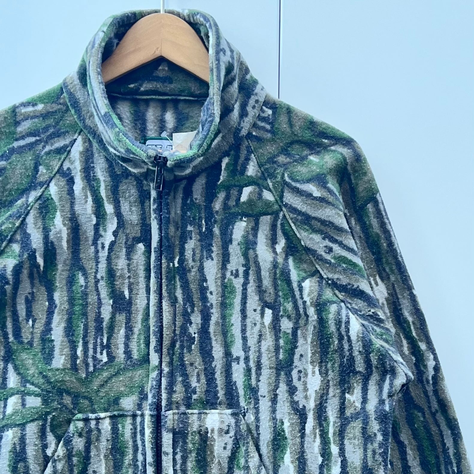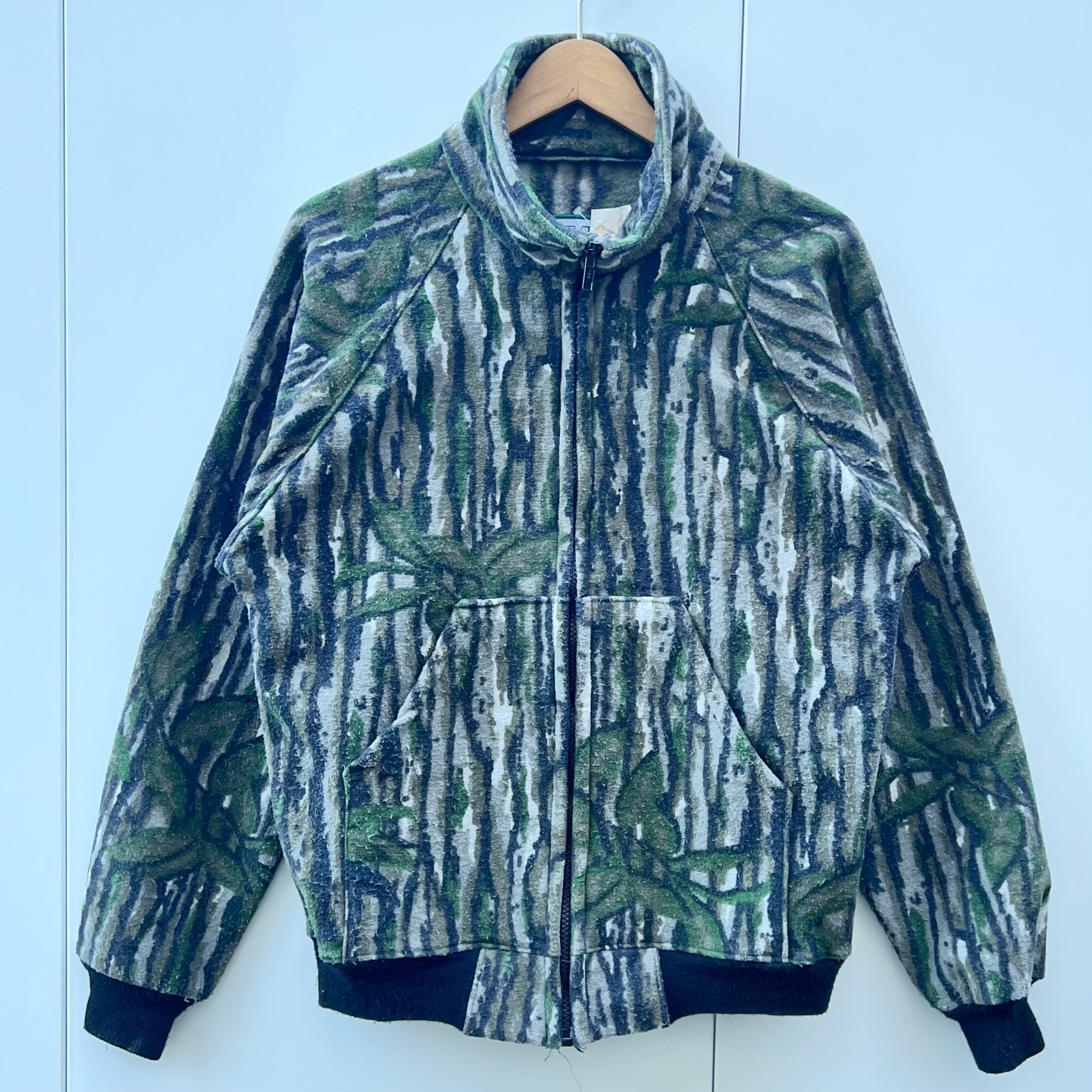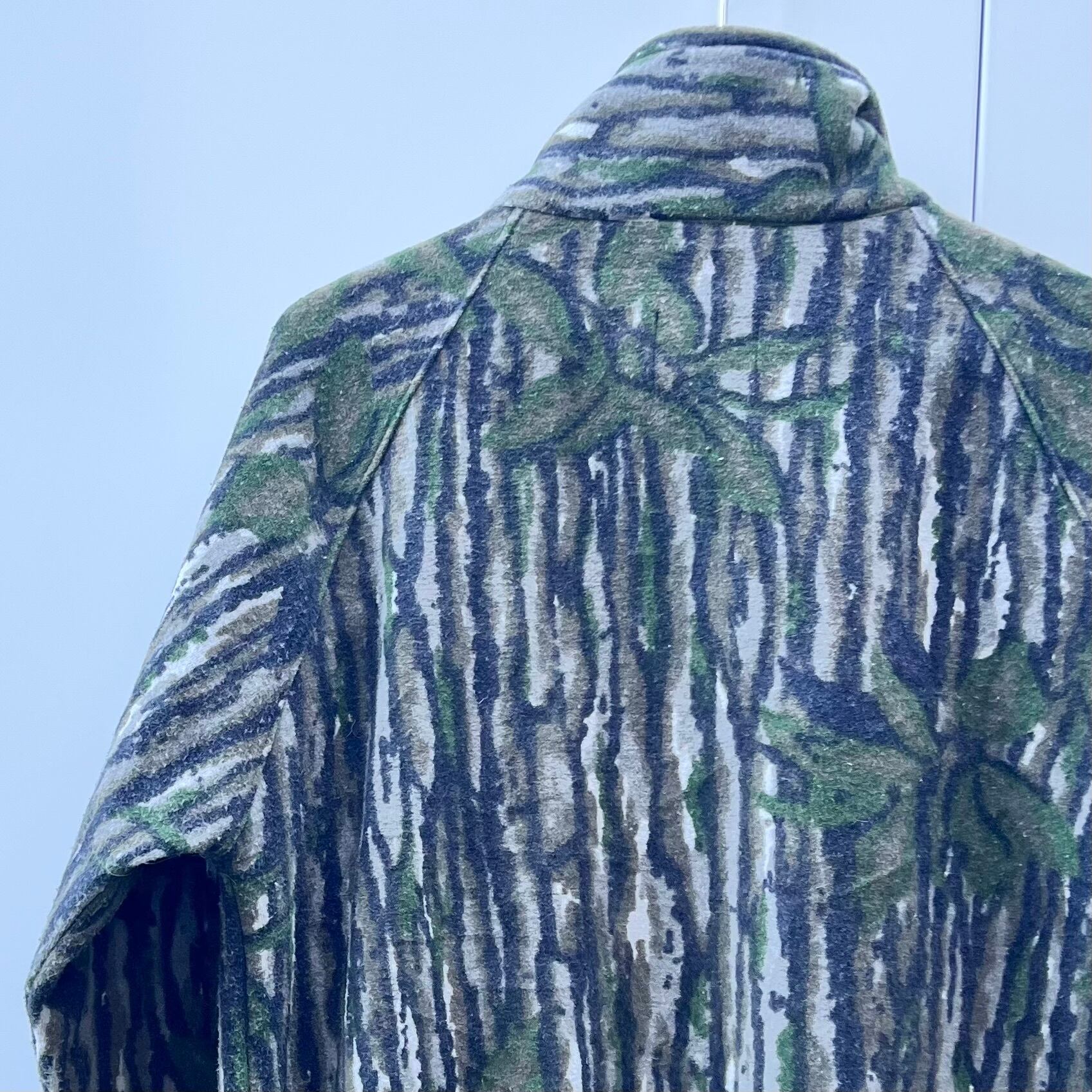 ブレイクアップカモのフリース系ポリエステル素材、ハンドウォームポケットが付いたシンプルデザインです。