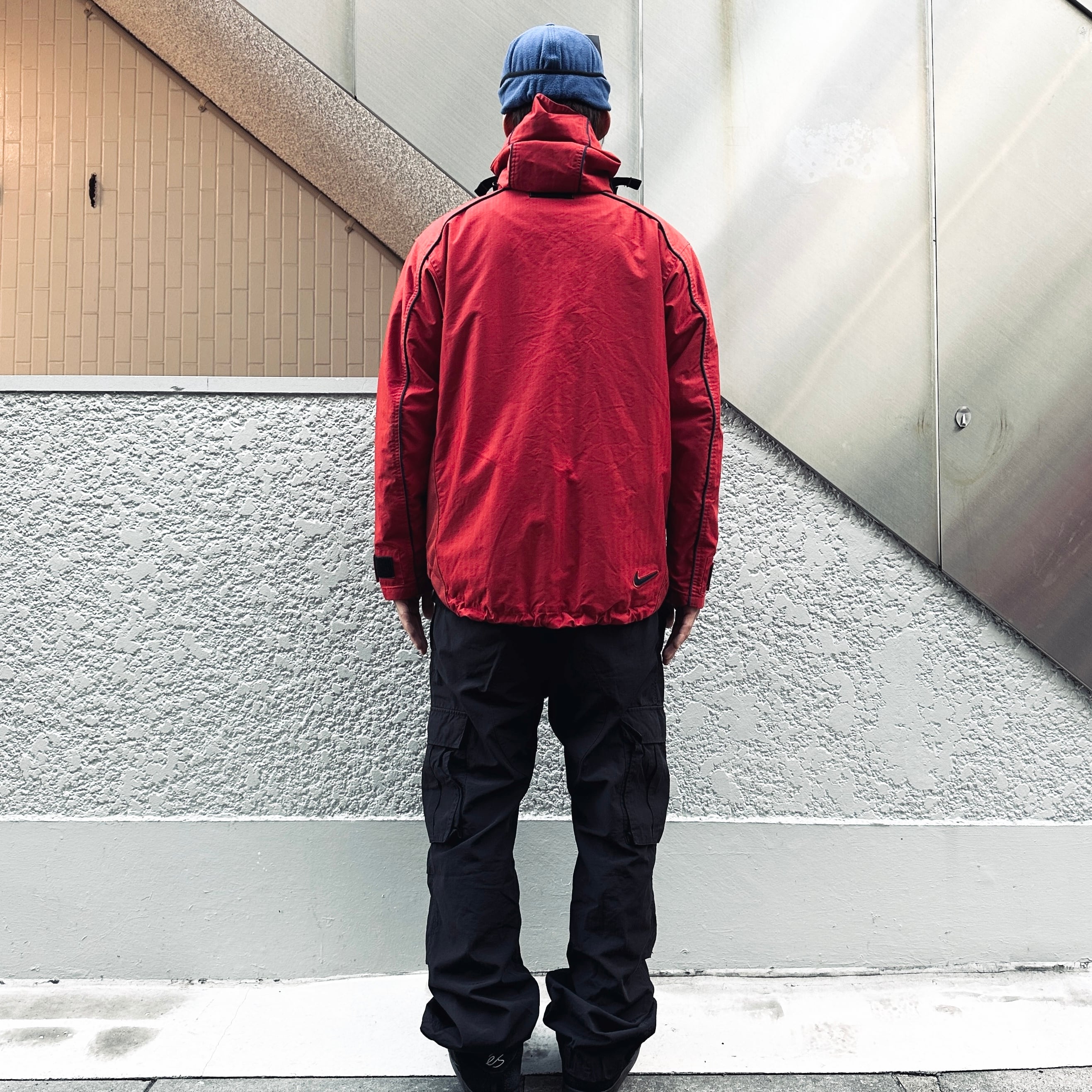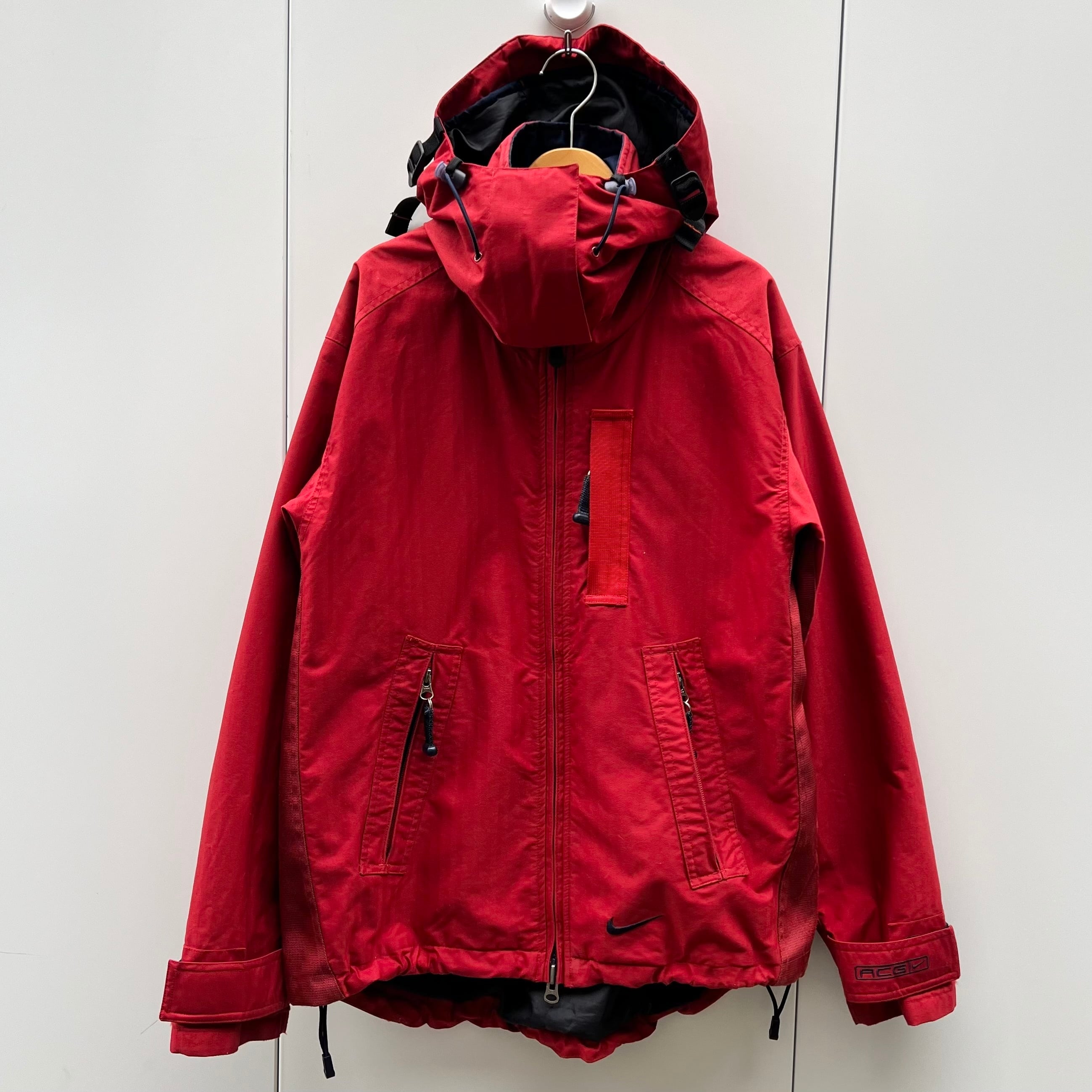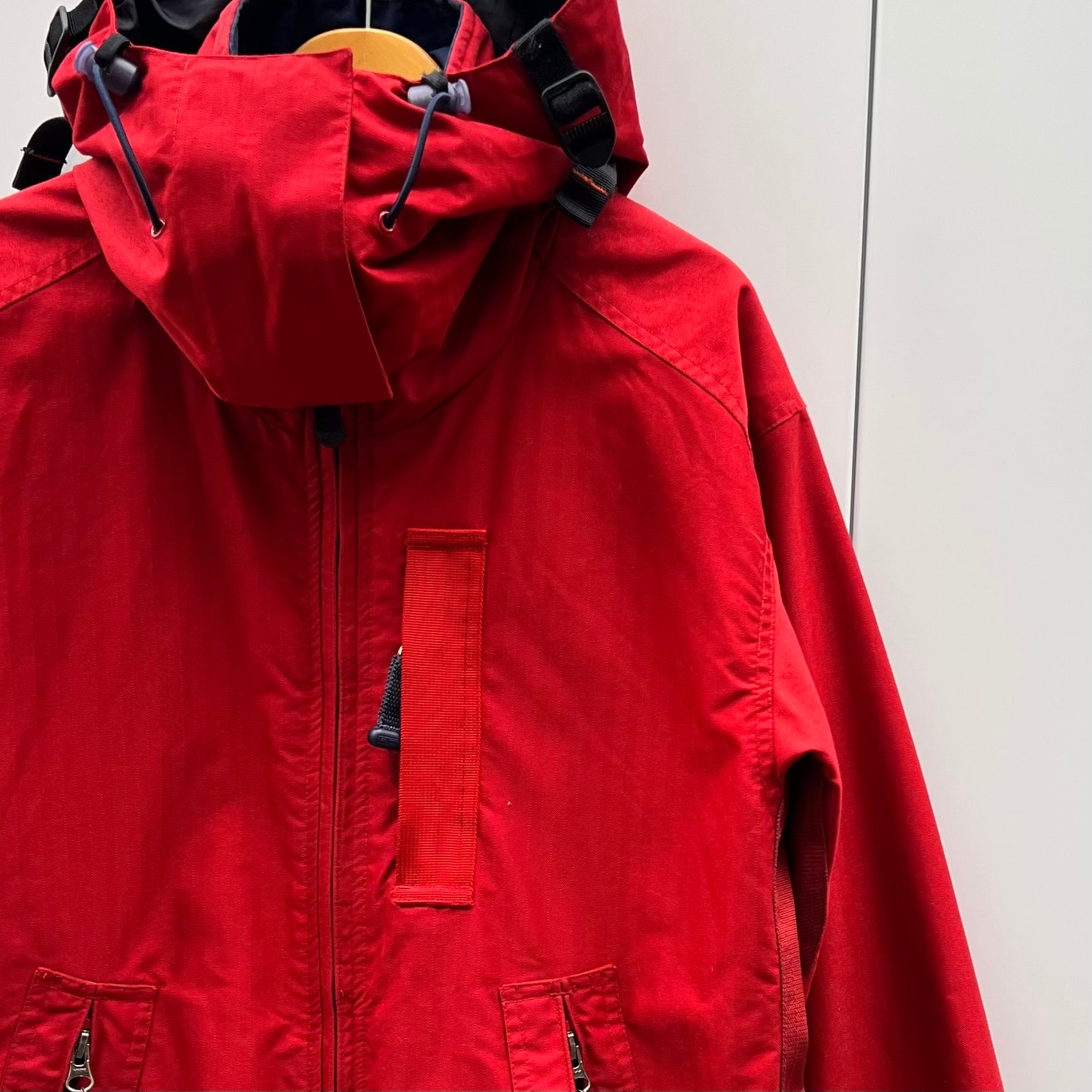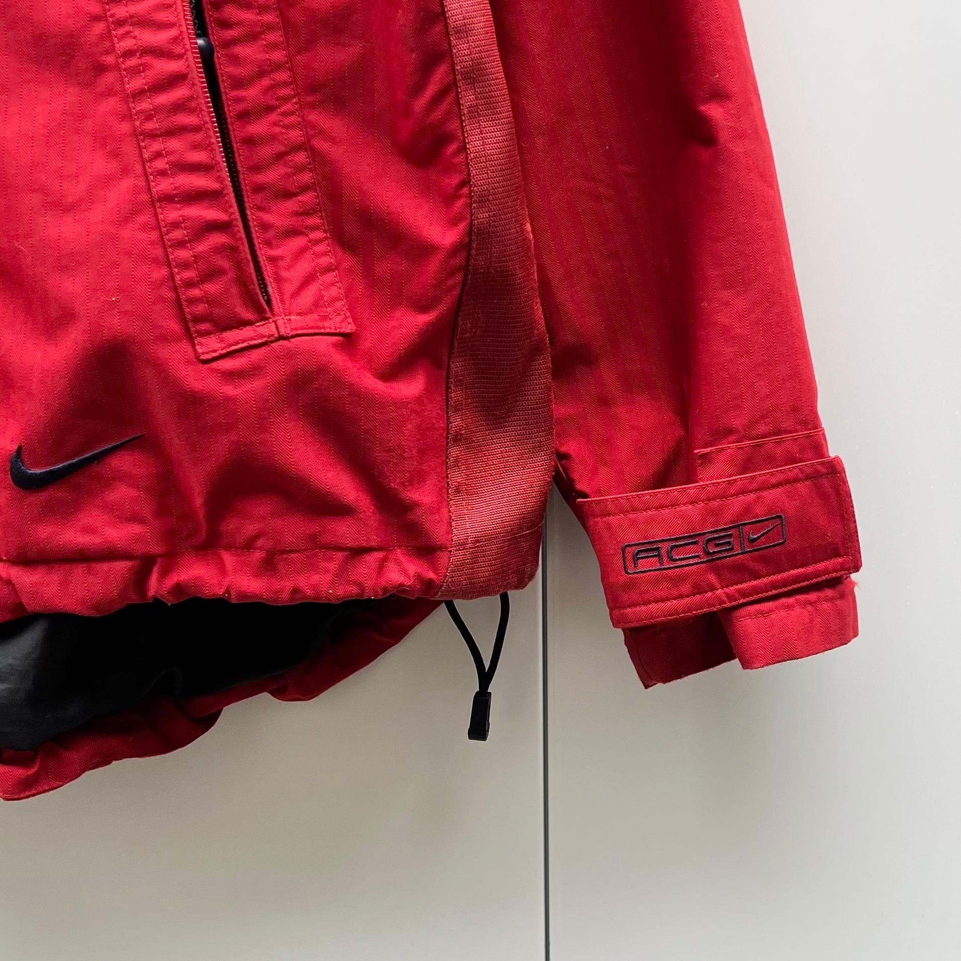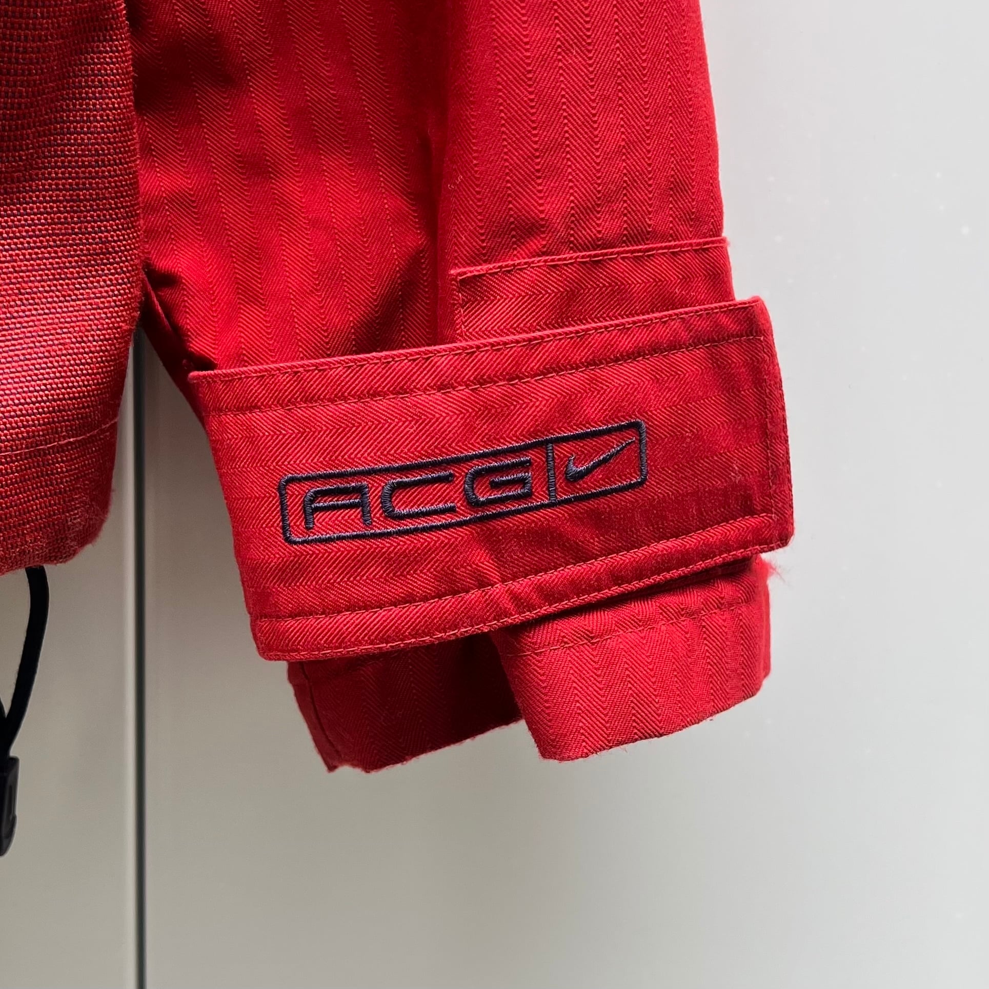 レッドxネイビーのナイロン素材、左裾にスウォッシュ刺繍、左袖カフスにACGロゴ刺繍、バック右裾にスウォッシュワッペン、左胸と両サイドにジッパー付きポケット、両サイドにマチ付きポケット、ロゴ入りジッパースライダー、ジッパーでフード脱着、裾にドローコードが付いたデザインです。