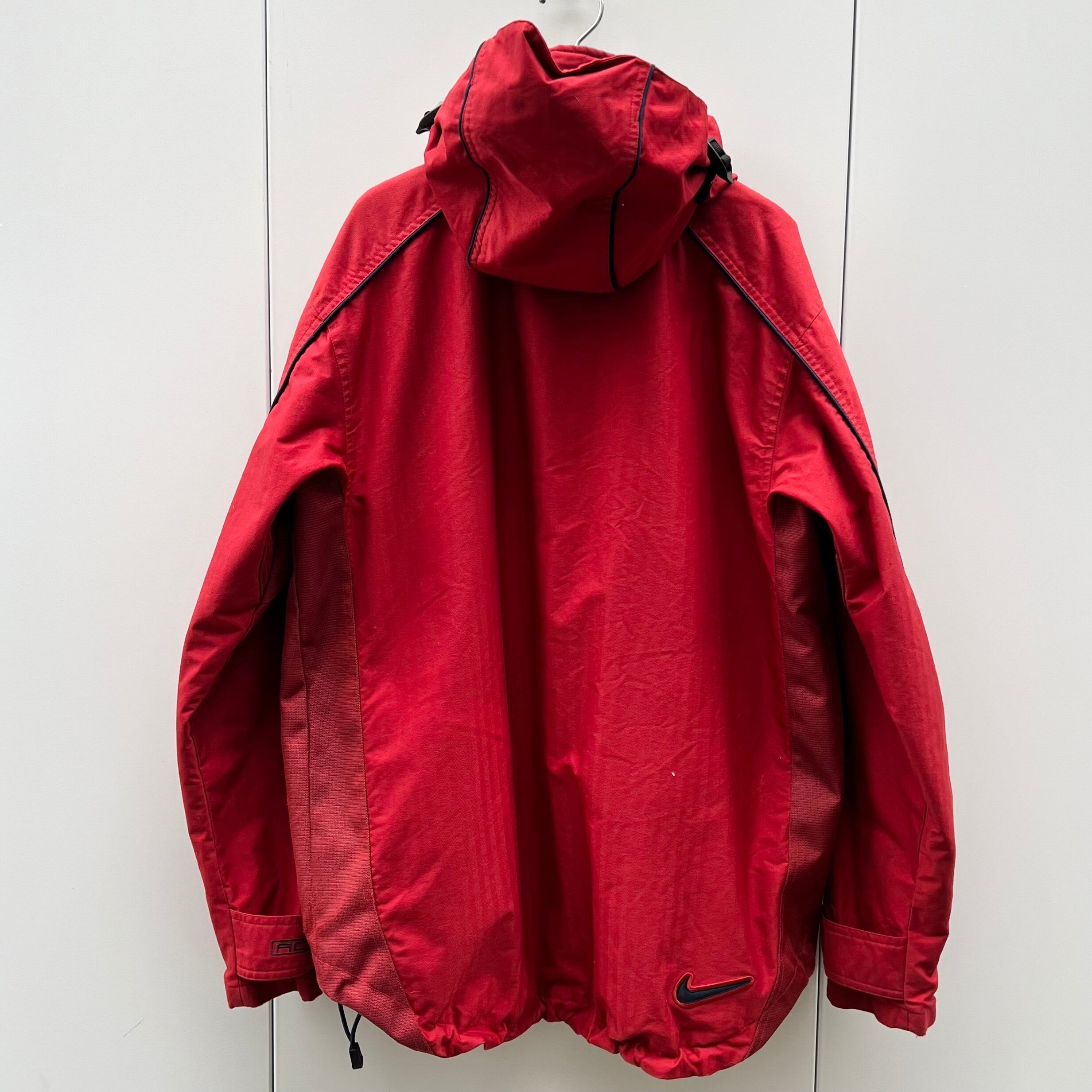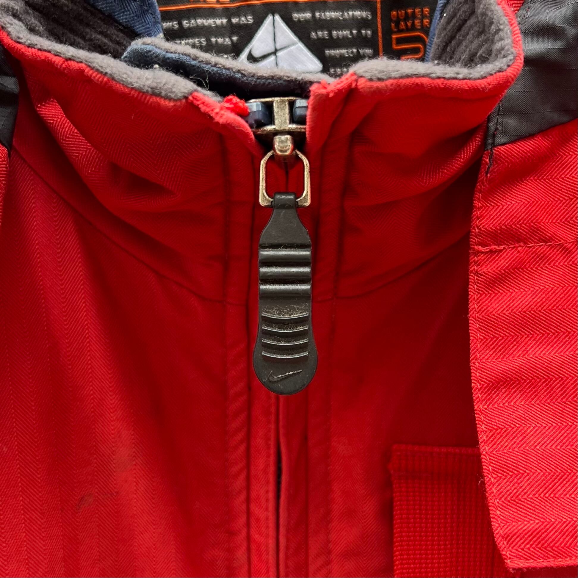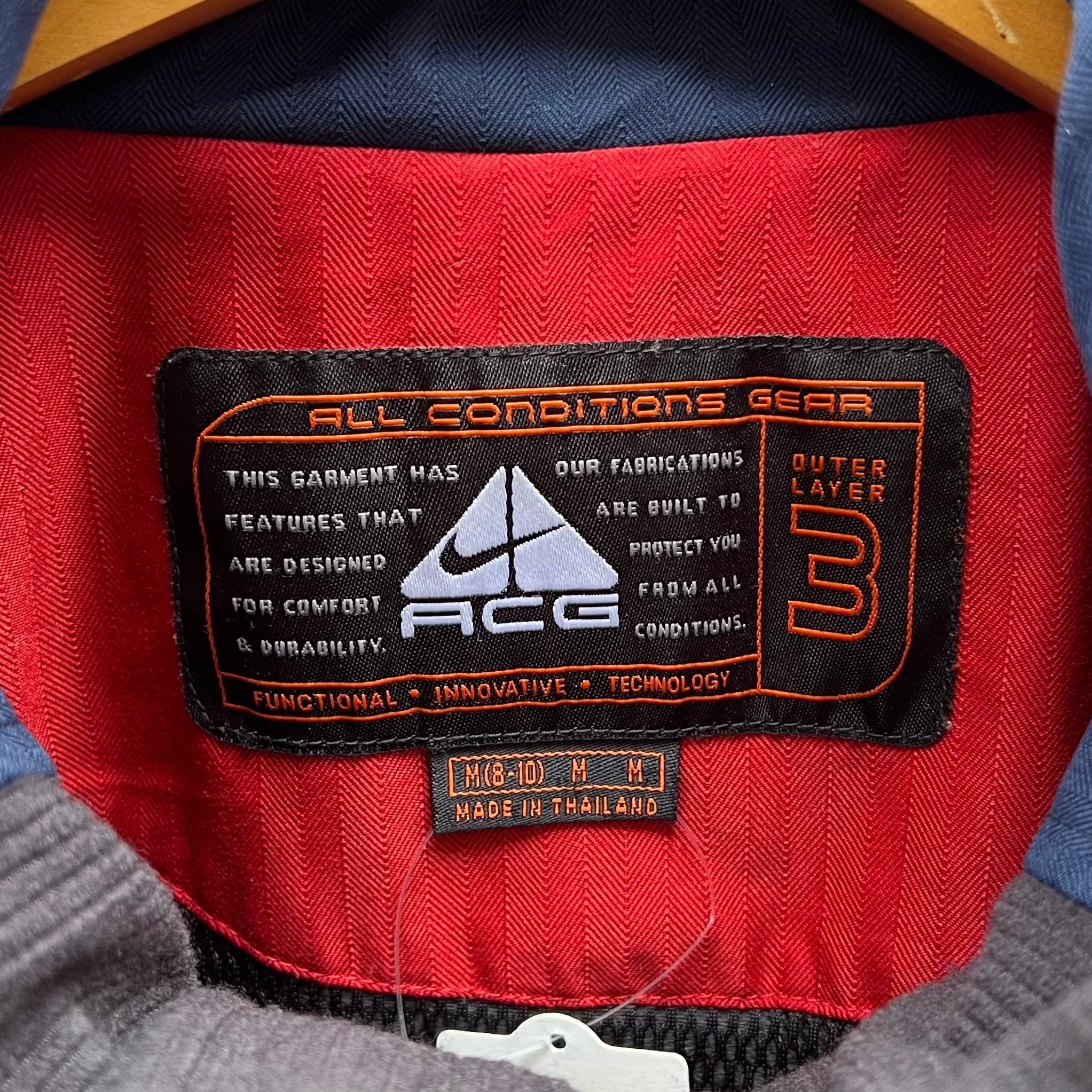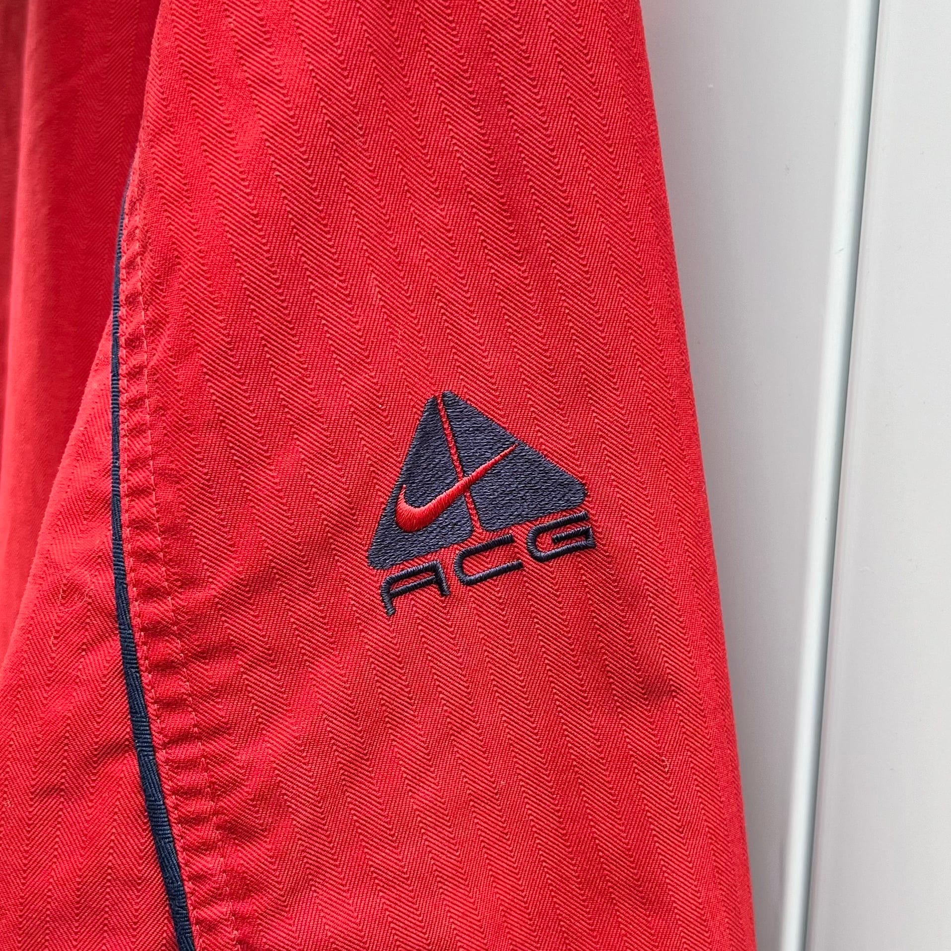 レッドxネイビーのナイロン素材、左裾にスウォッシュ刺繍、左袖カフスにACGロゴ刺繍、バック右裾にスウォッシュワッペン、左胸と両サイドにジッパー付きポケット、両サイドにマチ付きポケット、ロゴ入りジッパースライダー、ジッパーでフード脱着、裾にドローコードが付いたデザインです。