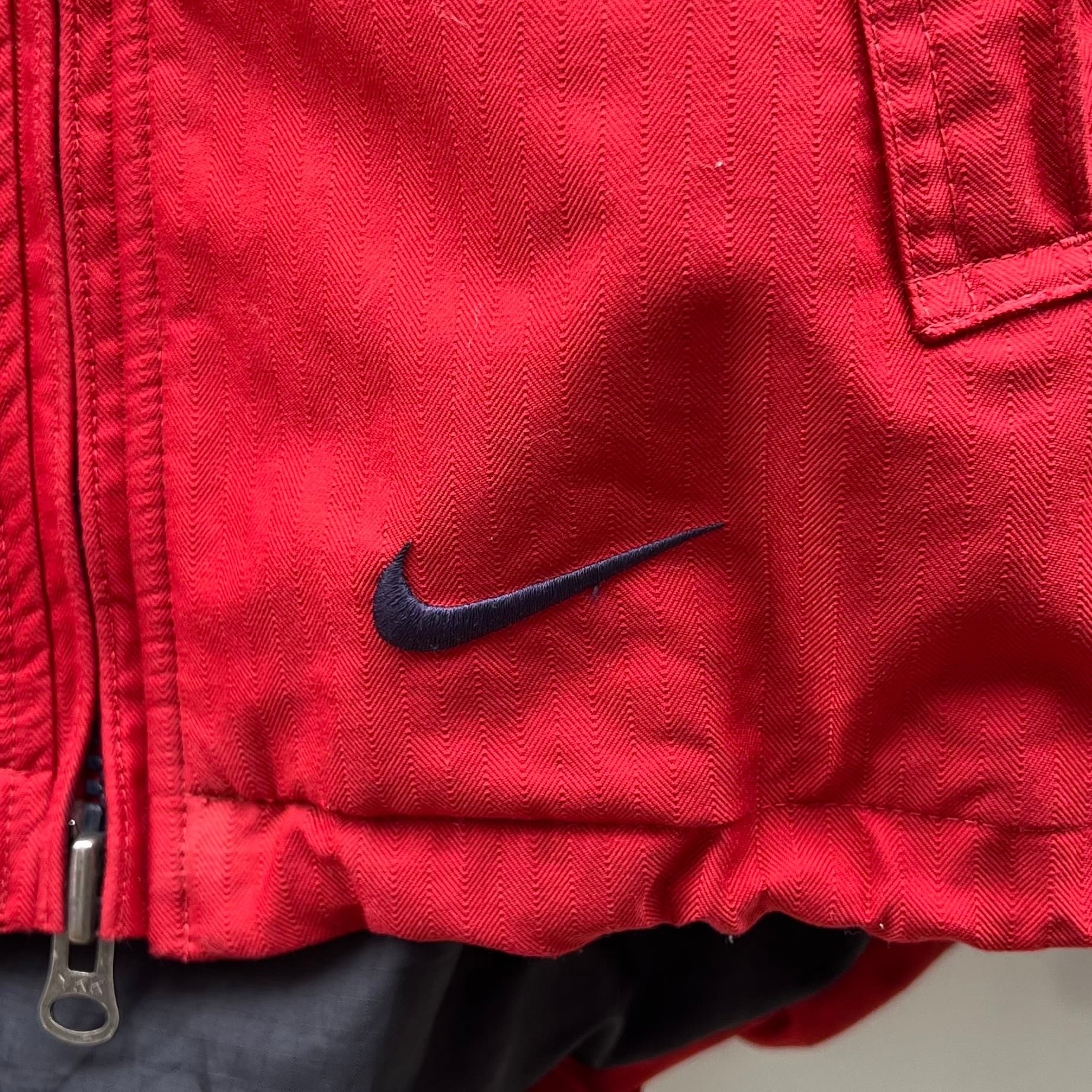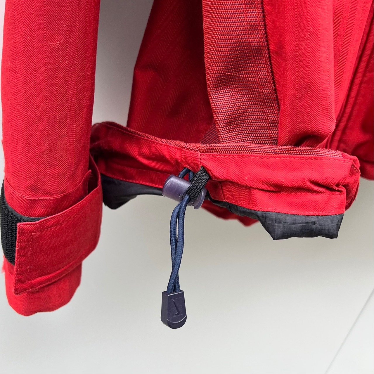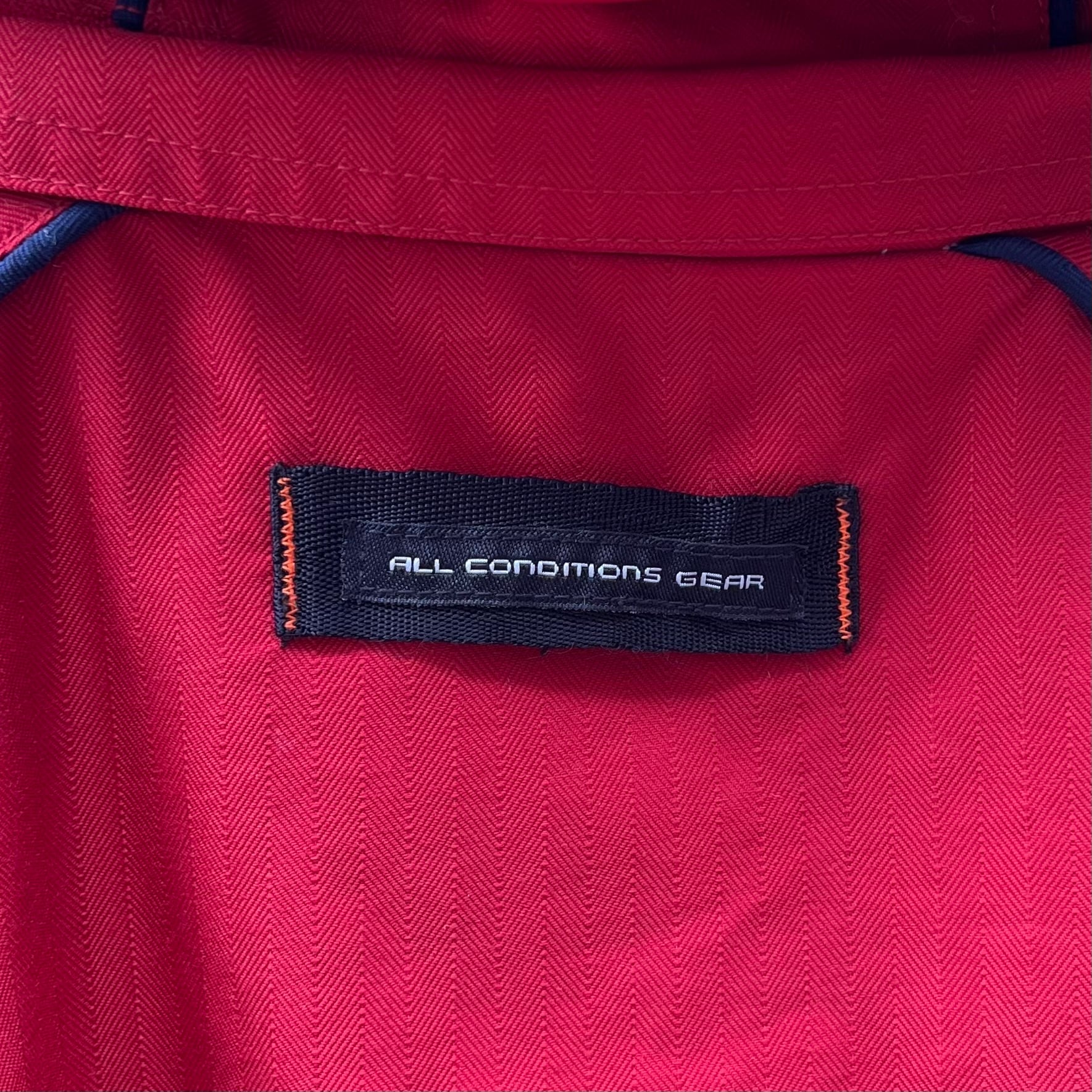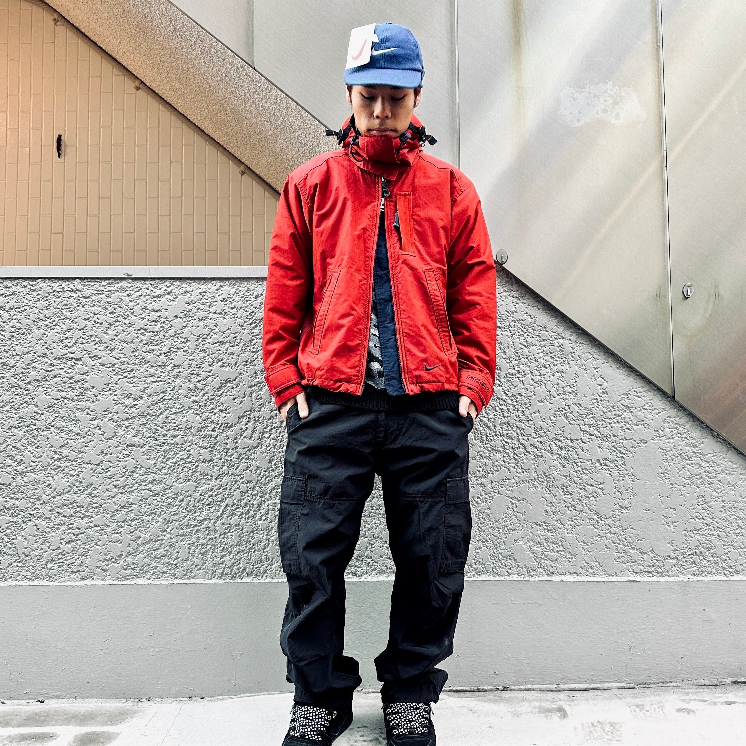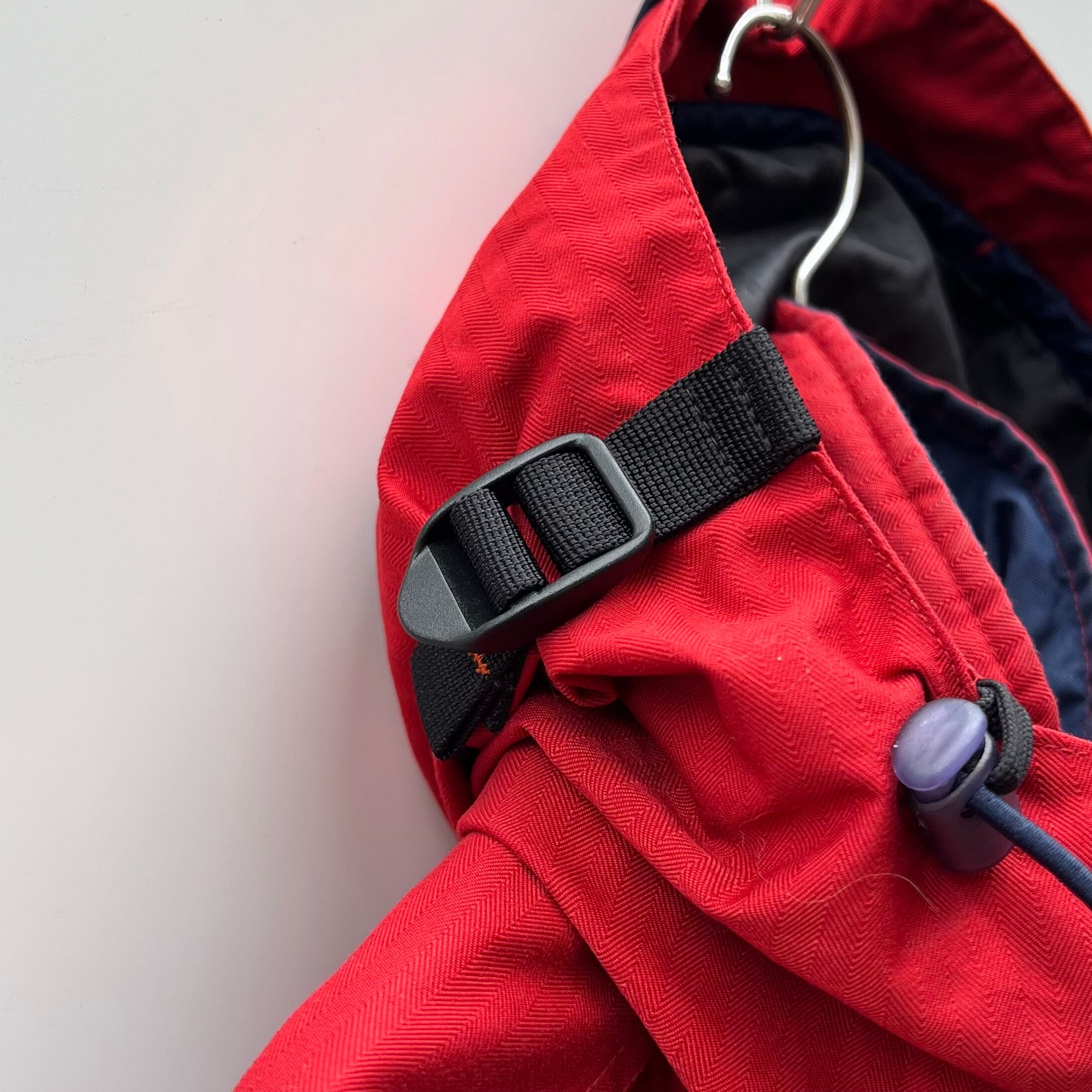 レッドxネイビーのナイロン素材、左裾にスウォッシュ刺繍、左袖カフスにACGロゴ刺繍、バック右裾にスウォッシュワッペン、左胸と両サイドにジッパー付きポケット、両サイドにマチ付きポケット、ロゴ入りジッパースライダー、ジッパーでフード脱着、裾にドローコードが付いたデザインです。